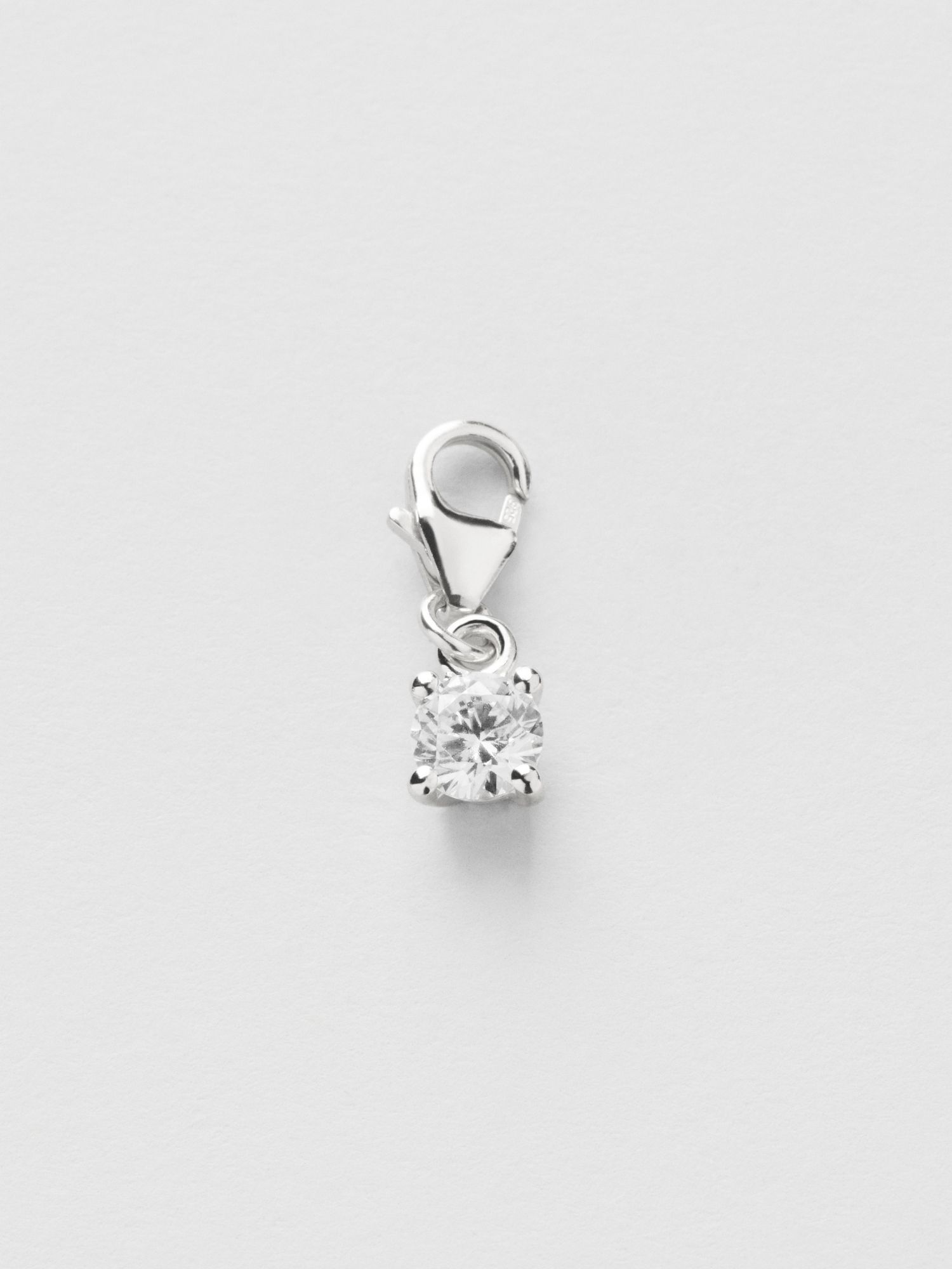 Charm with a clear Cubic Zirconia stone in genuine 925 sterling silver. The gold jewellery is plated with genuine 24K gold and has a core of genuine 925 sterling silver. This product is made from 100% recycled silver.