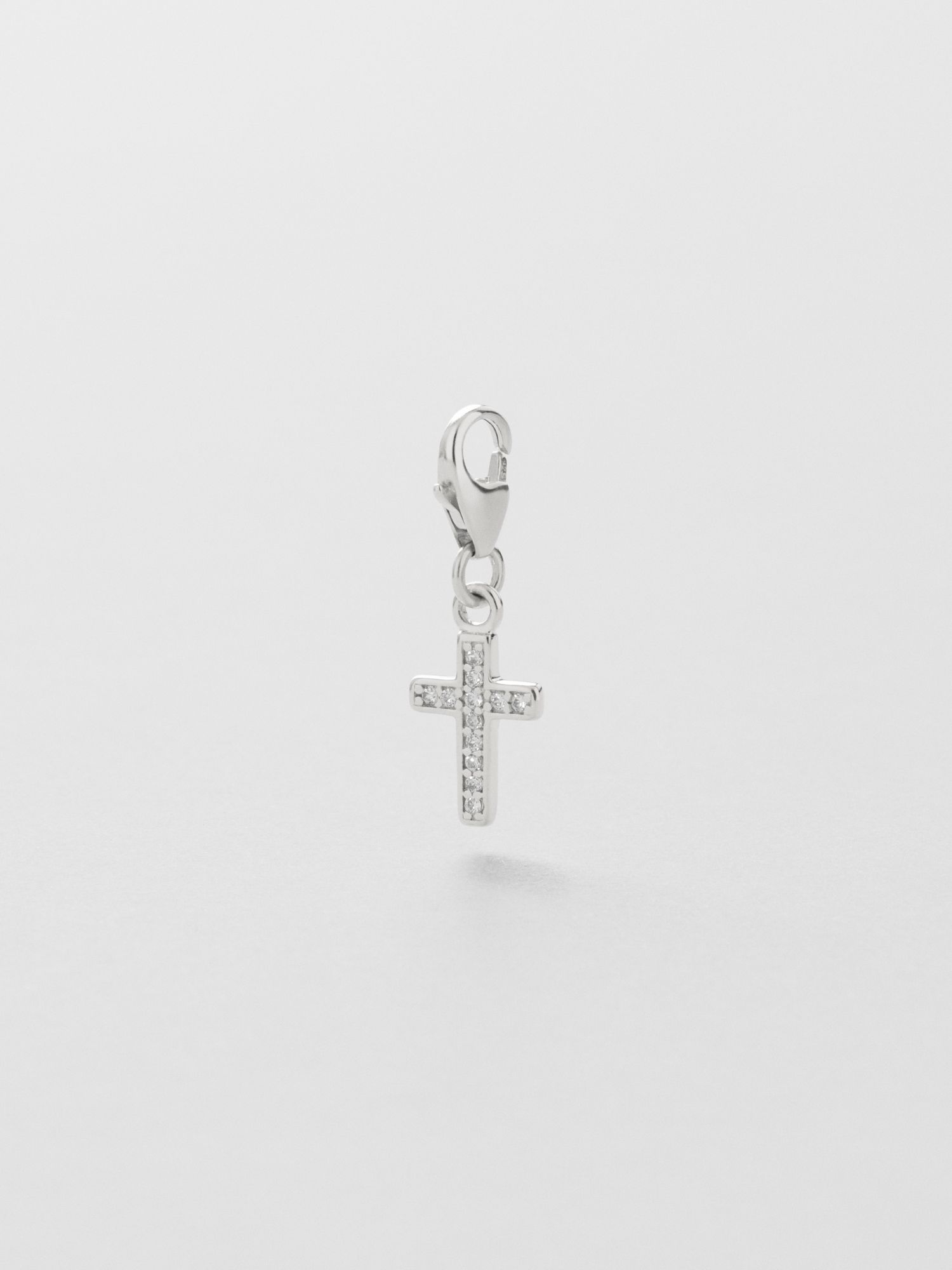 Charm in the shape of a cross in genuine 925 sterling silver, decorated with clear Cubic Zirconia stones. The gold jewellery is plated with genuine 24K gold and has a core of genuine 925 sterling silver. This product is made of 100% recycled silver.