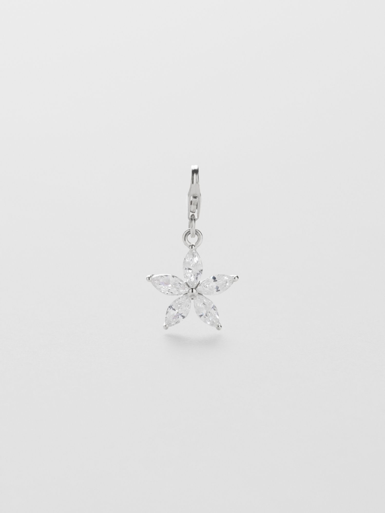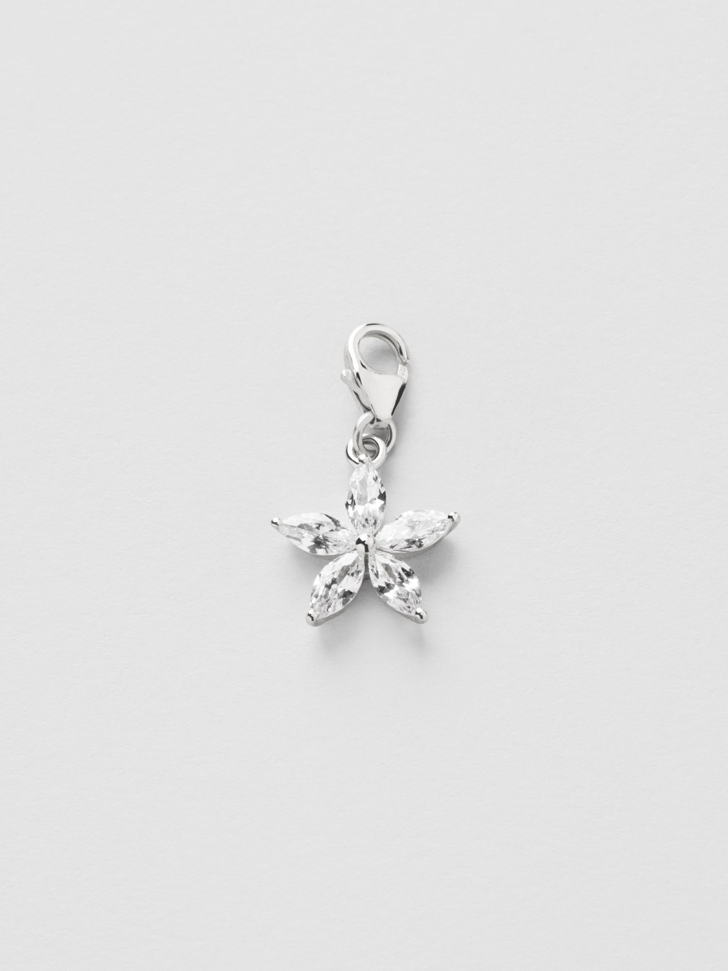 Charm with clear Cubic Zirconia stones in the shape of a flower in genuine 925 sterling silver. The gold jewellery is plated with genuine 24K gold and has a core of genuine 925 sterling silver. This product is made of 100% recycled silver.