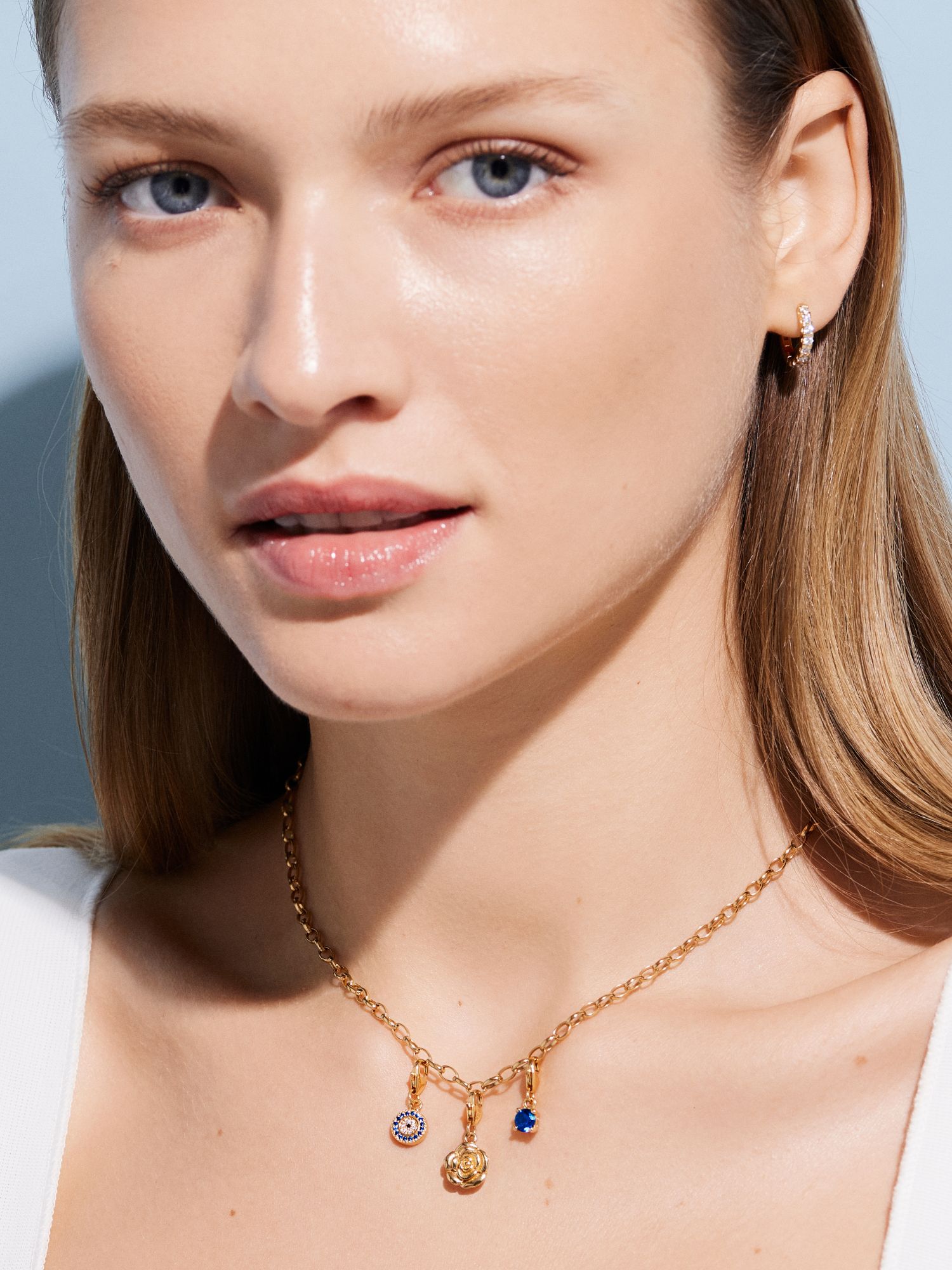 Charm in the shape of a protective eye in genuine 925 sterling silver, the eye is decorated with clear and blue Cubic Zirconia stones. The gold jewellery is plated with genuine 24K gold and has a core of genuine 925 sterling silver. This product is made of 100% recycled silver.