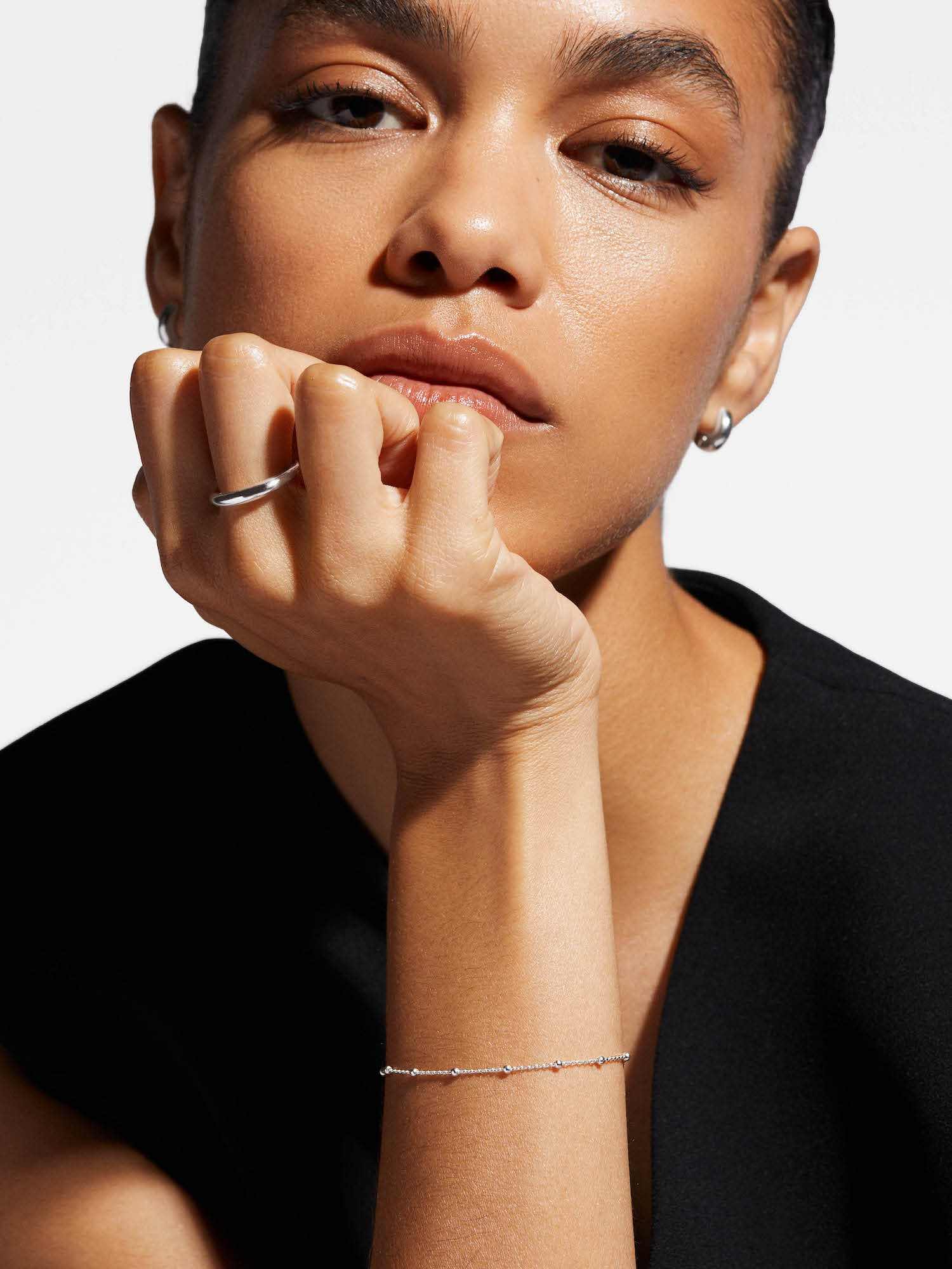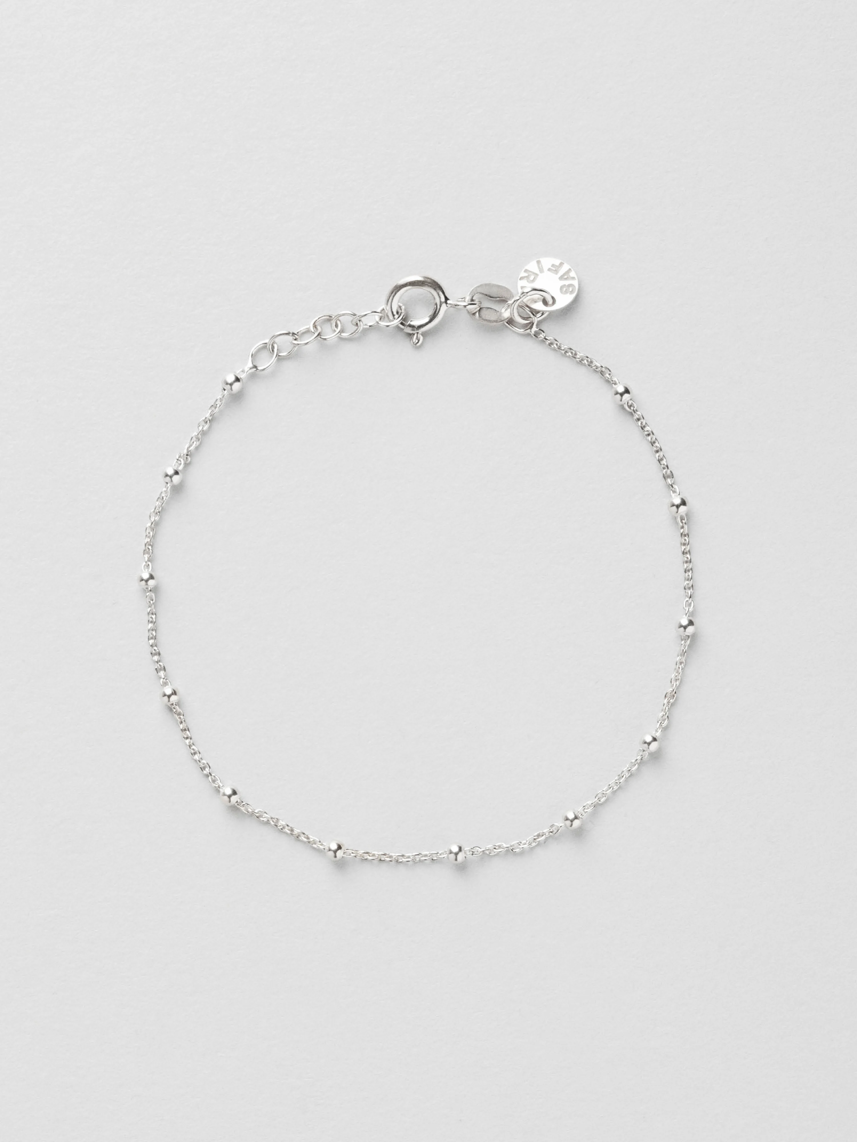 Chain bracelet with small beads in genuine 925 sterling silver. The gold bracelet is plated with genuine 18K gold and has a core of genuine 925 sterling silver. Today, more than 85% of our jewellery is made from recycled silver.