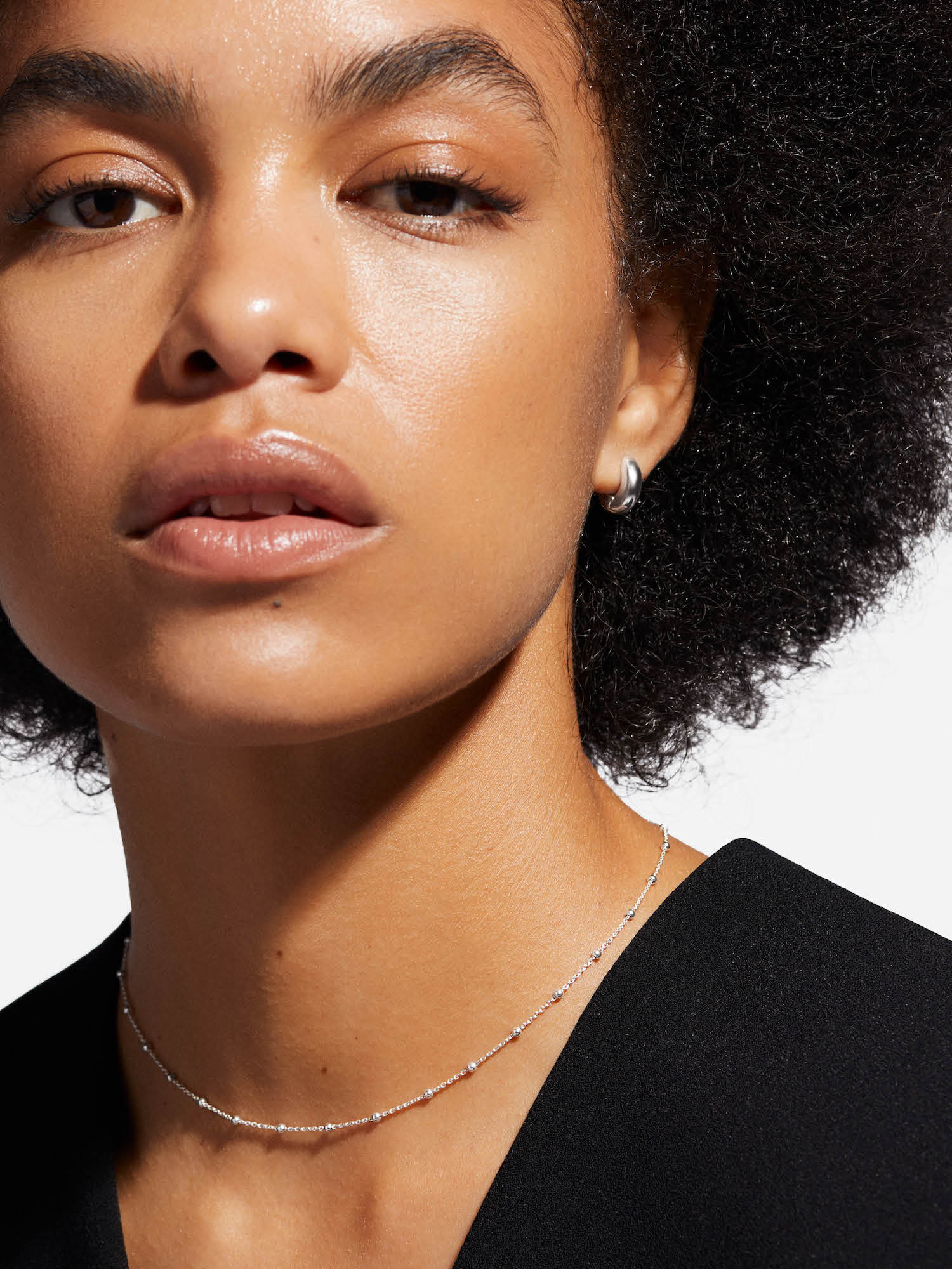 Choker chain with small beads in genuine 925 sterling silver. The gold necklace is plated with genuine 18K gold and has a core of genuine 925 sterling silver. Today, more than 85% of our jewellery is made from recycled silver.