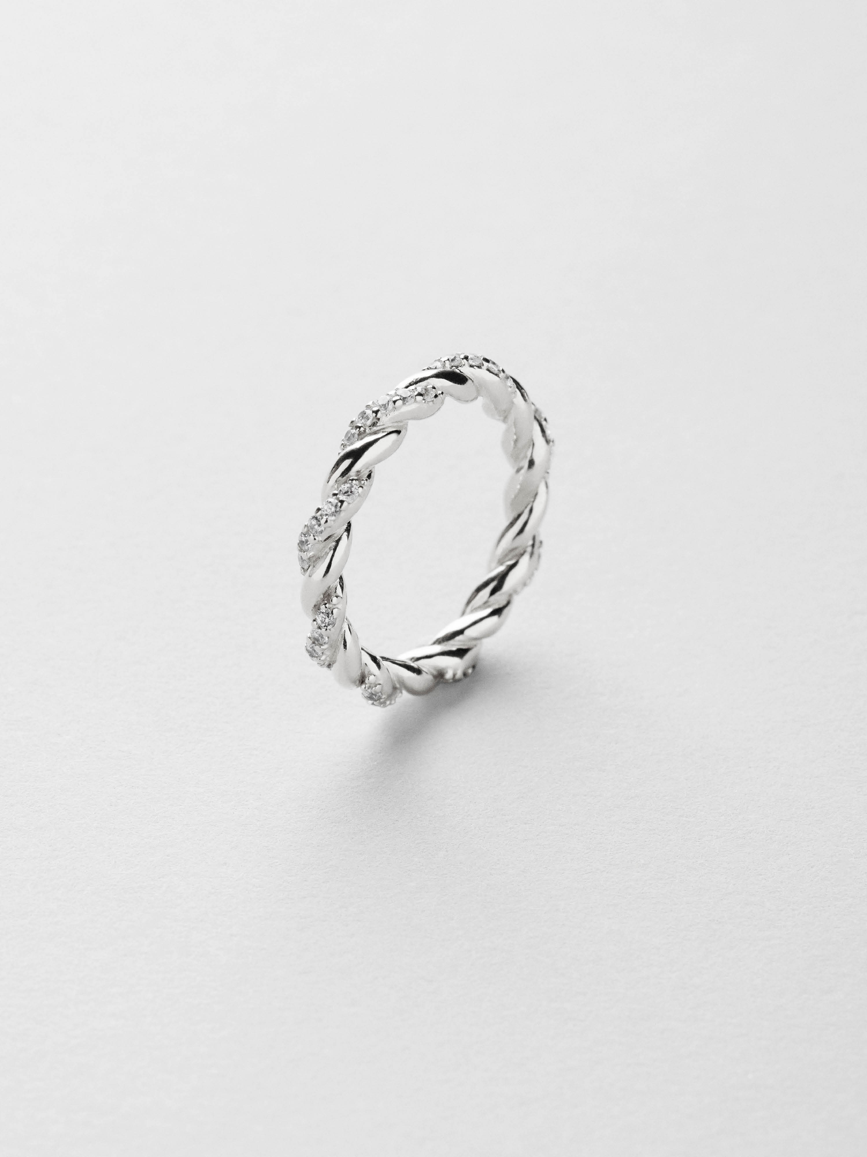 Twisted ring in genuine 925 sterling silver decorated with clear Cubic Zirconia stones. The gold ring is plated with genuine 24K gold and has a core of genuine 925 sterling silver. Today, more than 85% of our jewellery is made from recycled silver.