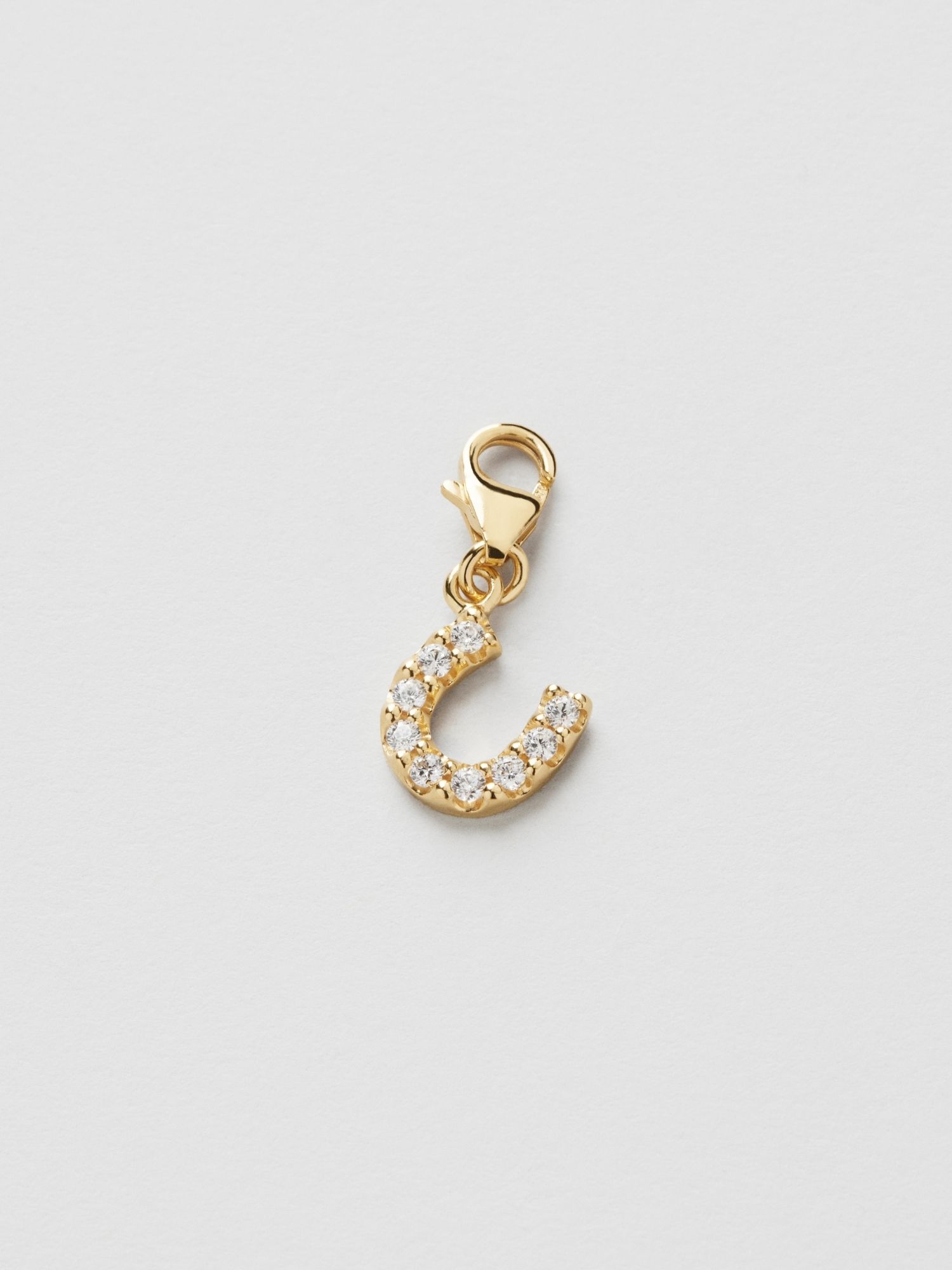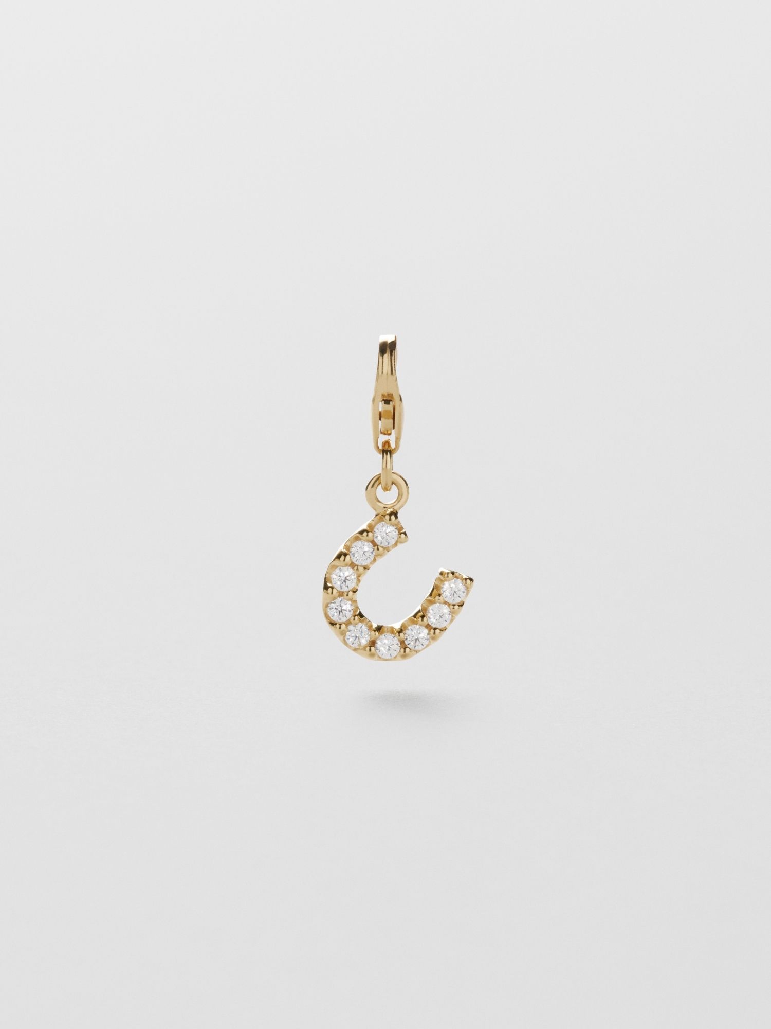 Charm in the shape of a horseshoe, decorated with clear Cubic Zirconia stones in genuine 925 sterling silver. The gold jewellery is gilded with genuine 24K gold and has a core of genuine 925 sterling silver. This product is made from 100% recycled silver.