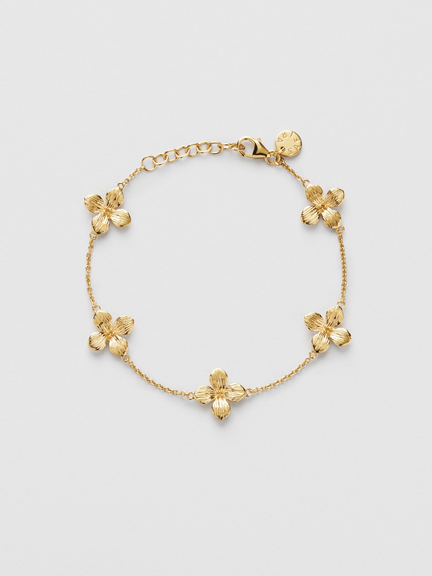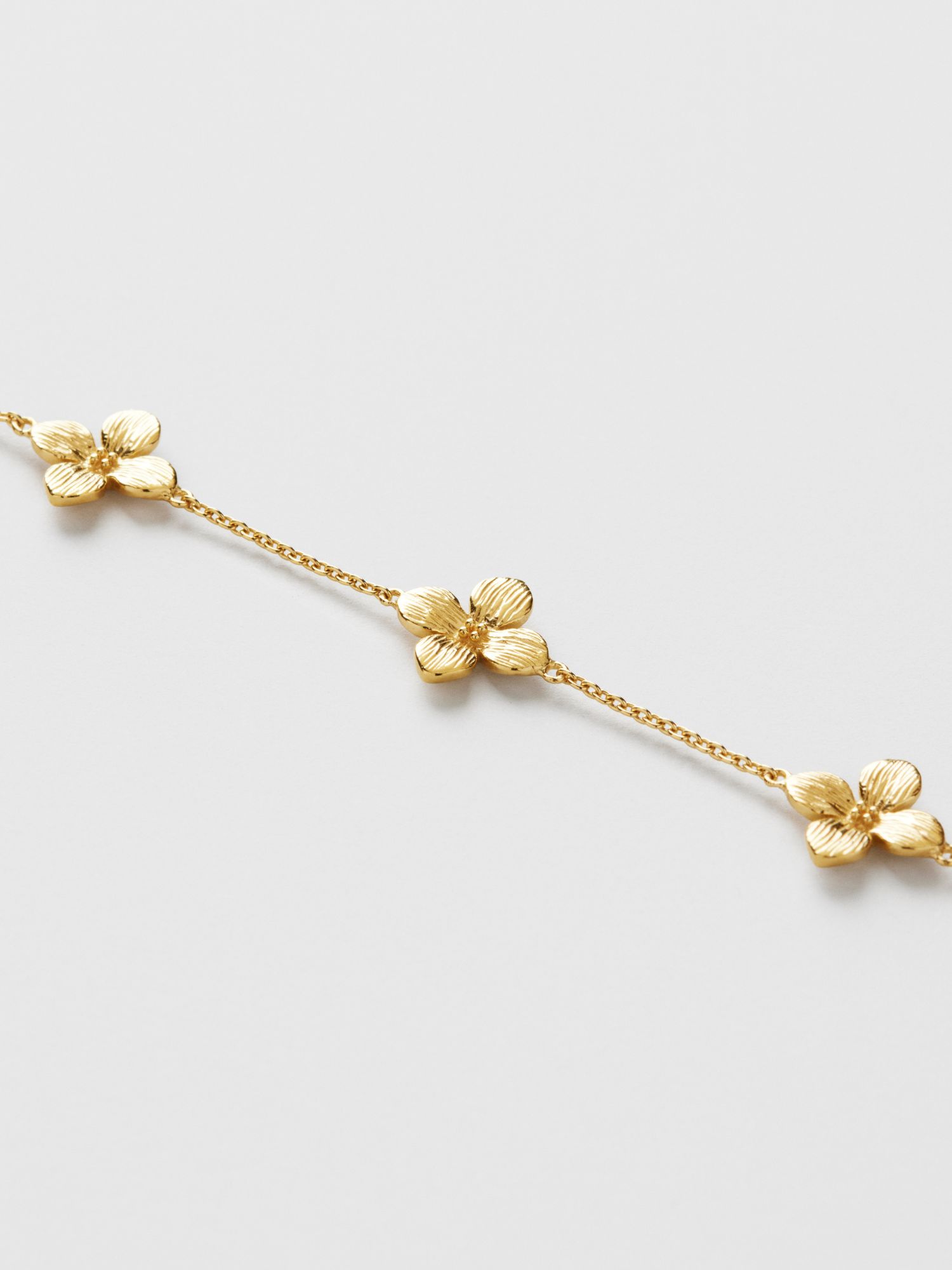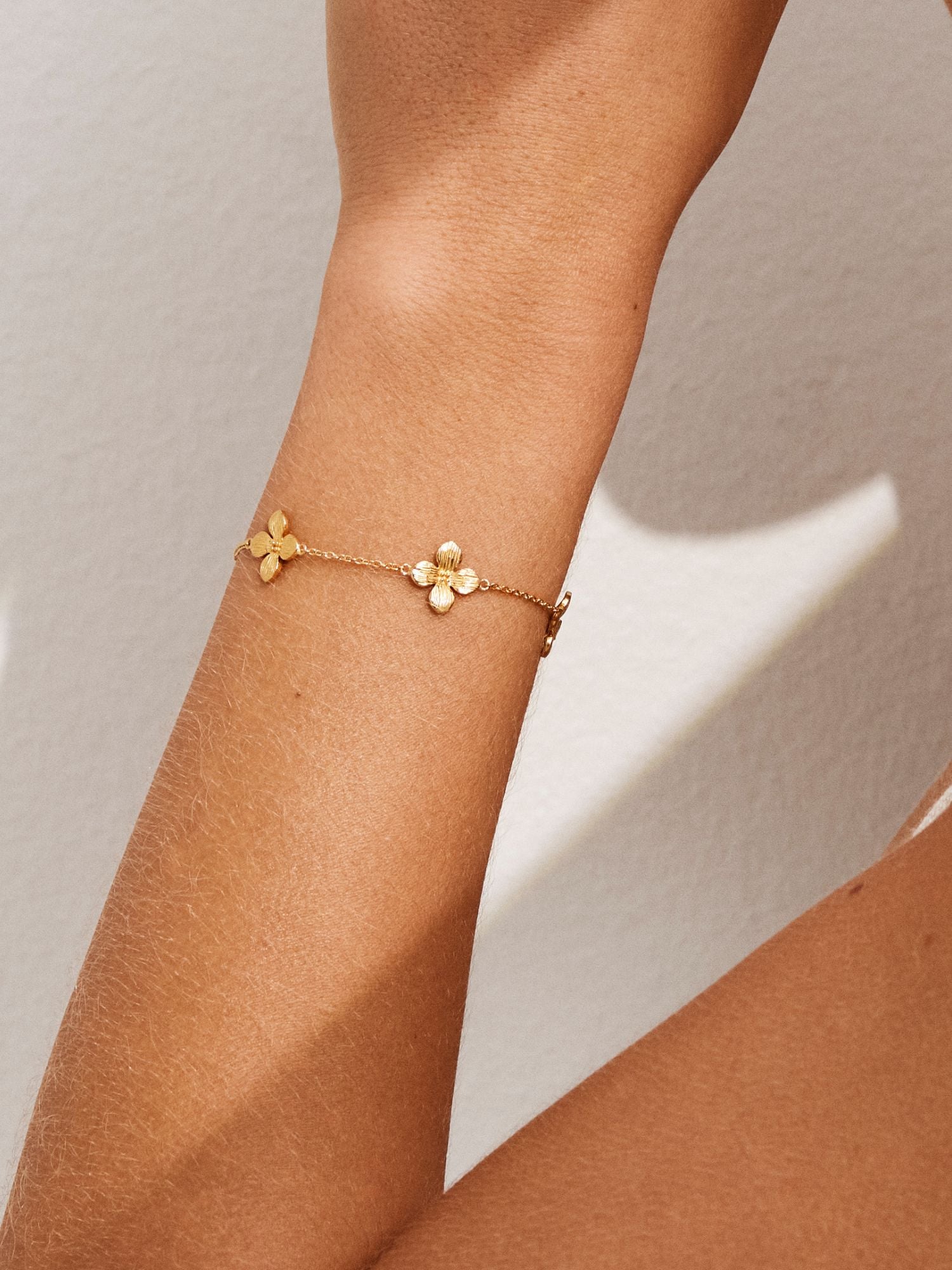 Flower bracelet in genuine 925 sterling silver with five petunia flowers. The gold bracelet is plated with genuine 24K gold and has a core of genuine 925 sterling silver. This product is made from 100% recycled silver.