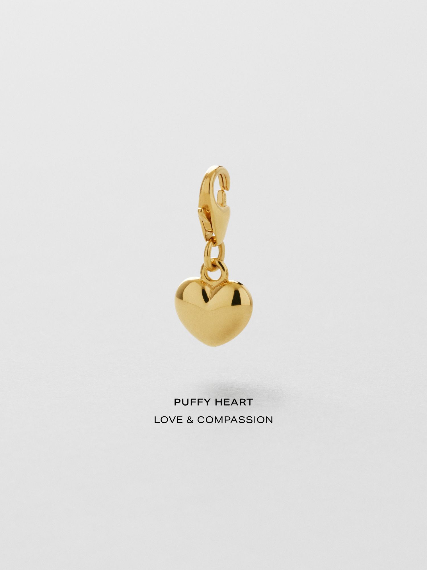 Charm in the shape of a pufft heart in genuine 925 sterling silver. The gold jewellery is plated with genuine 24K gold and has a core of genuine 925 sterling silver. This product is made of 100% recycled silver.
