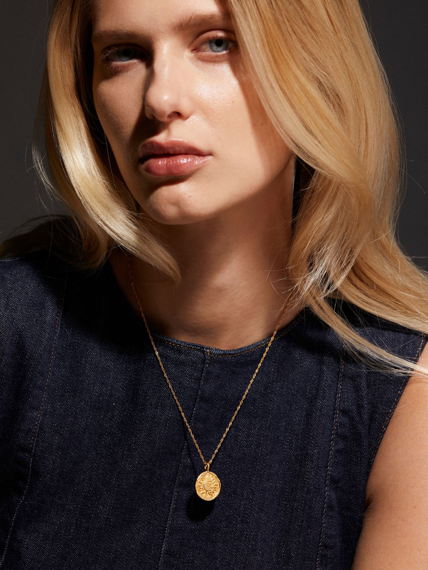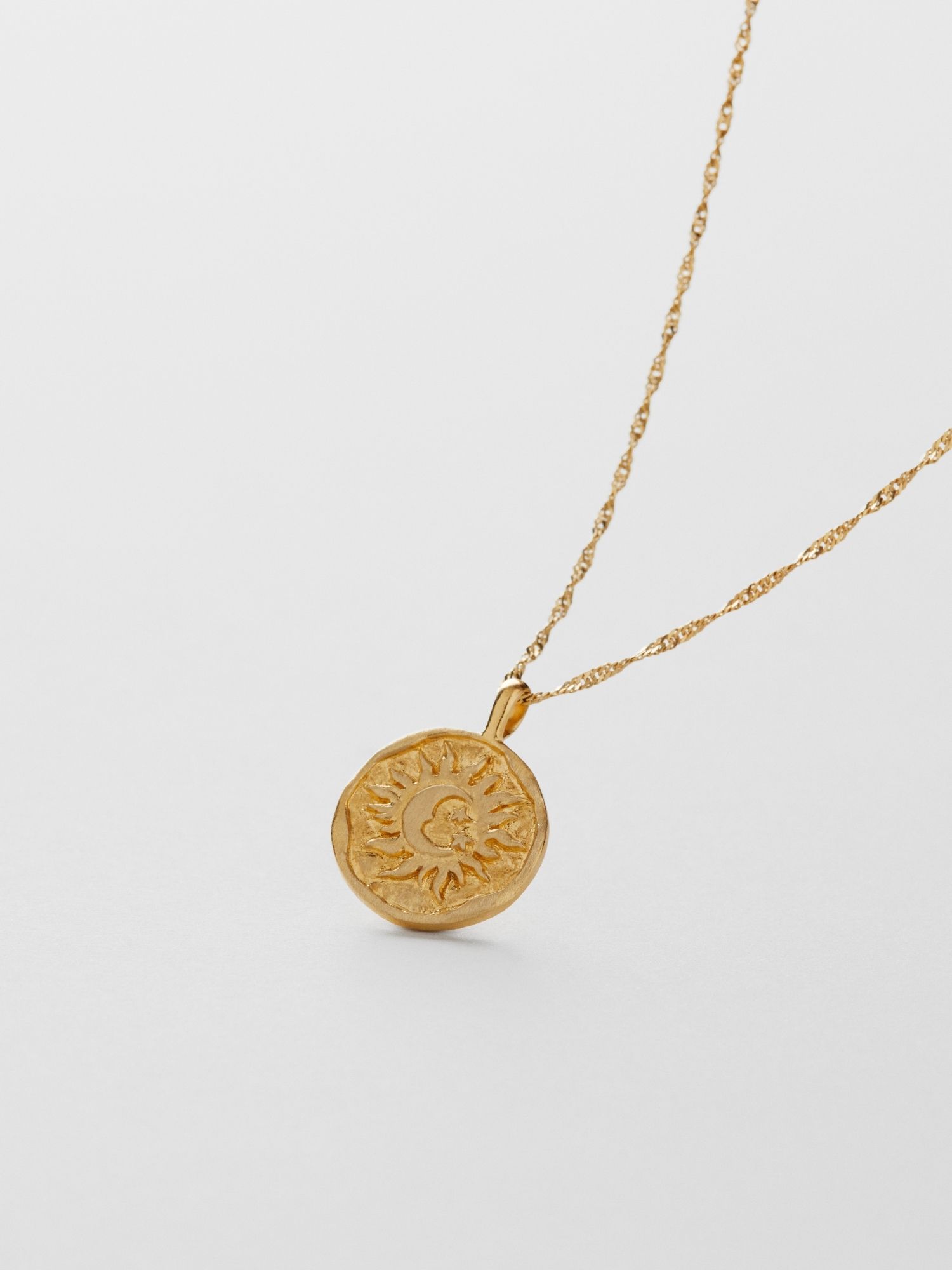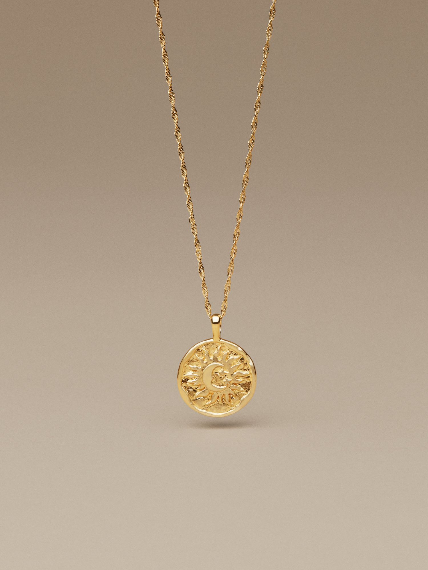 Necklace with a Singapore chain and a round amulet in genuine 925 sterling silver. The amulet features both a moon and a sun. The gold necklace is gilded with genuine 24K gold and has a core of genuine 925 sterling silver. This product is made from 100% recycled silver.
