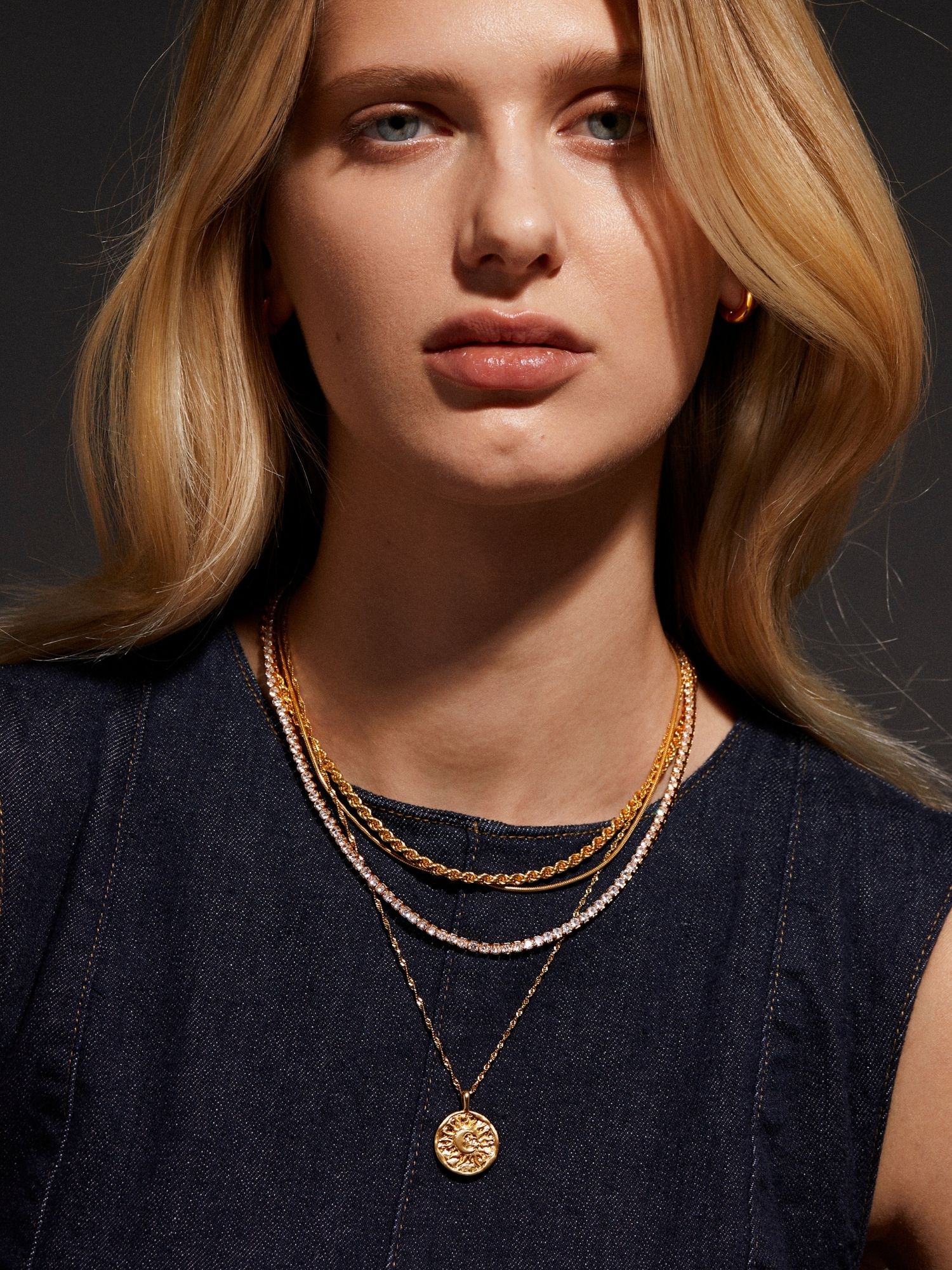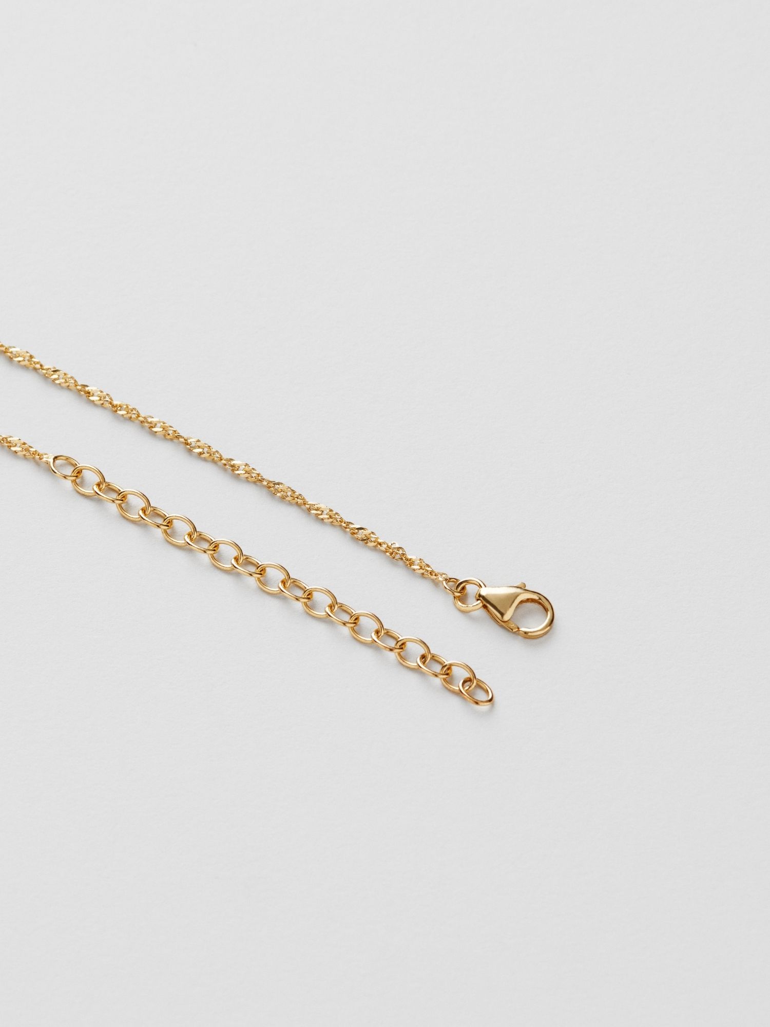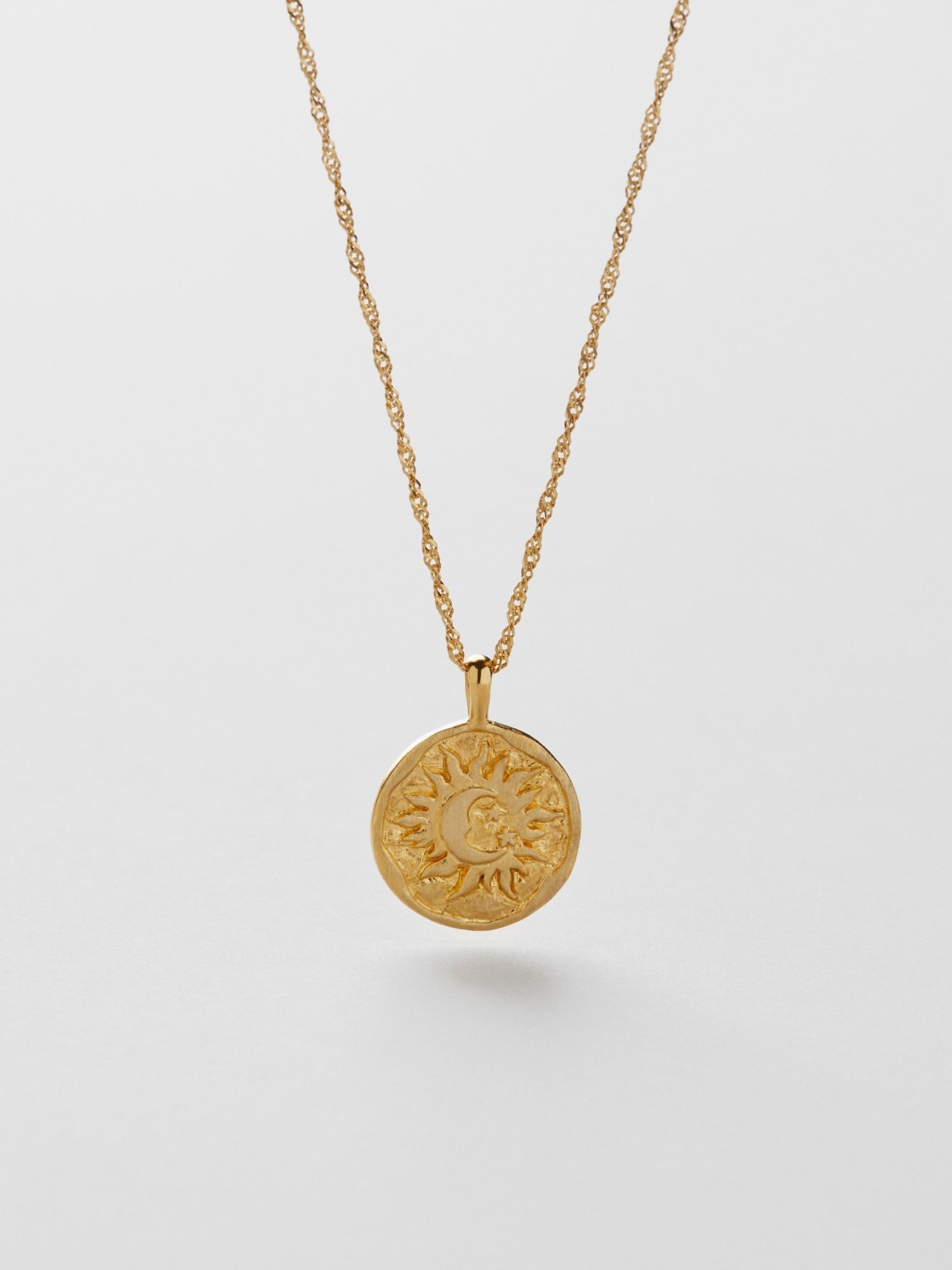 Necklace with a Singapore chain and a round amulet in genuine 925 sterling silver. The amulet features both a moon and a sun. The gold necklace is gilded with genuine 24K gold and has a core of genuine 925 sterling silver. This product is made from 100% recycled silver.