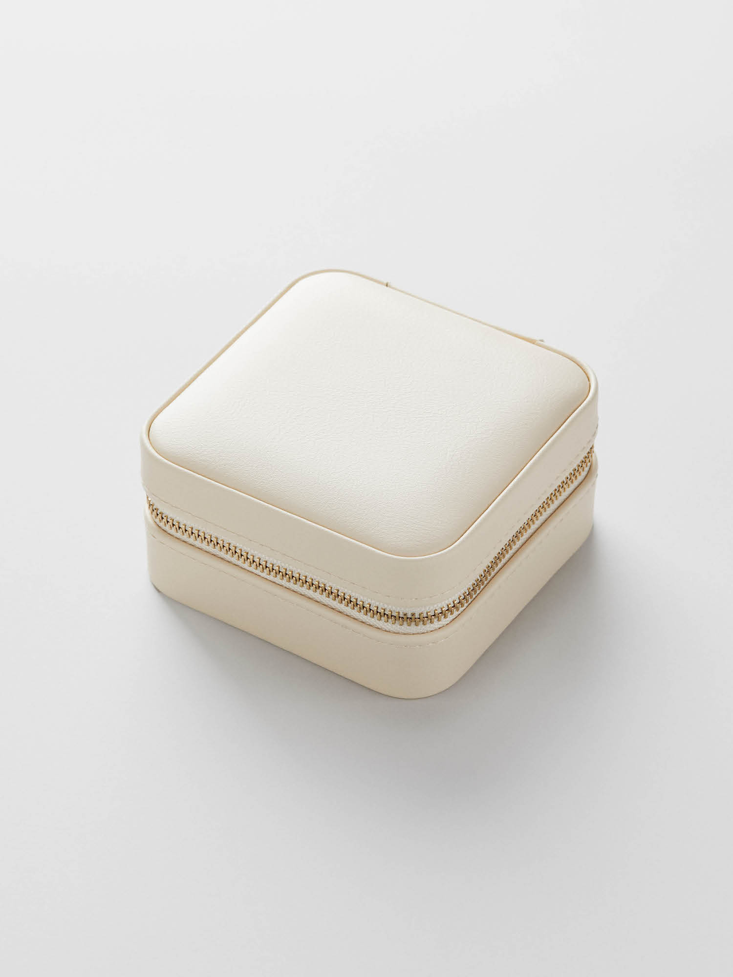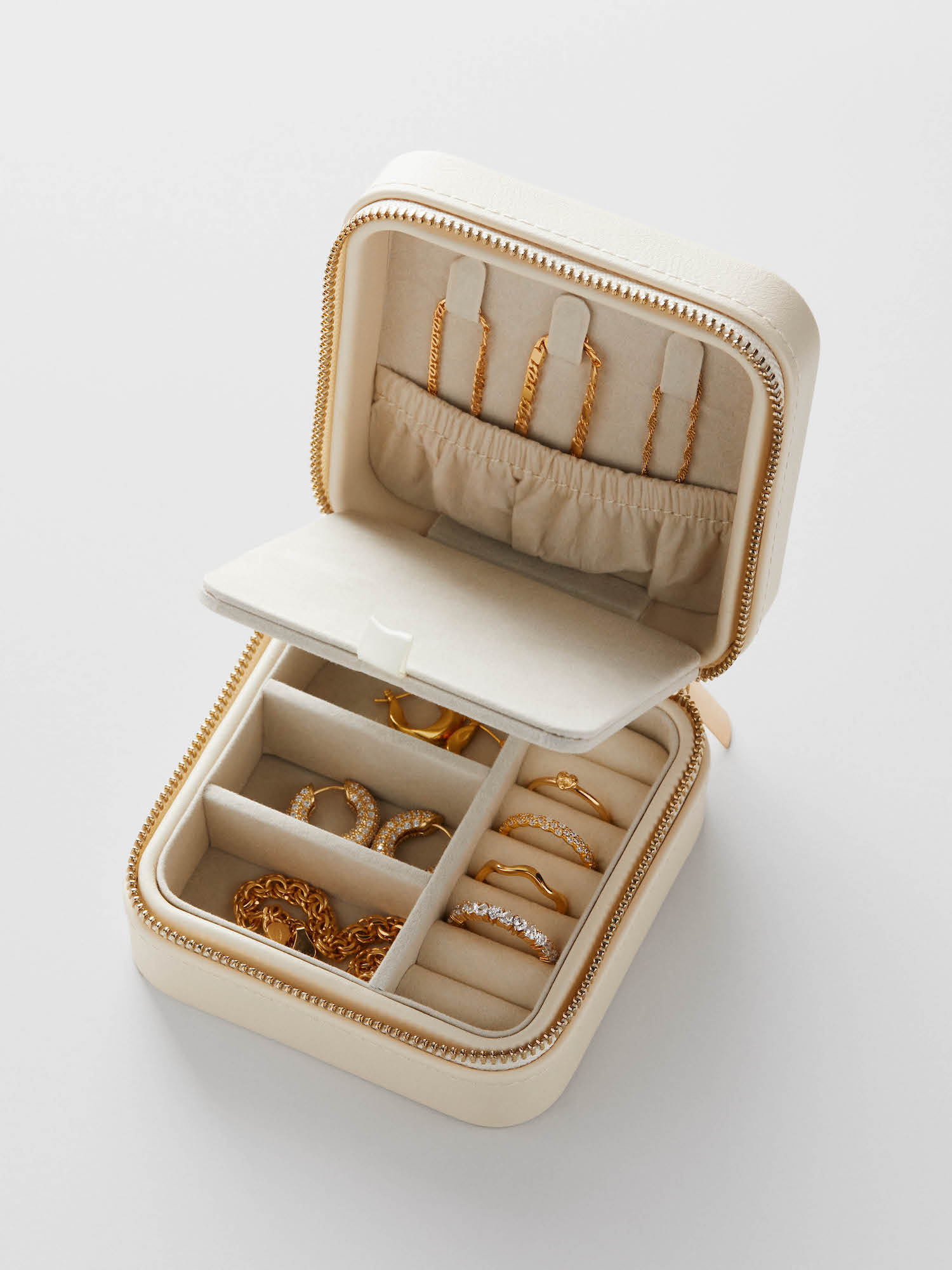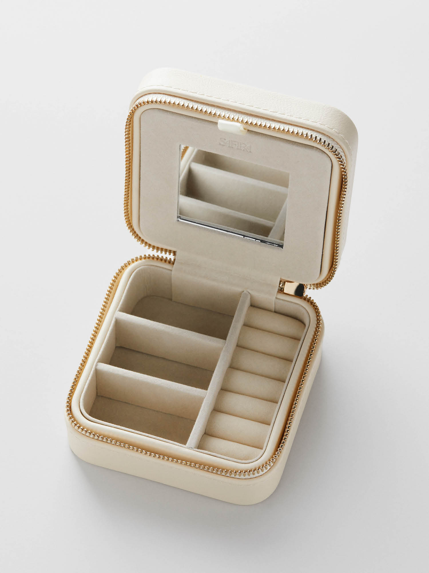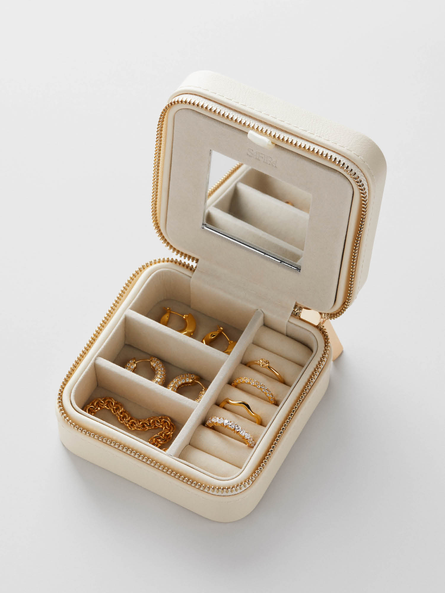 Travel jewellery box in vegan leather in a beige shade. Perfect for storing and organizing your jewellery - whether at home or while traveling. It features practical hooks for hanging your necklaces, pockets designed for various types of jewellery, and a mirror.