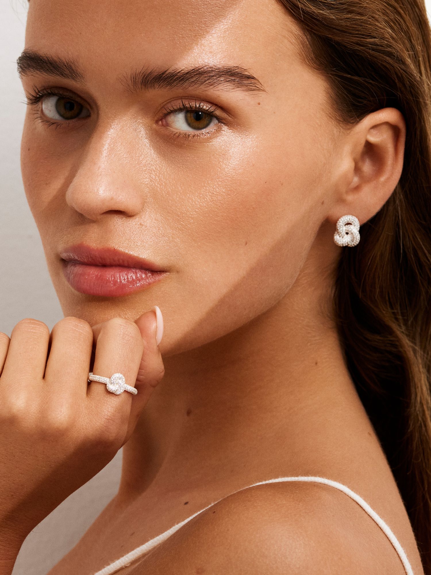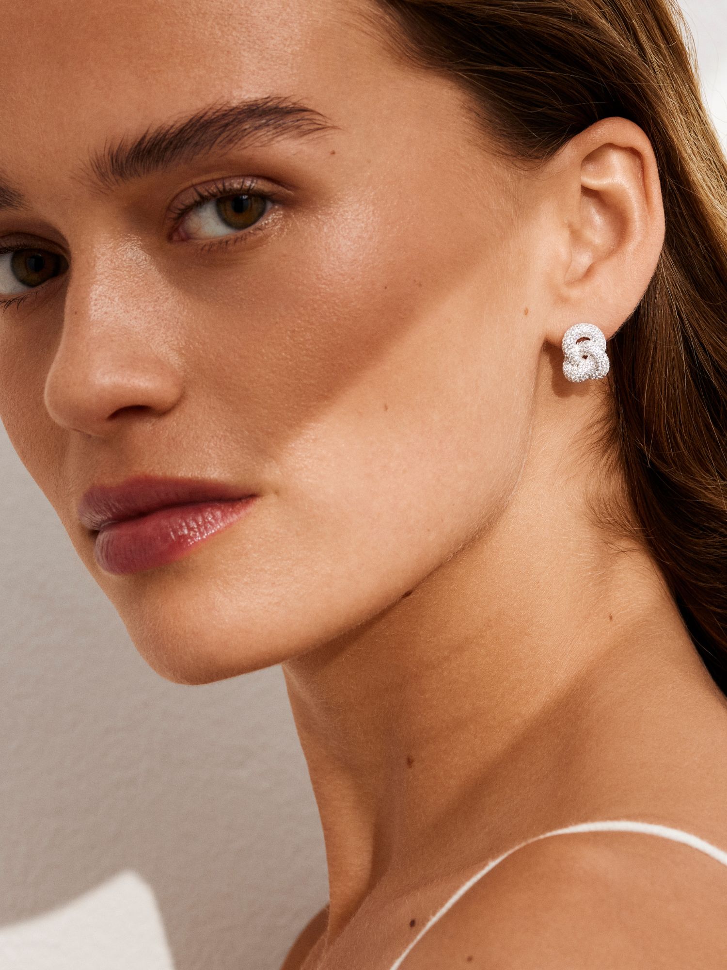 Knot earrings in genuine 925 sterling silver, decorated with clear Cubic Zirconia stones. The gold earrings are plated with genuine 24K gold and has a core of genuine 925 sterling silver. This product is made from 100% recycled silver.