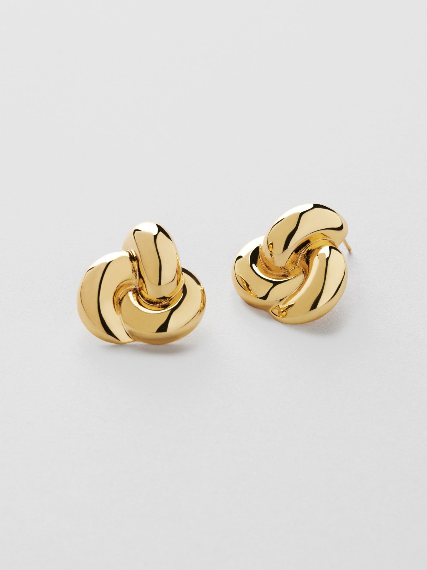 Knot shaped stud earrings plated with genuine 925 sterling silver or with genuine 18K gold. The core is made of brass. This product is made from 100% recycled material.
