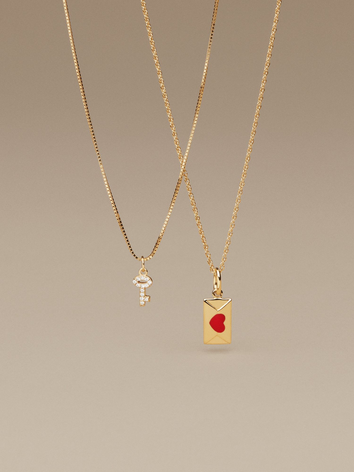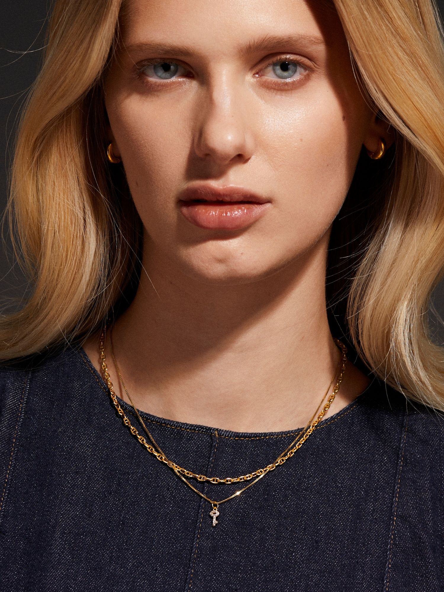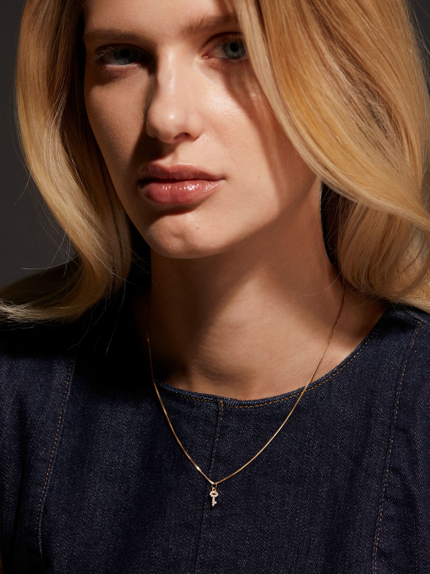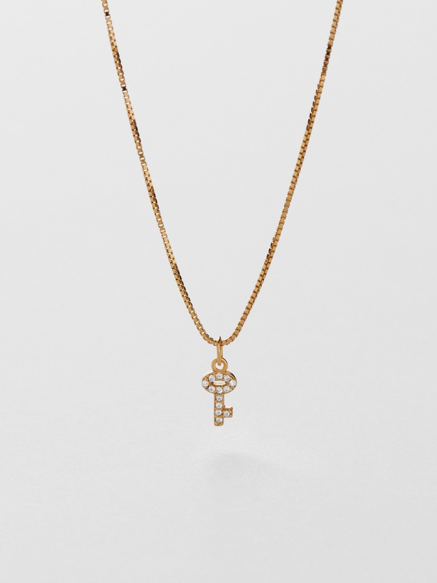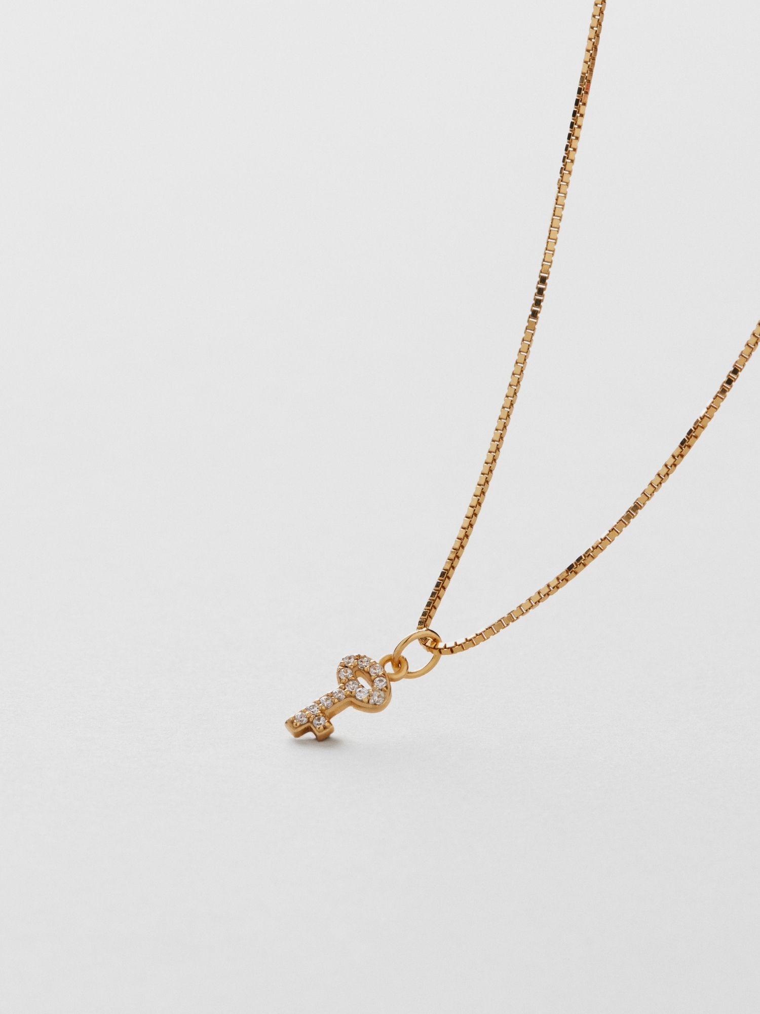 Necklace with a small key in genuine 925 sterling silver. The key is decorated with clear Cubic Zirconia stones in a pavé setting. The gold necklace is gilded with genuine 18K gold and has a core of genuine 925 sterling silver. This product is made from 88.22% recycled silver.