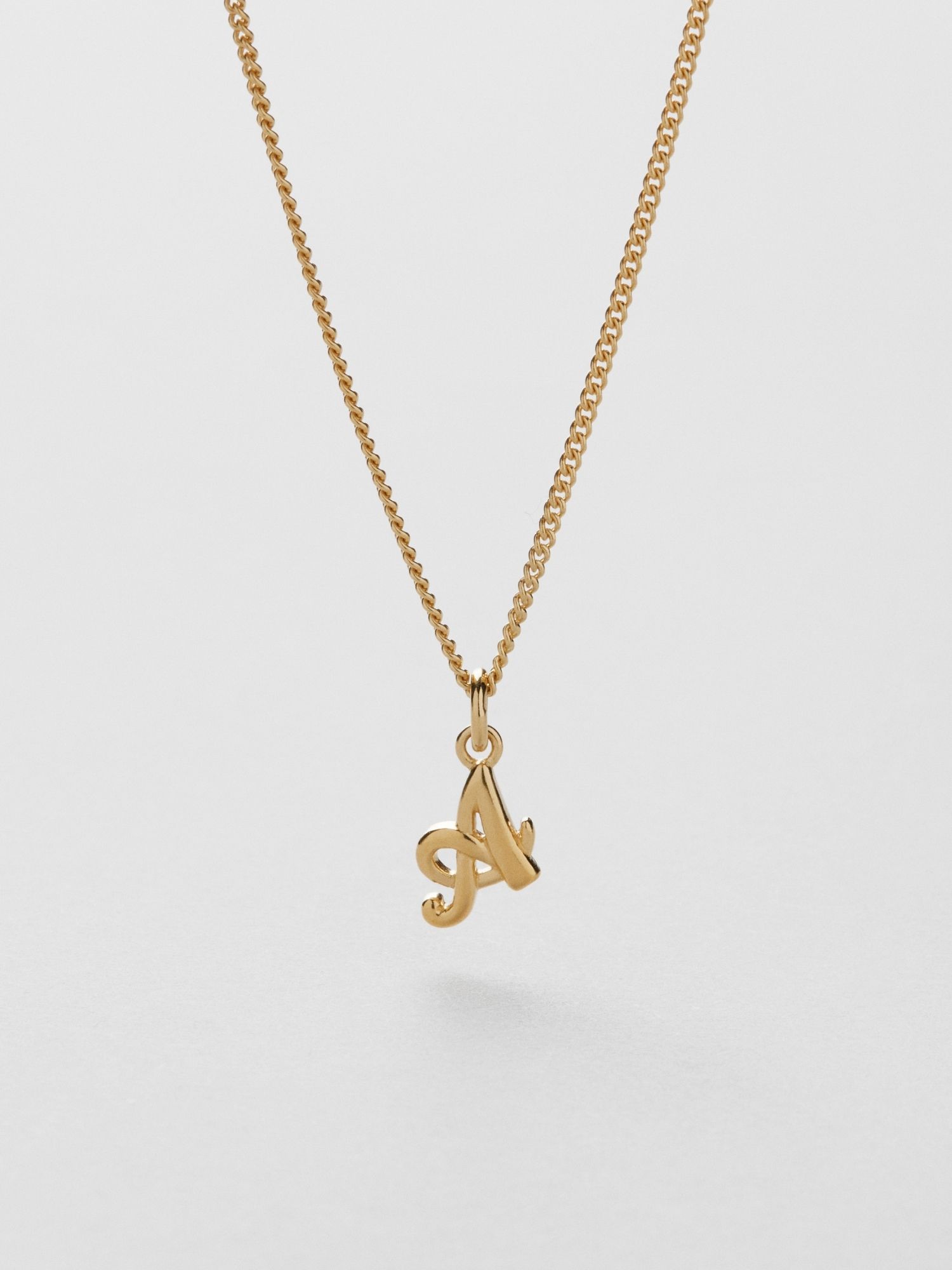 Bokstavshalsband med ett kursivt A i äkta 925 sterling silver. Guldhalsbandet är förgyllt med äkta 18K guld och har en kärna av äkta 925 sterling silver. Denna produkt är tillverkad av 100 % återvunnet silver.