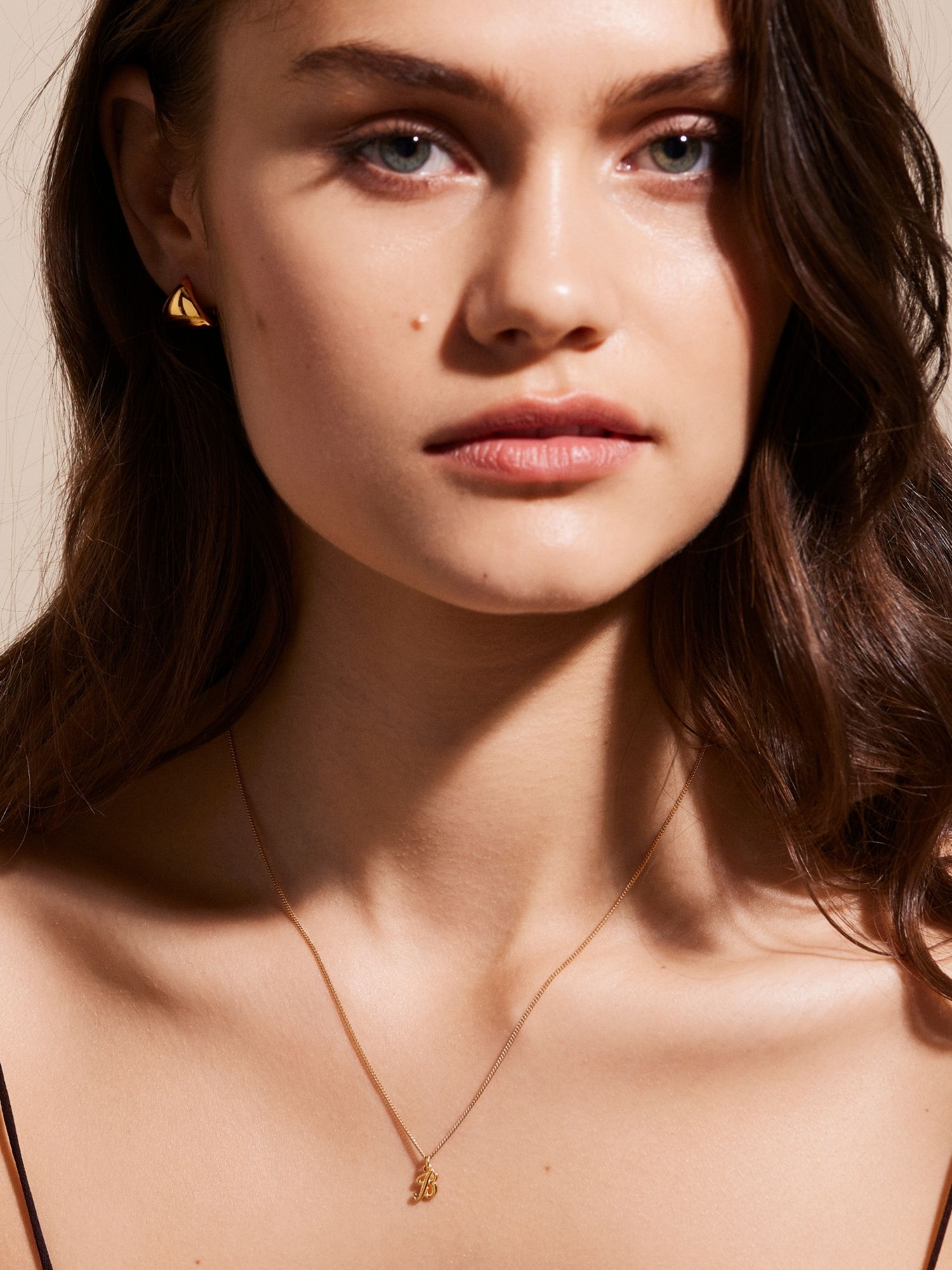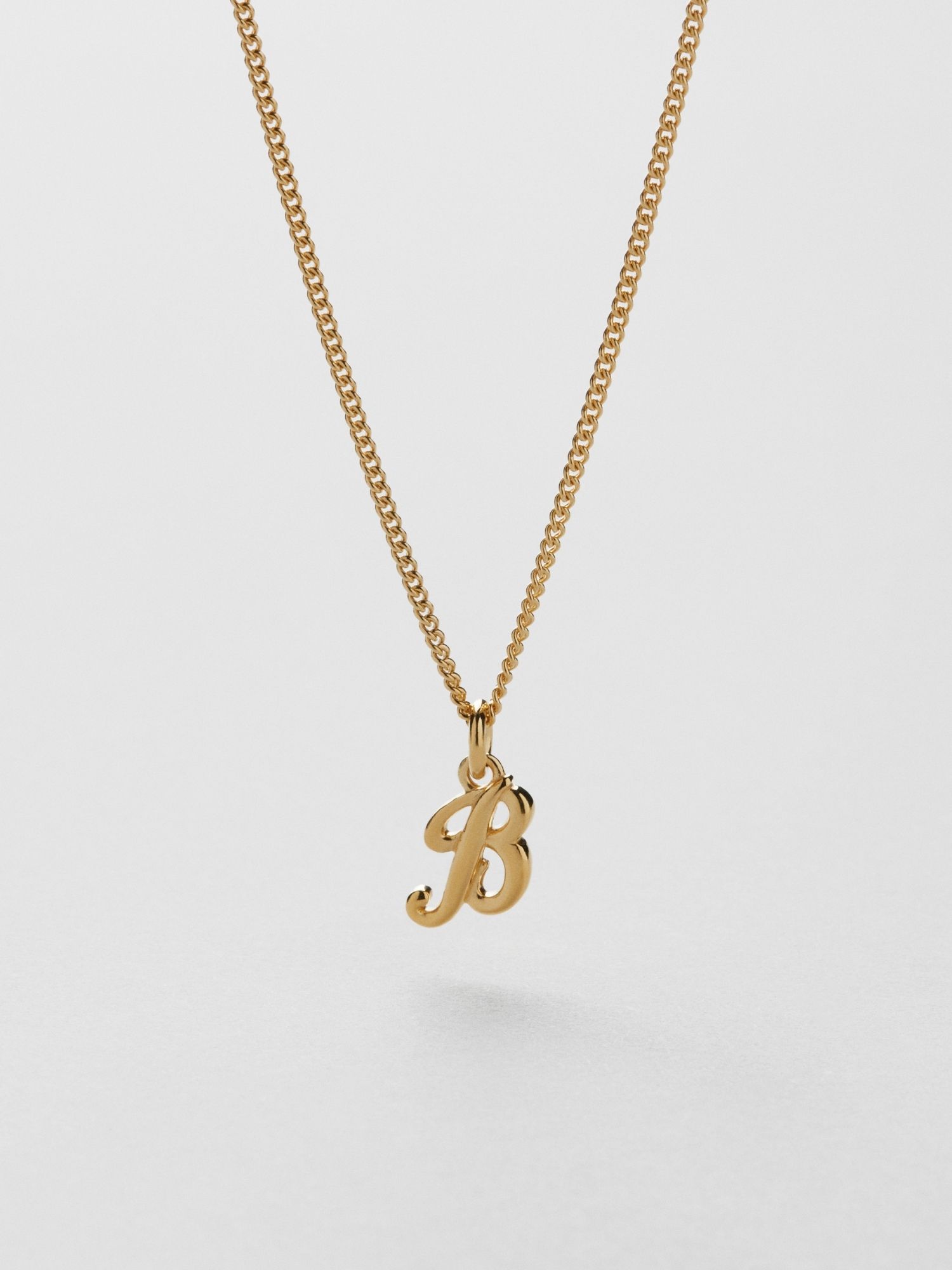 Bokstavshalsband med ett kursivt B i äkta 925 sterling silver. Guldhalsbandet är förgyllt med äkta 18K guld och har en kärna av äkta 925 sterling silver. Denna produkt är tillverkad av 100 % återvunnet silver.