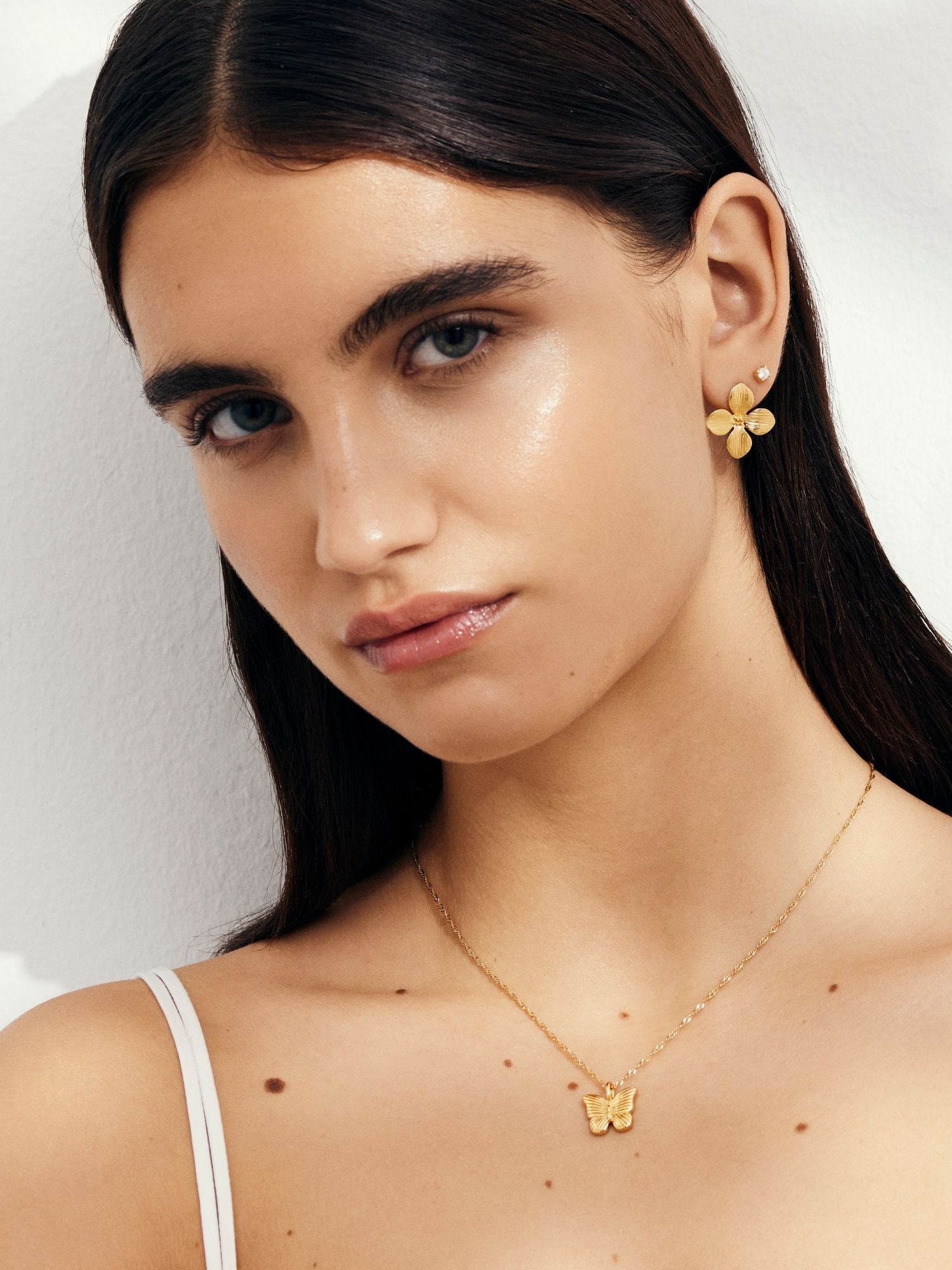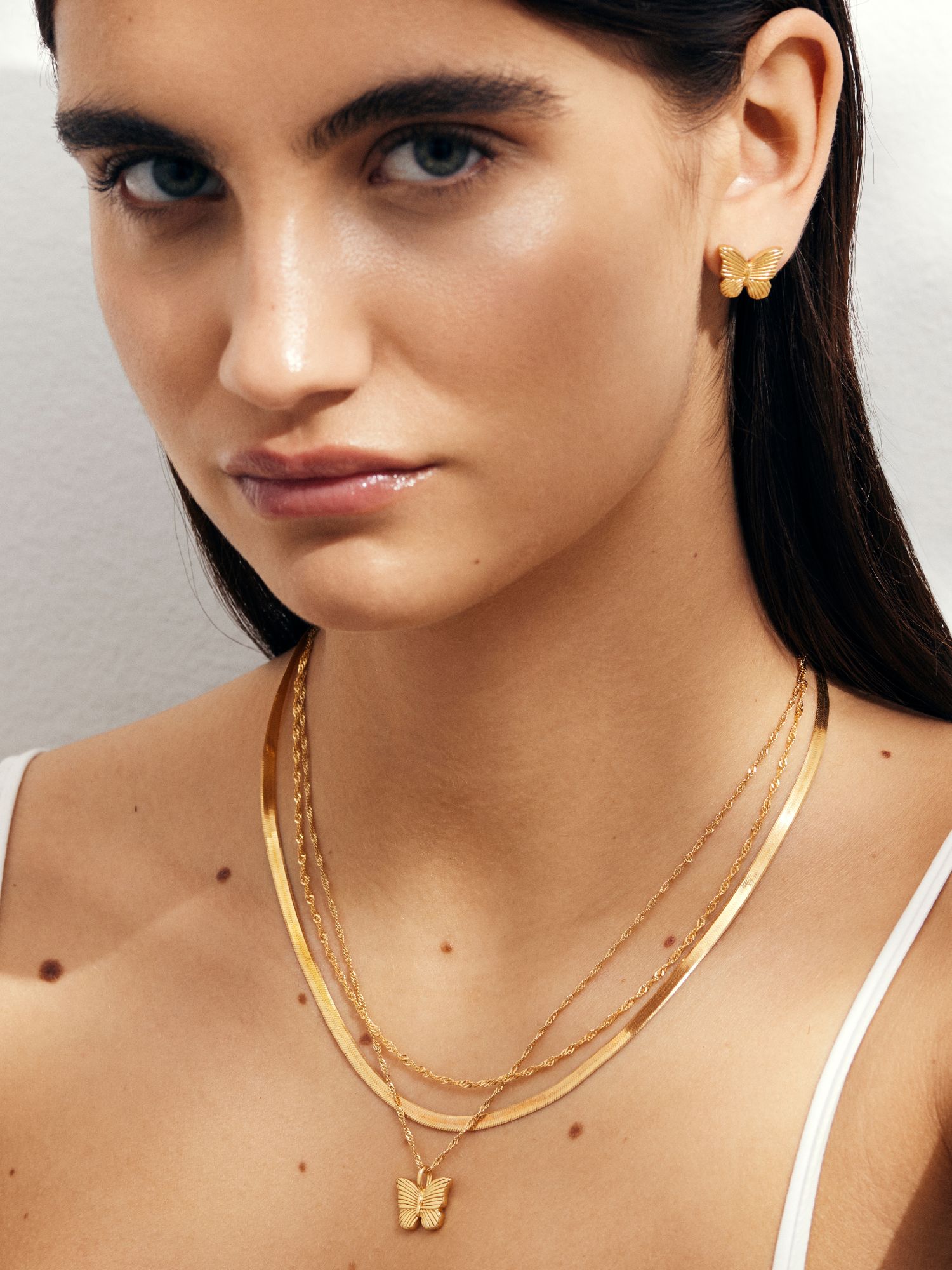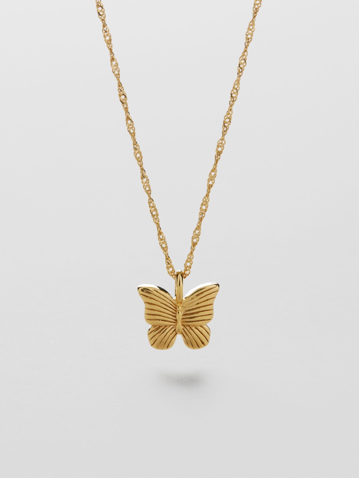 Halsband i singaporekedja med en fjäril i randigt mönster av äkta 925 sterling silver. Guldhalsbandet är förgyllt med äkta 24K guld och har en kärna av äkta 925 sterling silver. Denna produkt är tillverkad av 100% återvunnet silver.