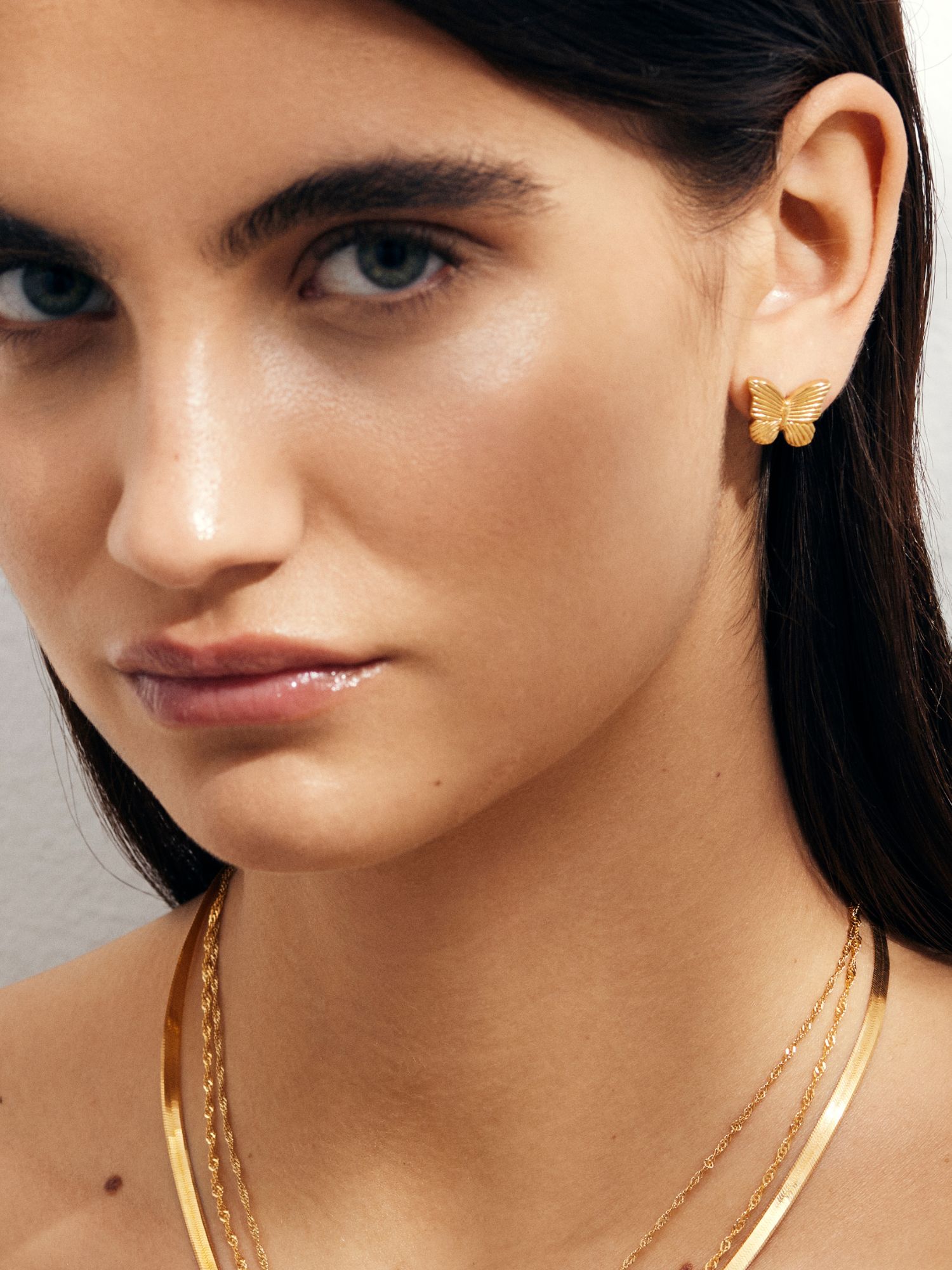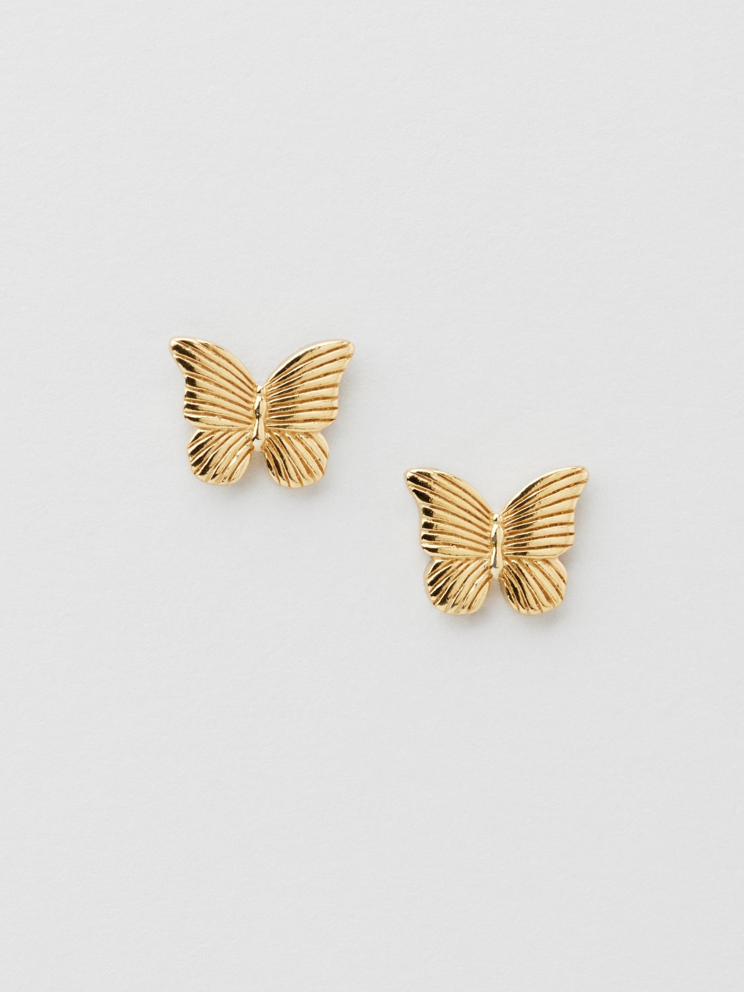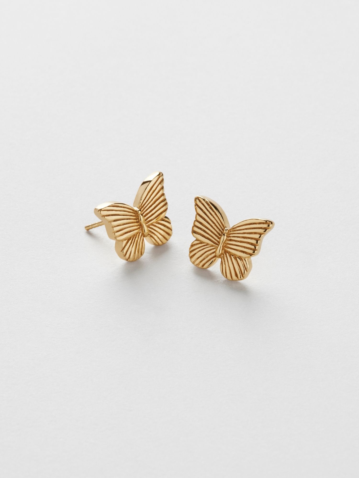 Studs örhängen i en fjäril-design med randigt mönster, i äkta 925 sterling silver. Guldörhängena är förgyllda med äkta 24K guld och har en kärna av äkta 925 sterling silver. Denna produkt är tillverkad av 100% återvunnet silver.