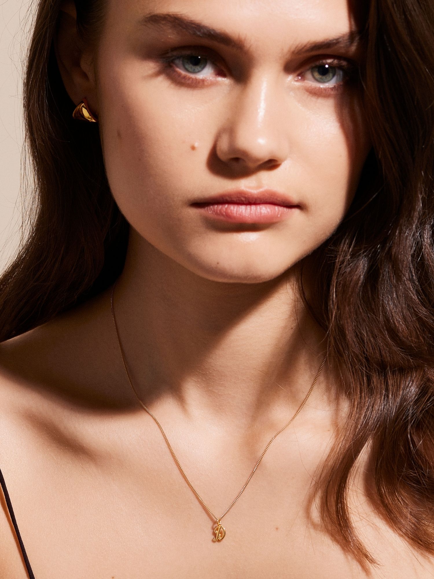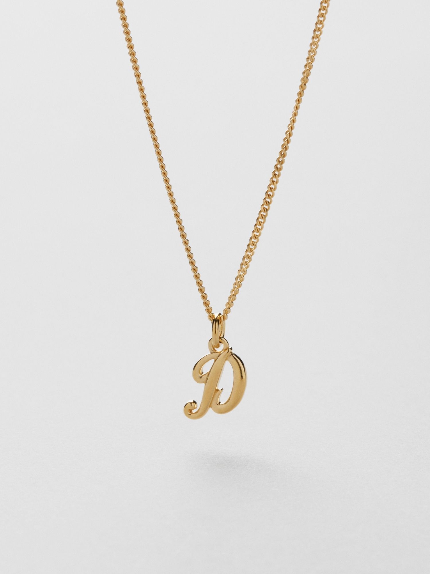 Bokstavshalsband med ett kursivt D i äkta 925 sterling silver. Guldhalsbandet är förgyllt med äkta 18K guld och har en kärna av äkta 925 sterling silver. Denna produkt är tillverkad av 100 % återvunnet silver.