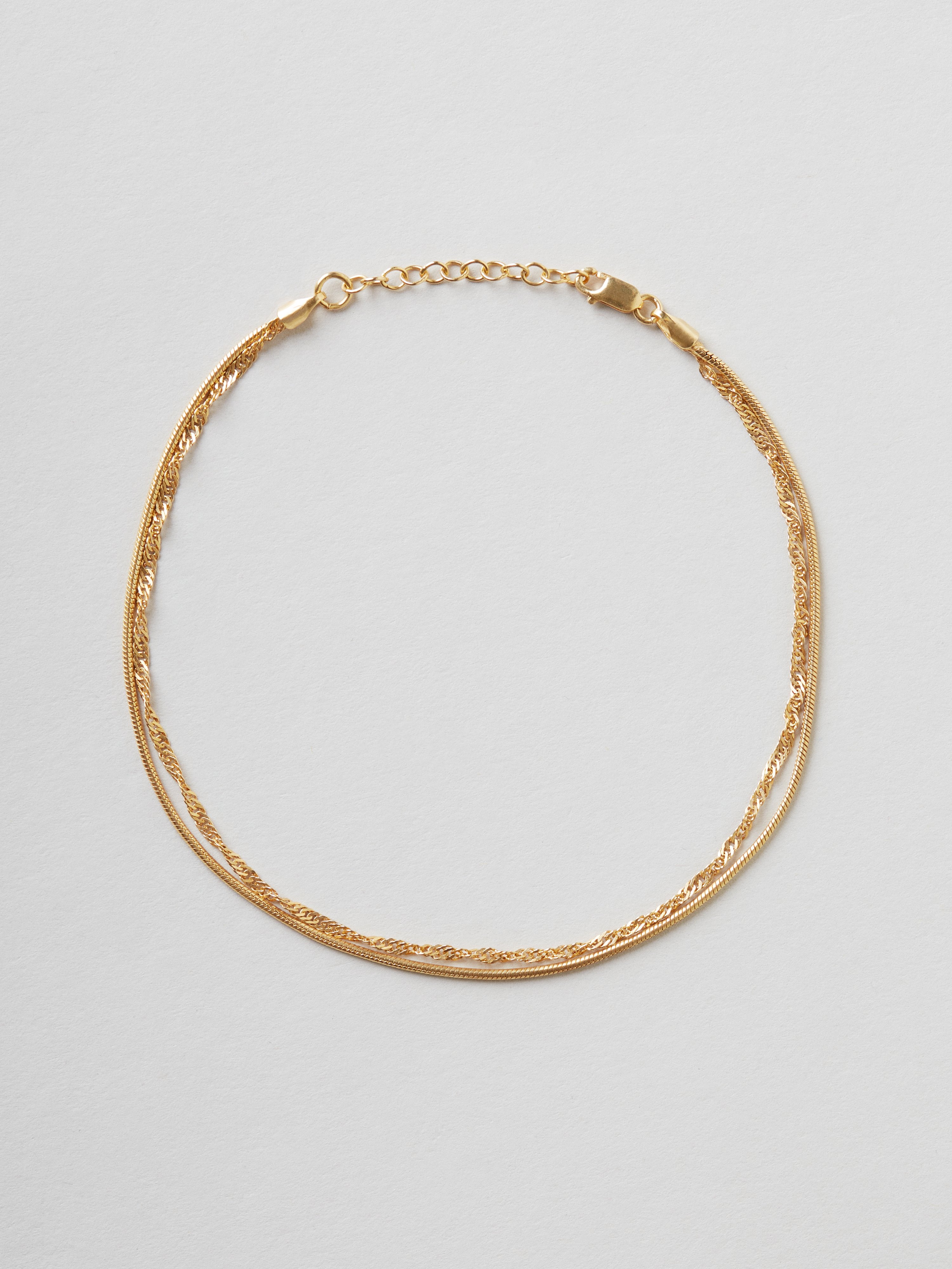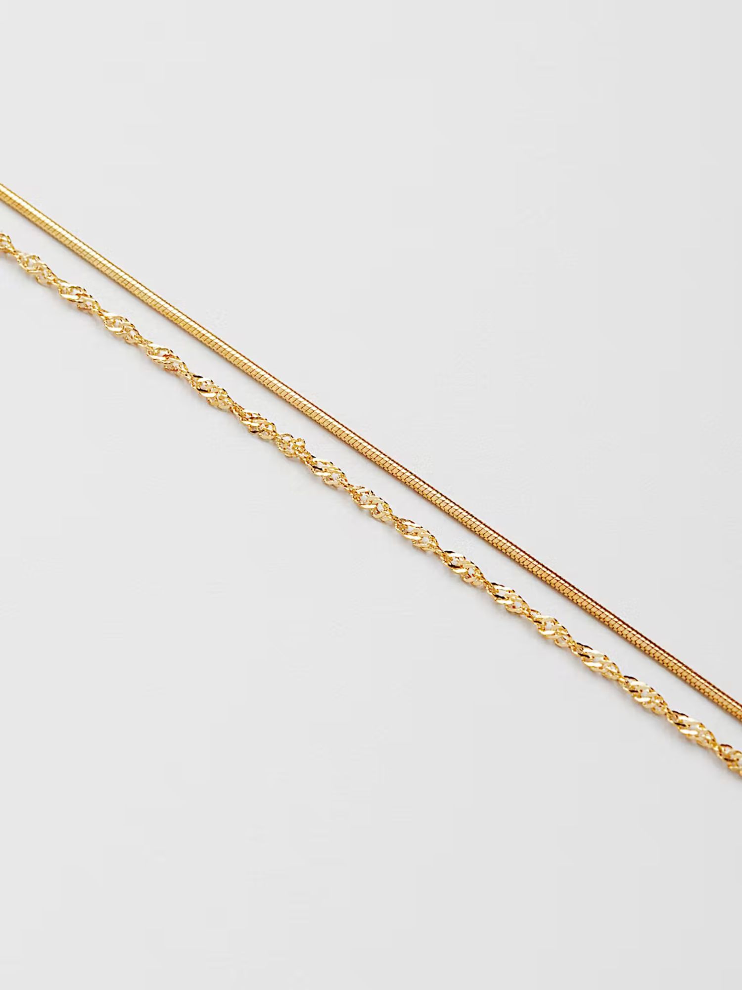 Fotlänk i äkta 925 sterling silver. Fotlänken består av både en Singapore-länk och en tunn platt ormlänk som är sammanlänkade. Fotlänken i guld är förgylld med äkta 18K guld och har en kärna av äkta 925 sterling silver. Denna produkt är 100% återvunnet silver.