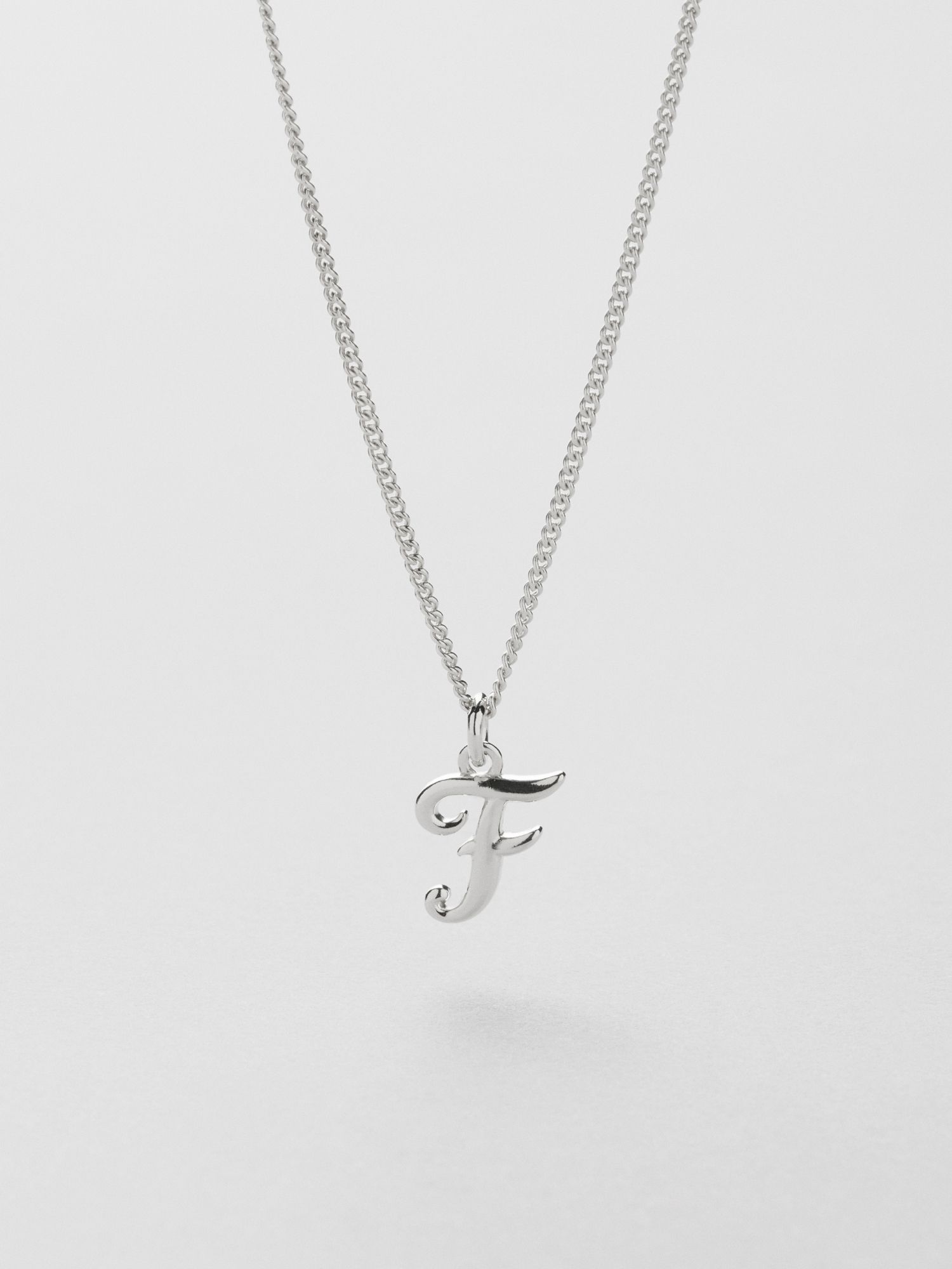Bokstavshalsband med ett kursivt F i äkta 925 sterling silver. Guldhalsbandet är förgyllt med äkta 18K guld och har en kärna av äkta 925 sterling silver. Denna produkt är tillverkad av 100 % återvunnet silver.