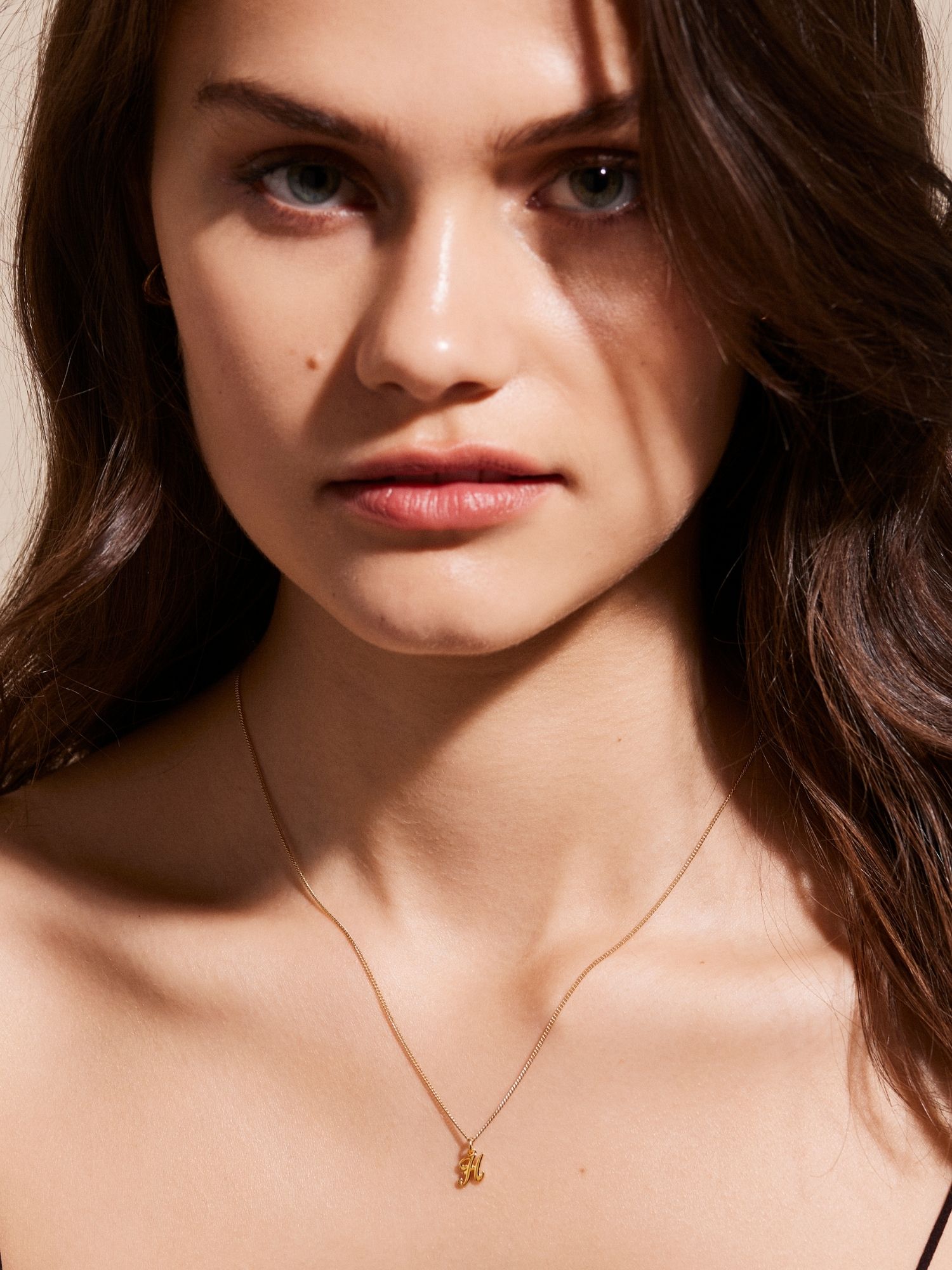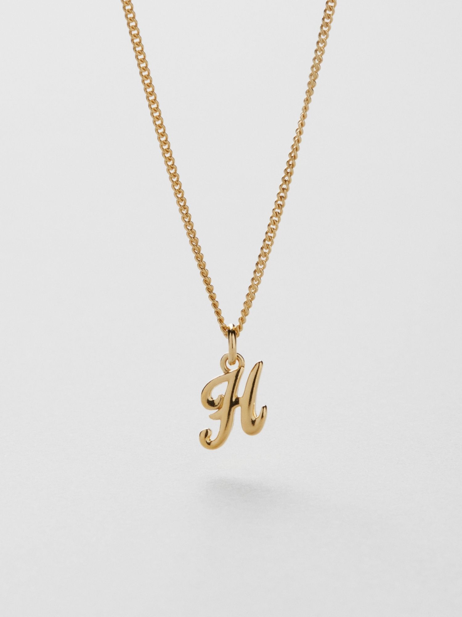 Bokstavshalsband med ett kursivt H i äkta 925 sterling silver. Guldhalsbandet är förgyllt med äkta 18K guld och har en kärna av äkta 925 sterling silver. Denna produkt är tillverkad av 100 % återvunnet silver.