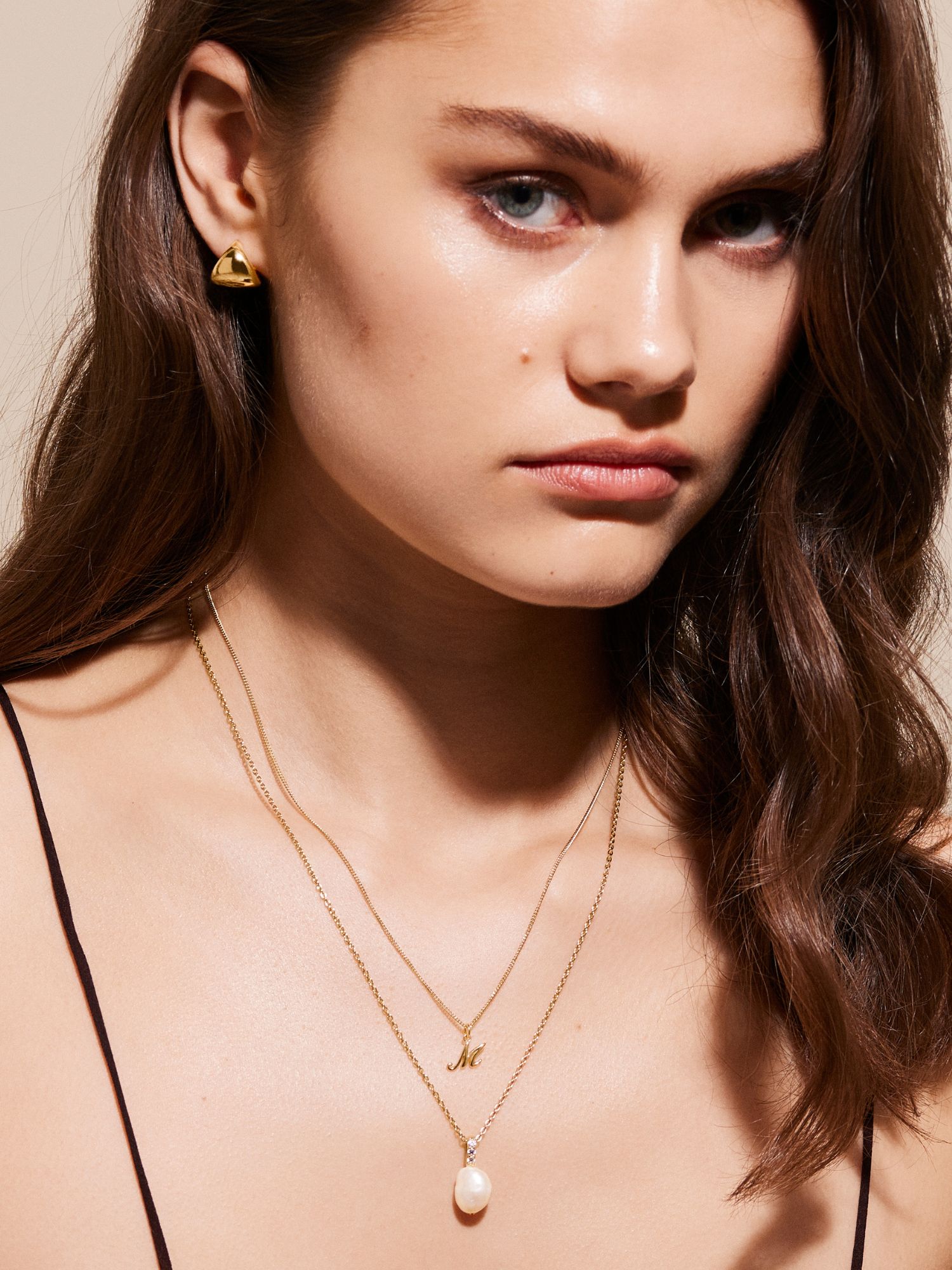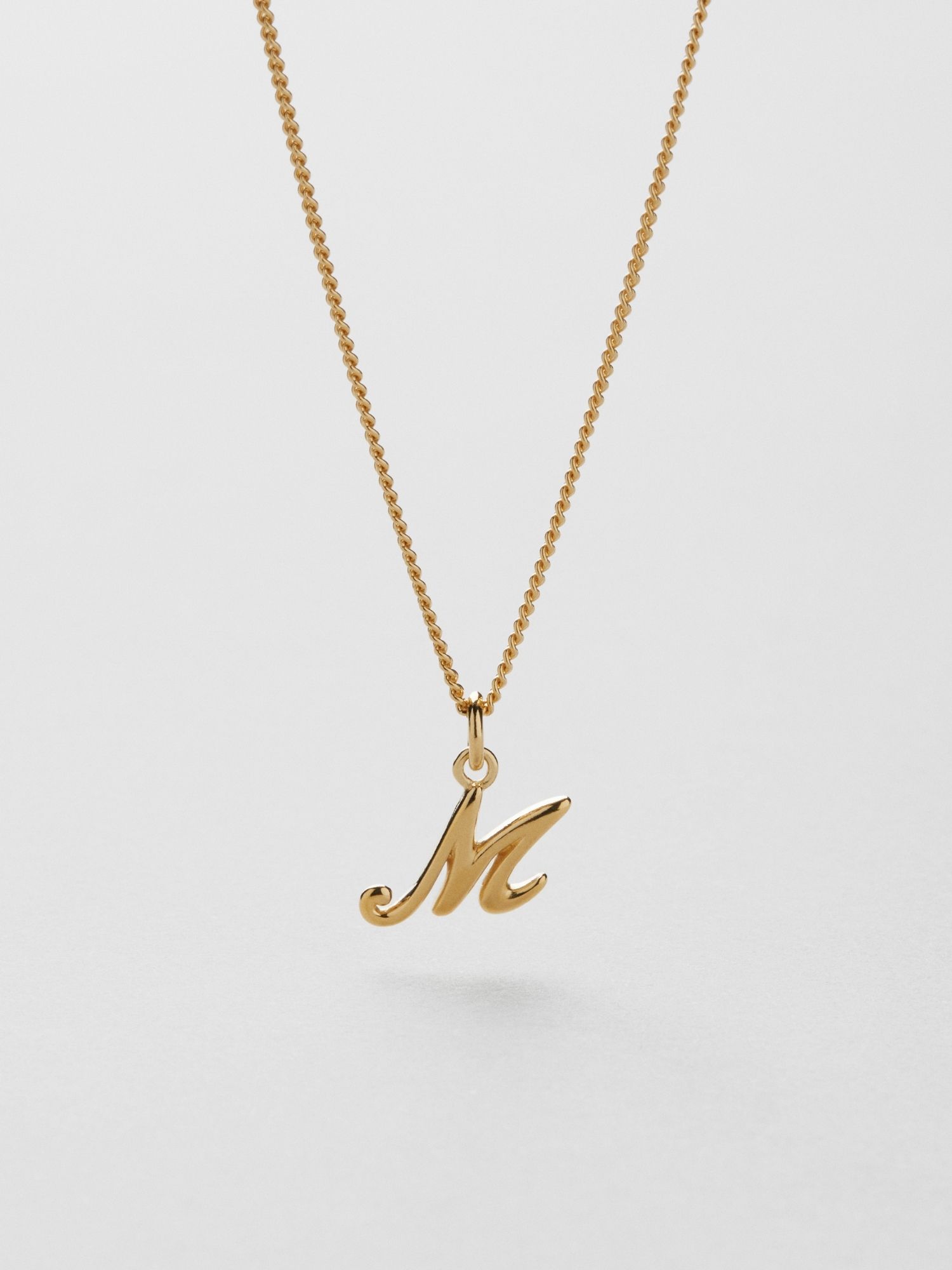 Bokstavshalsband med ett kursivt M i äkta 925 sterling silver. Guldhalsbandet är förgyllt med äkta 18K guld och har en kärna av äkta 925 sterling silver. Denna produkt är tillverkad av 100 % återvunnet silver.