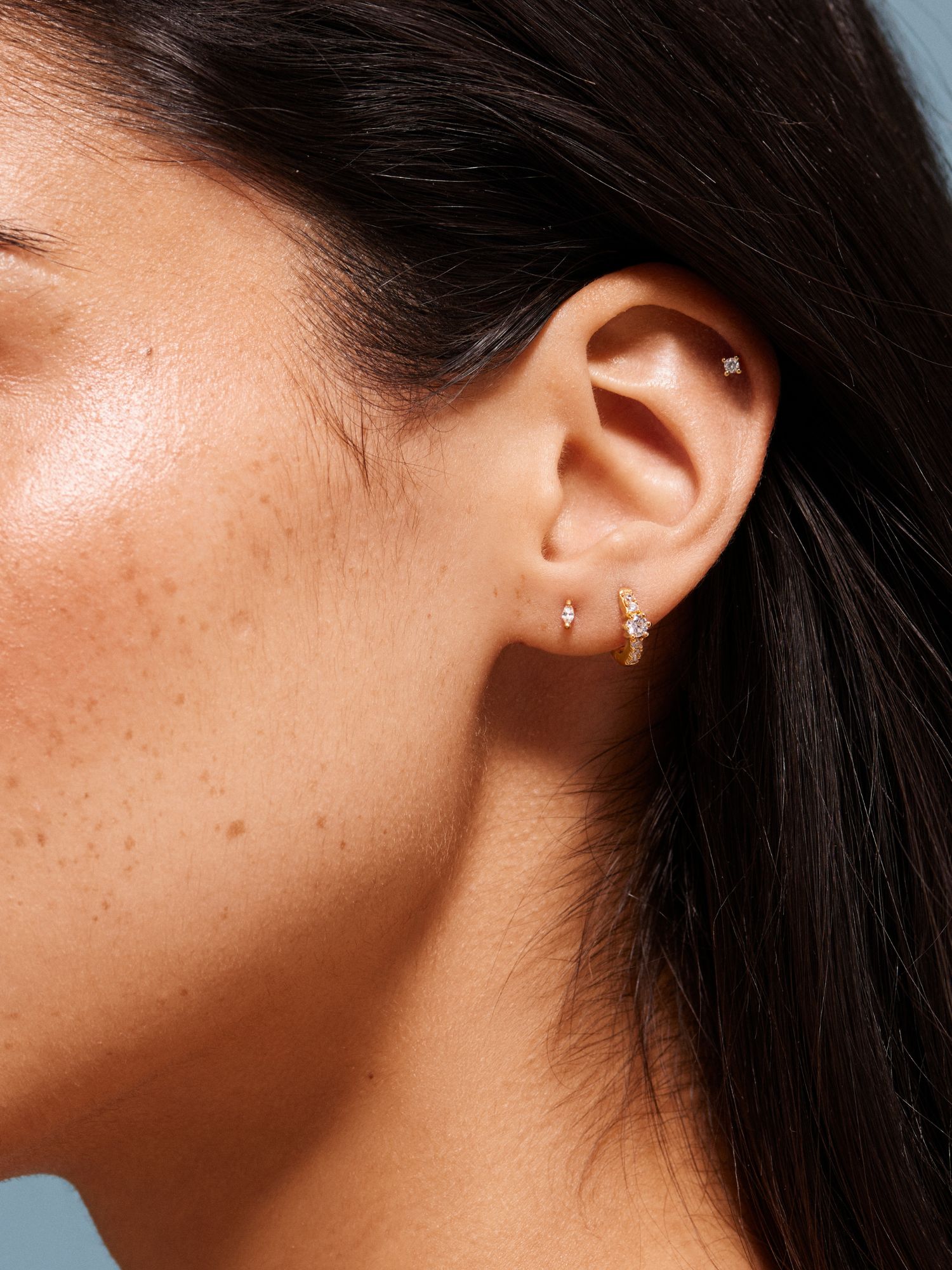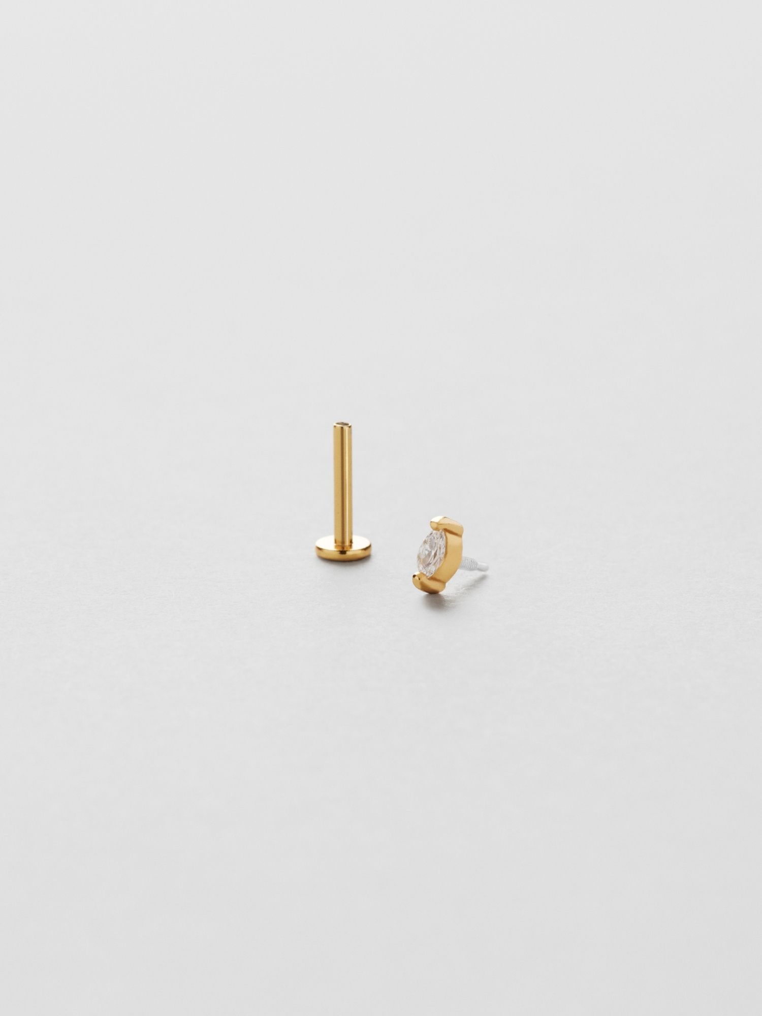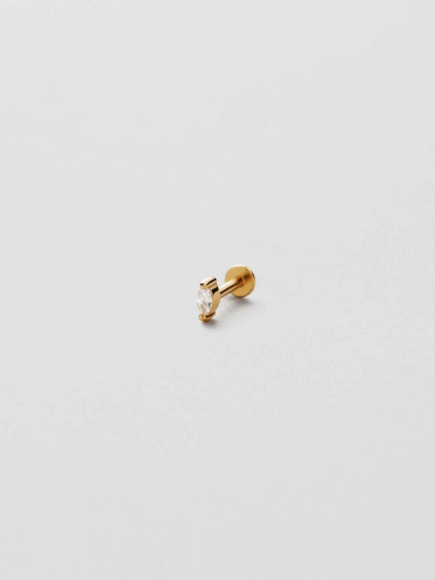 Piercing med en klar Marquise slipad Cubic Zirconia sten i äkta 925 sterling silver. Guldsmycket är förgyllt med äkta 18K guld och har en kärna av äkta 925 sterling silver. Staven är tillverkad av äkta 925 sterling silver. Denna produkt är tillverkad av 100% återvunnet silver. Placera piercingens bakre del genom örat bakifrån och skruva fast med piercingens främre del.