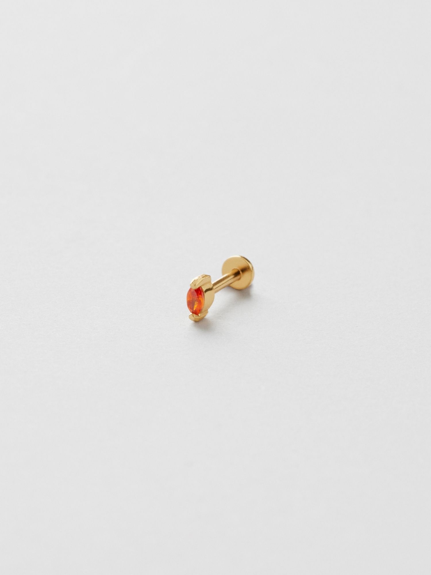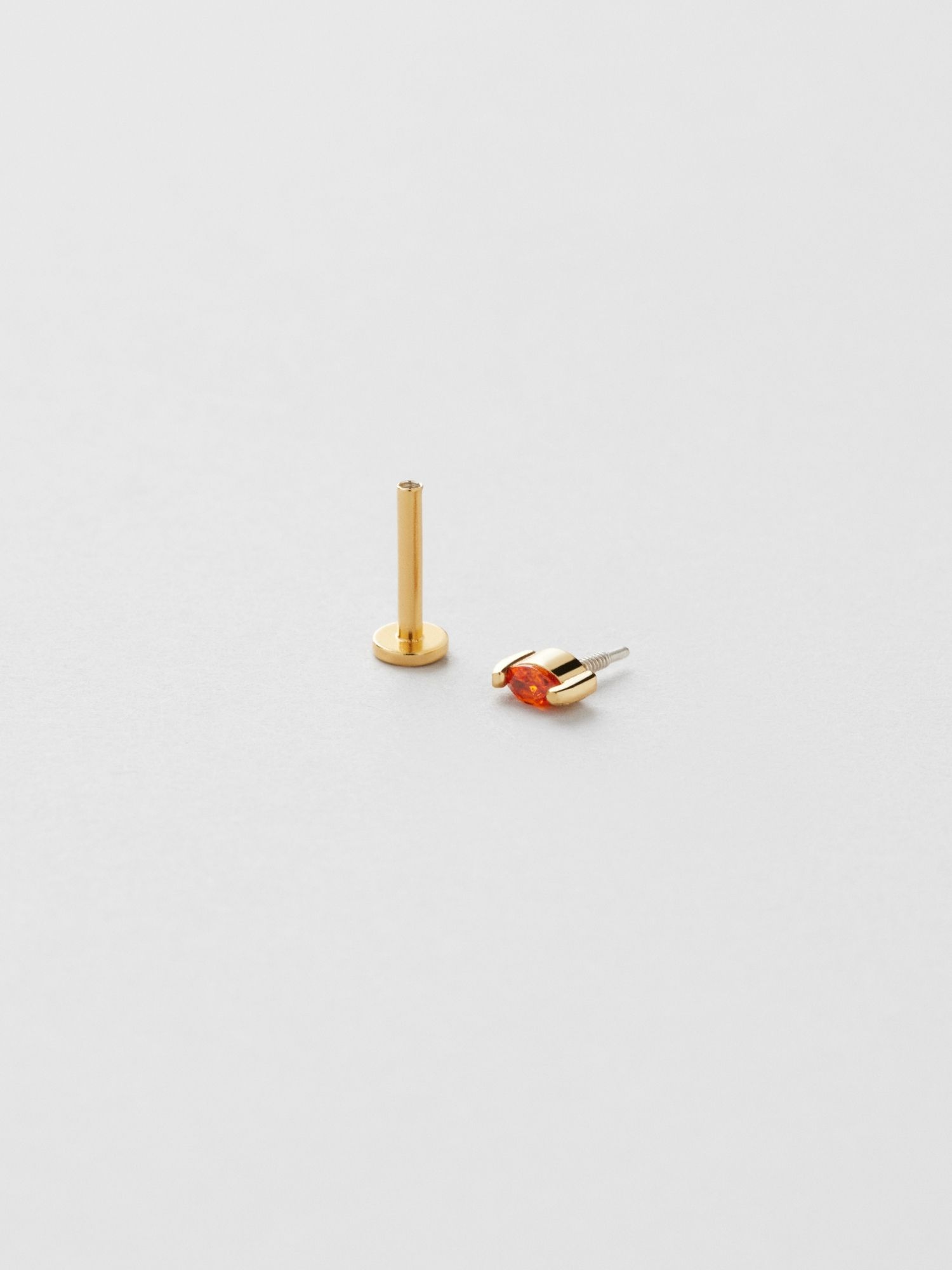 Piercing i äkta 925 sterling silver, dekorerad med en orange marquiseslipad Cubic Zirconia-sten. Guldsmycket är förgyllt med äkta 18K guld och har en kärna av äkta 925 sterling silver. Staven är tillverkad av äkta 925 sterling silver. Denna produkt är tillverkad av 100% återvunnet silver. Placera piercingens bakre del genom örat bakifrån och skruva fast med piercingens främre del.