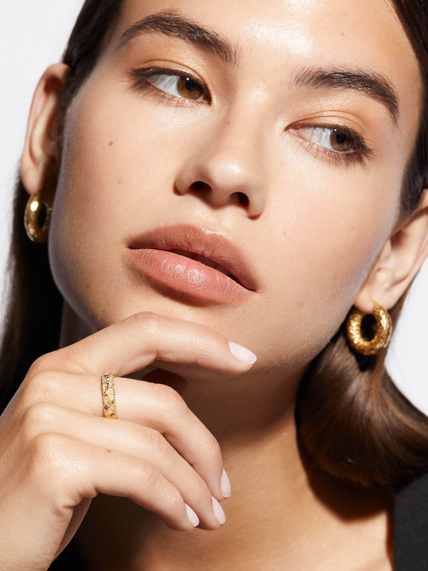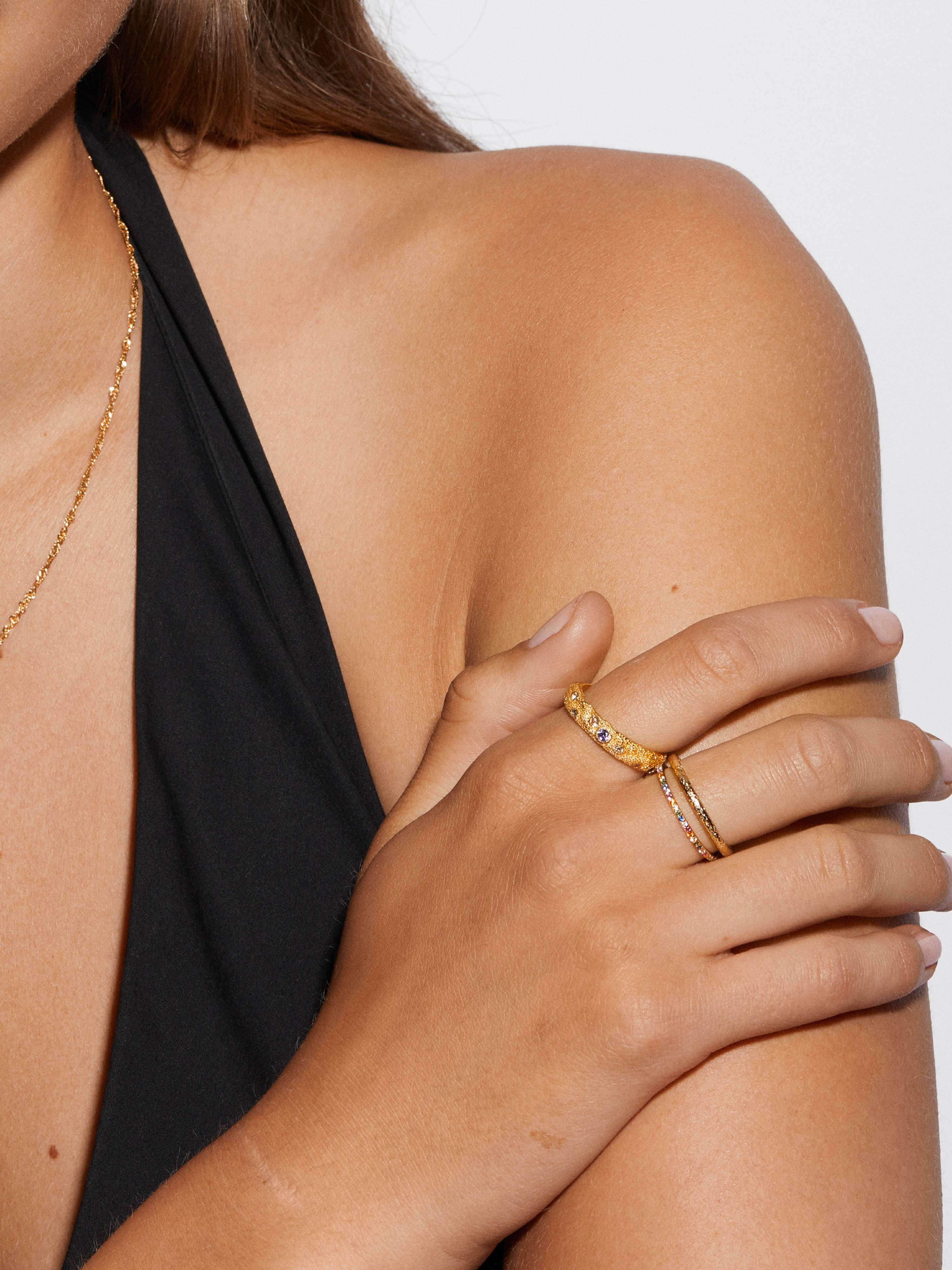 Ring i äkta 925 sterling silver. Guldringen är förgylld med äkta 24K guld och har en kärna av äkta 925 sterling silver. Ringen är dekorerad med Cubic Zirconia stenar i olika färger och har en strukturerad yta. Idag är mer än 85% av våra smycken tillverkade av återvunnet silver.