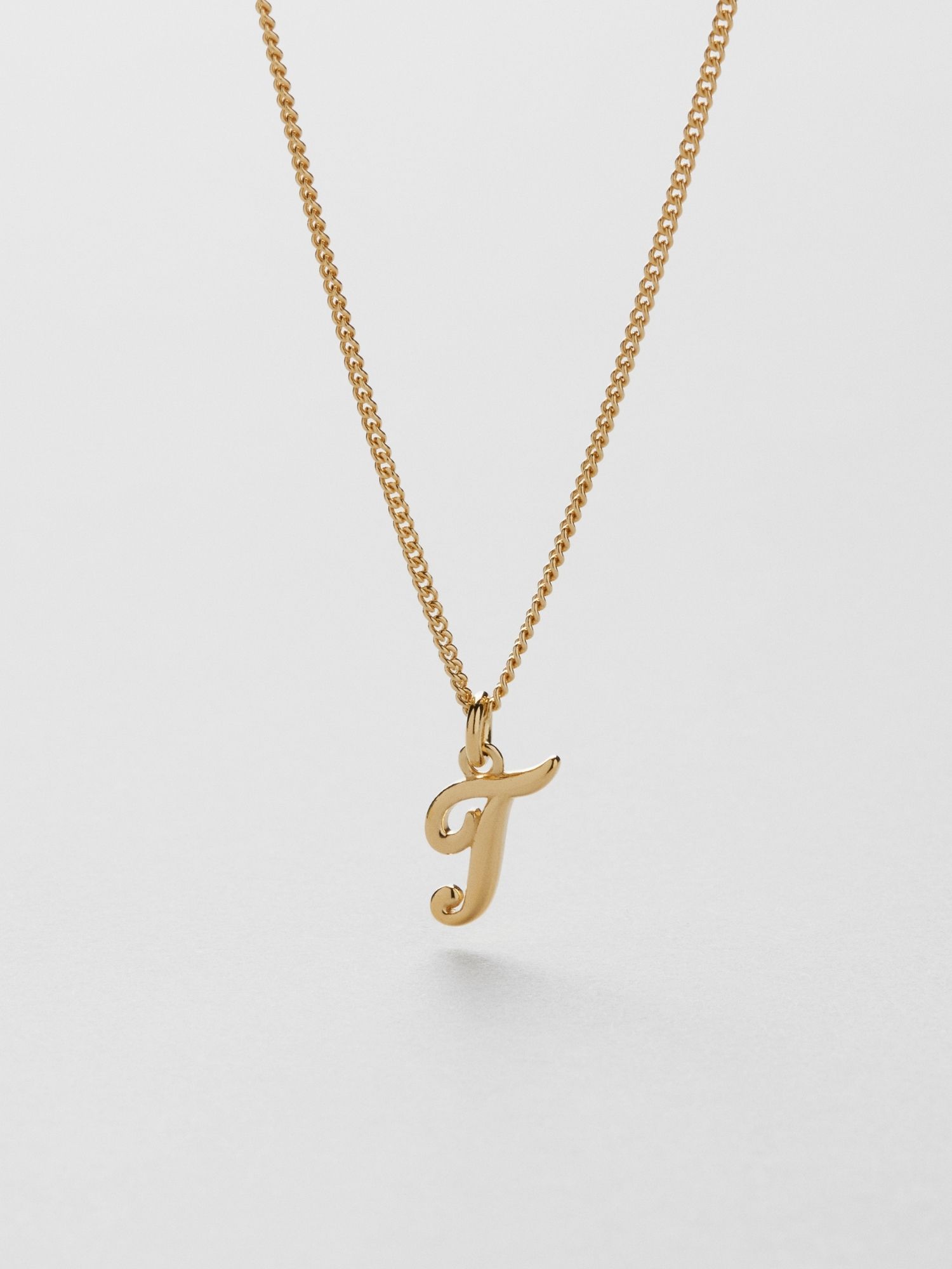 Bokstavshalsband med ett kursivt T i äkta 925 sterling silver. Guldhalsbandet är förgyllt med äkta 18K guld och har en kärna av äkta 925 sterling silver. Denna produkt är tillverkad av 100 % återvunnet silver.
