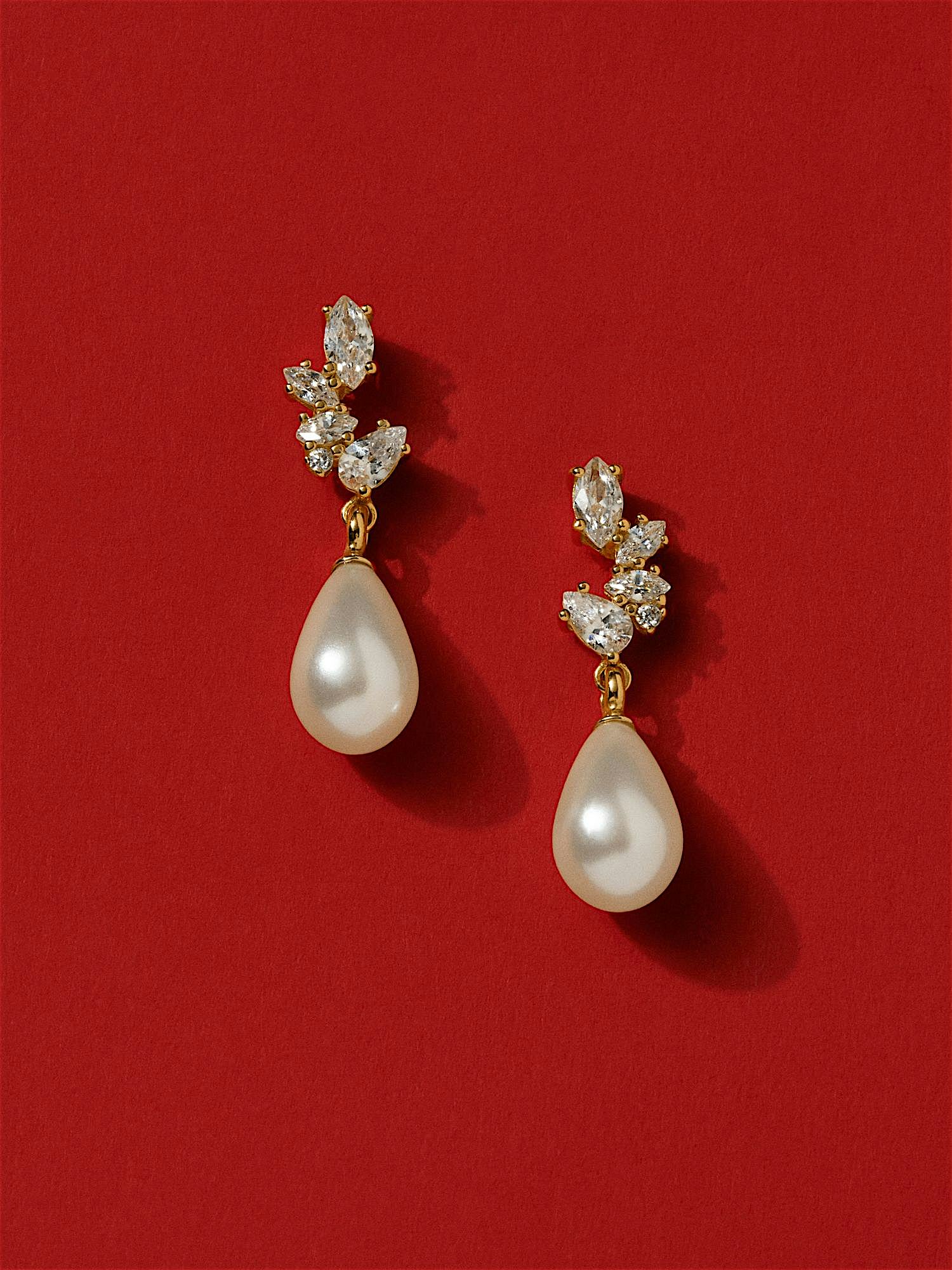Pearl earrings in genuine 925 sterling silver, decorated with clear Cubic Zirconia stones and freshwater pearls. The gold earrings are plated with genuine 24K gold and has a core of genuine 925 sterling silver. This product is made of 100% recycled silver.