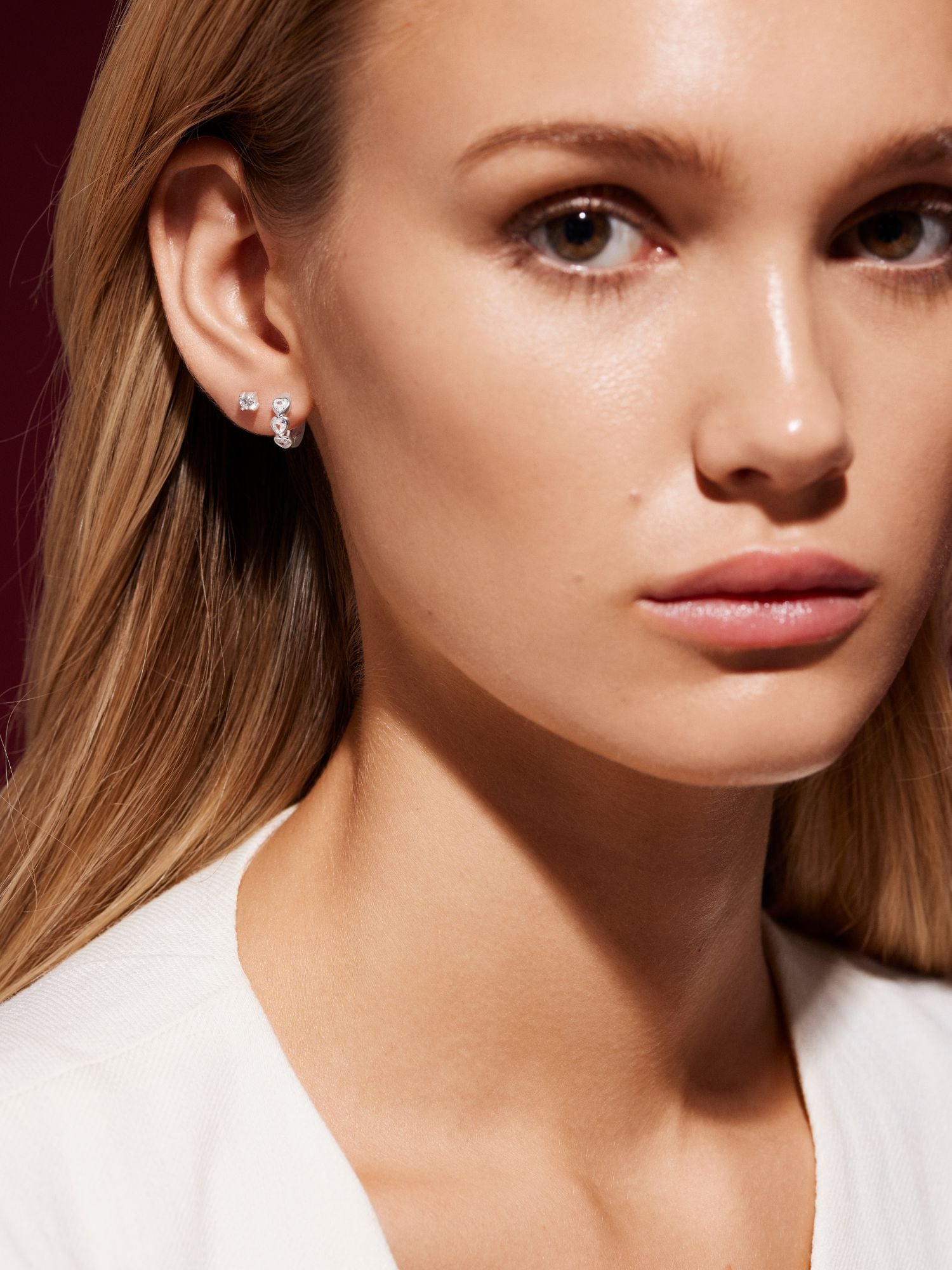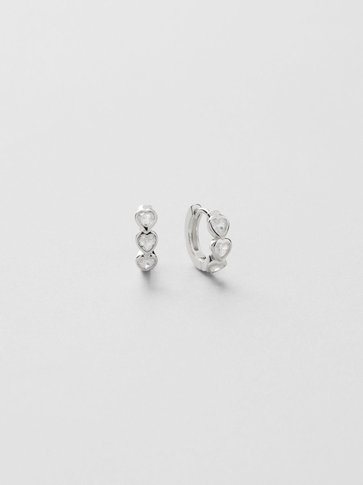 Huggie hoops with heart shaped clear Cubic Zirconia stones in a bezel setting in genuine 925 sterling silver. The gold earrings are gilded with genuine 18K gold and has a core of genuine 925 sterling silver. This product is made from 100% recycled silver.