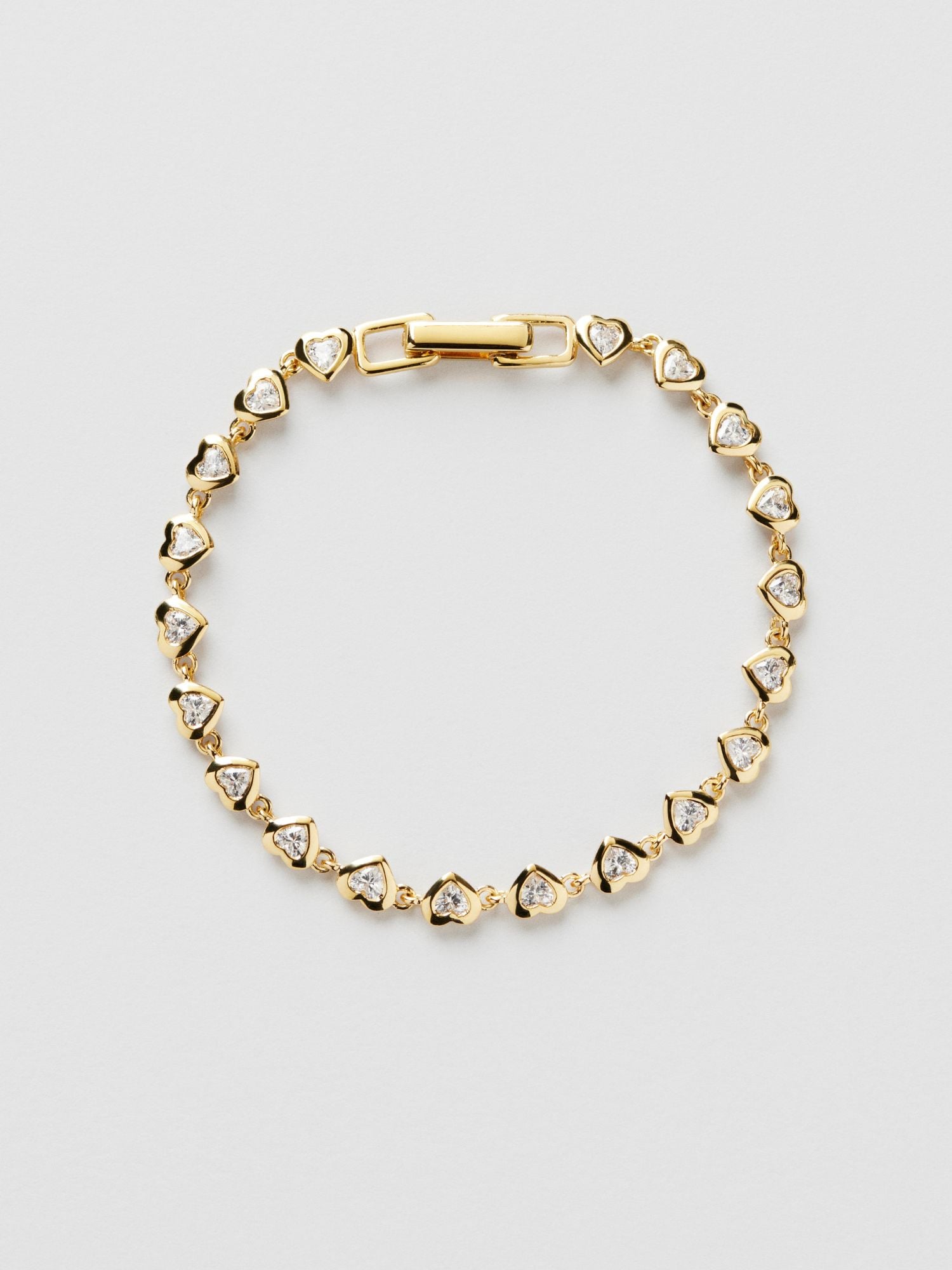 Bracelet in genuine 925 sterling silver, decorated with clear heart-shaped Cubic Zirconia stones in bezel setting. The gold bracelet is plated with genuine 24K gold and has a core of genuine 925 sterling silver. This product is made of 100% recycled silver.