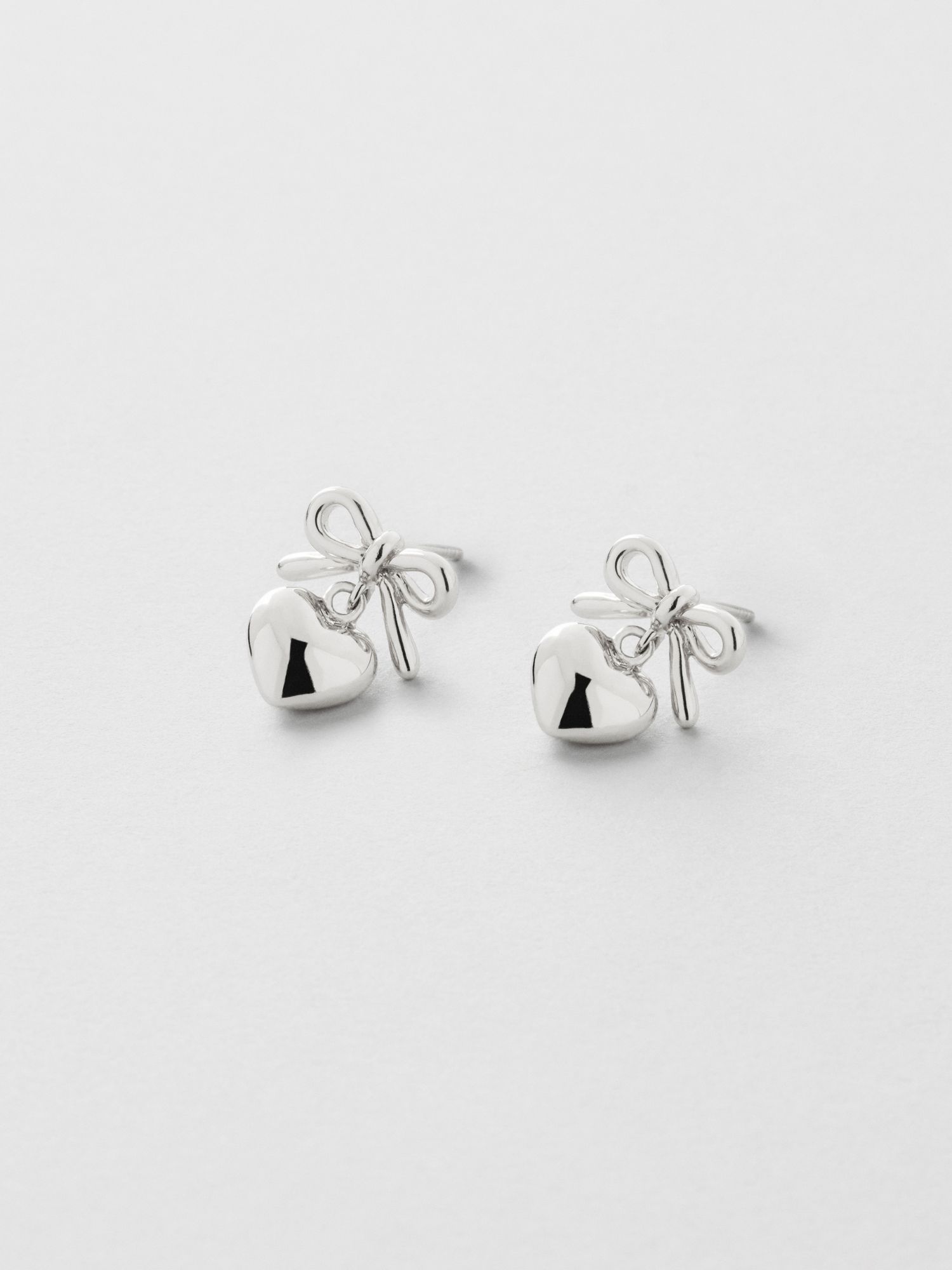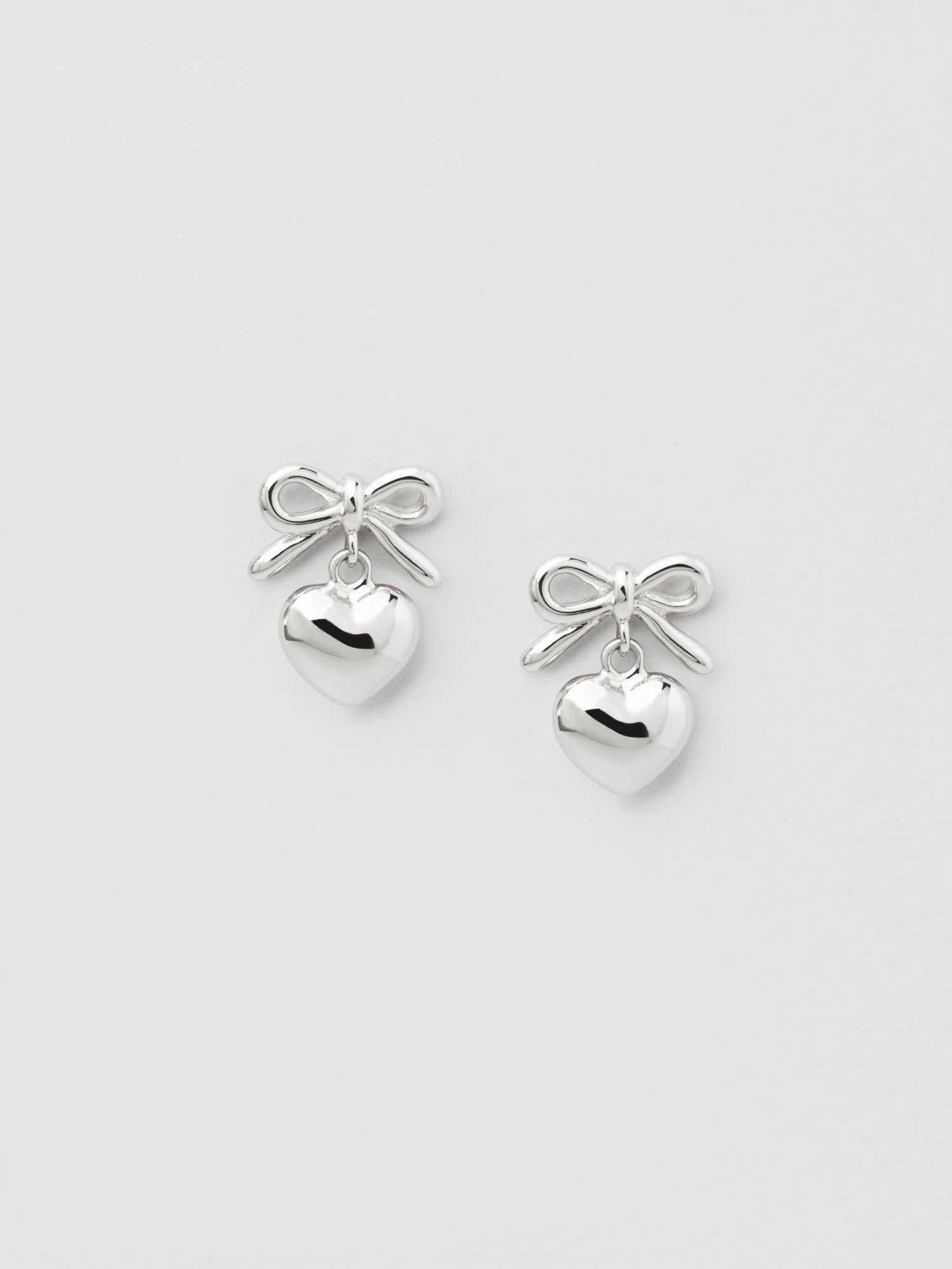 Earrings in the shape of a bow and a heart, in genuine 925 sterling silver. The gold earrings are plated with genuine 24K gold and have a core of genuine 925 sterling silver. This product is made of 100% recycled silver.