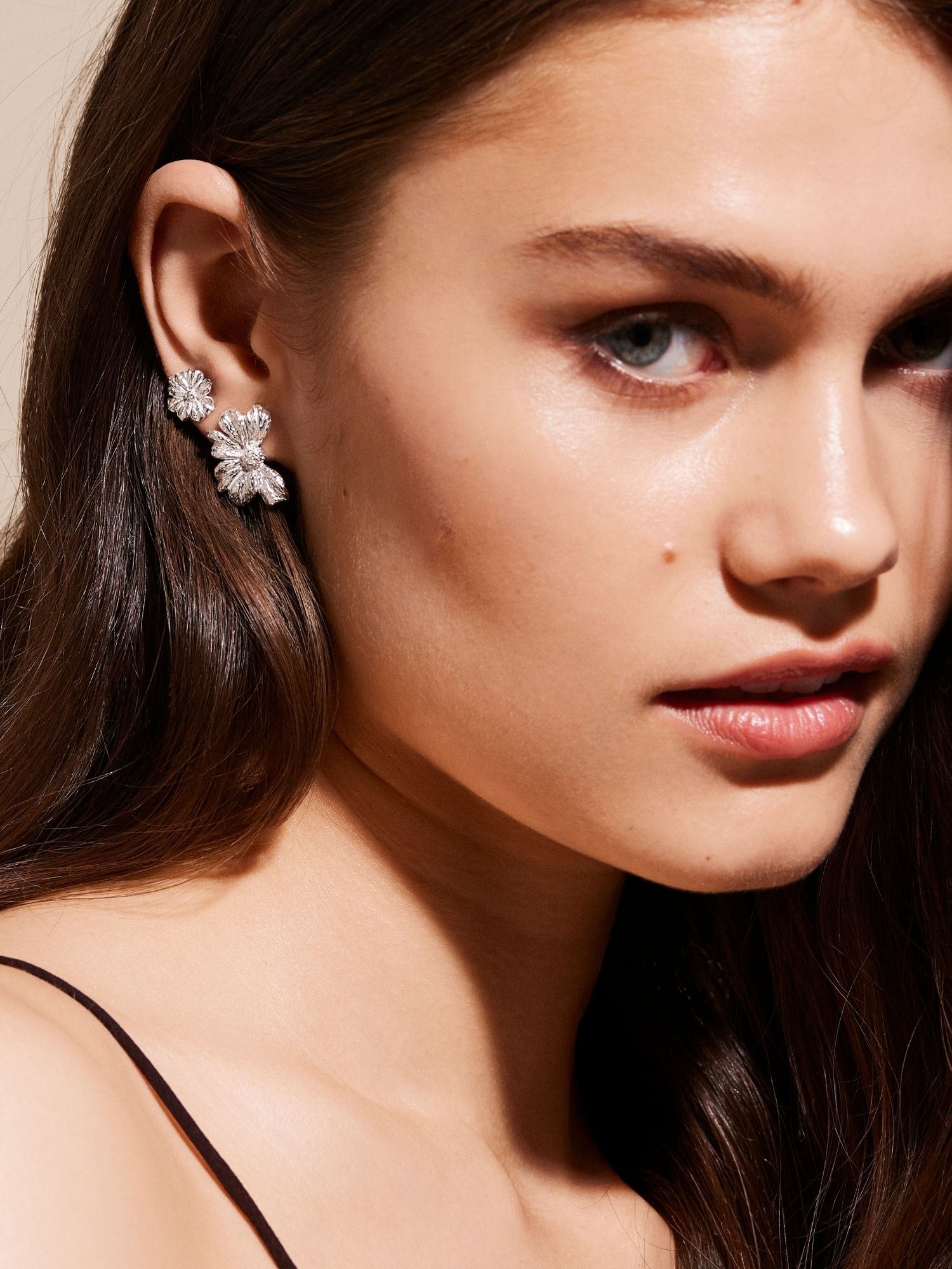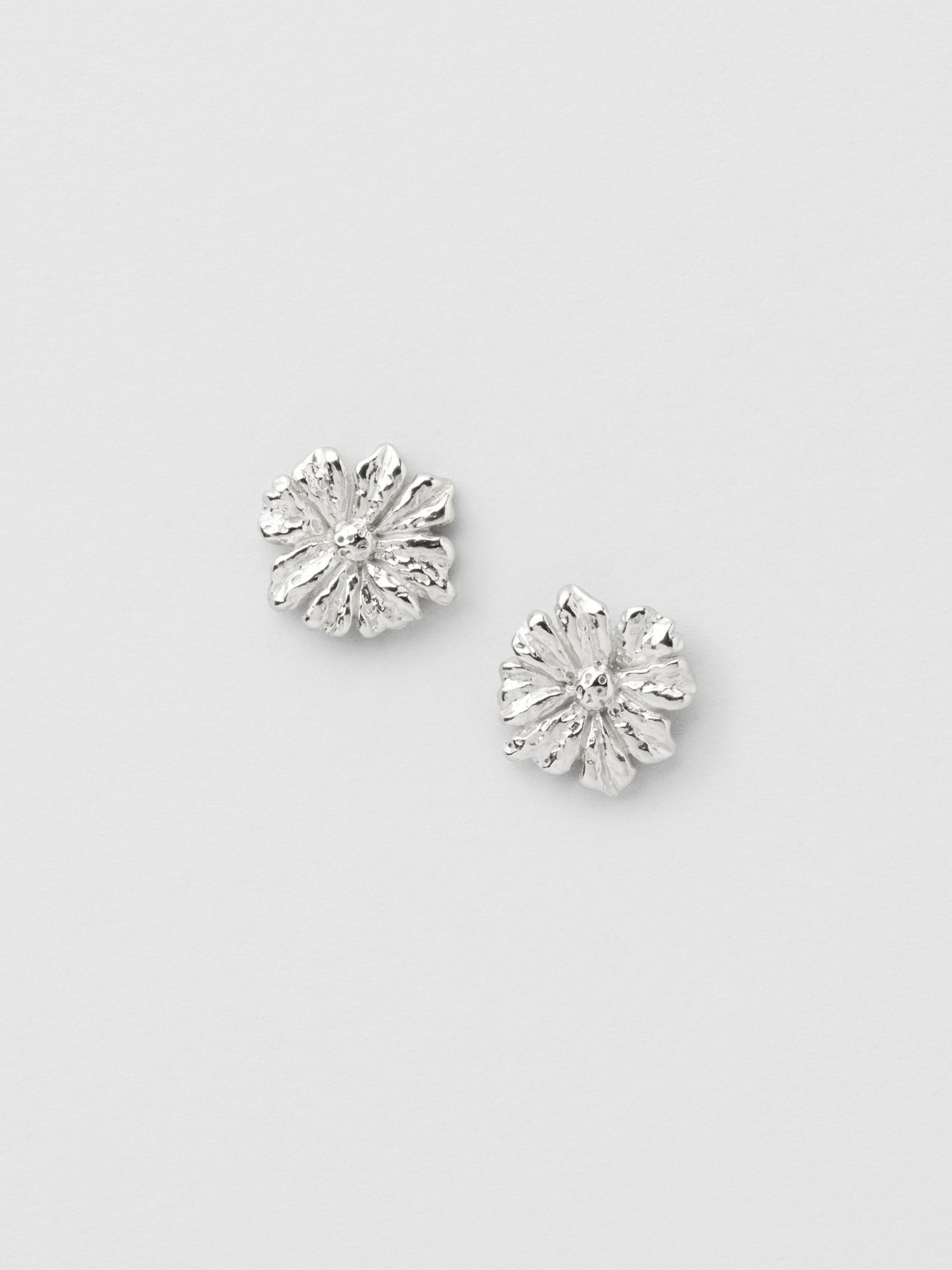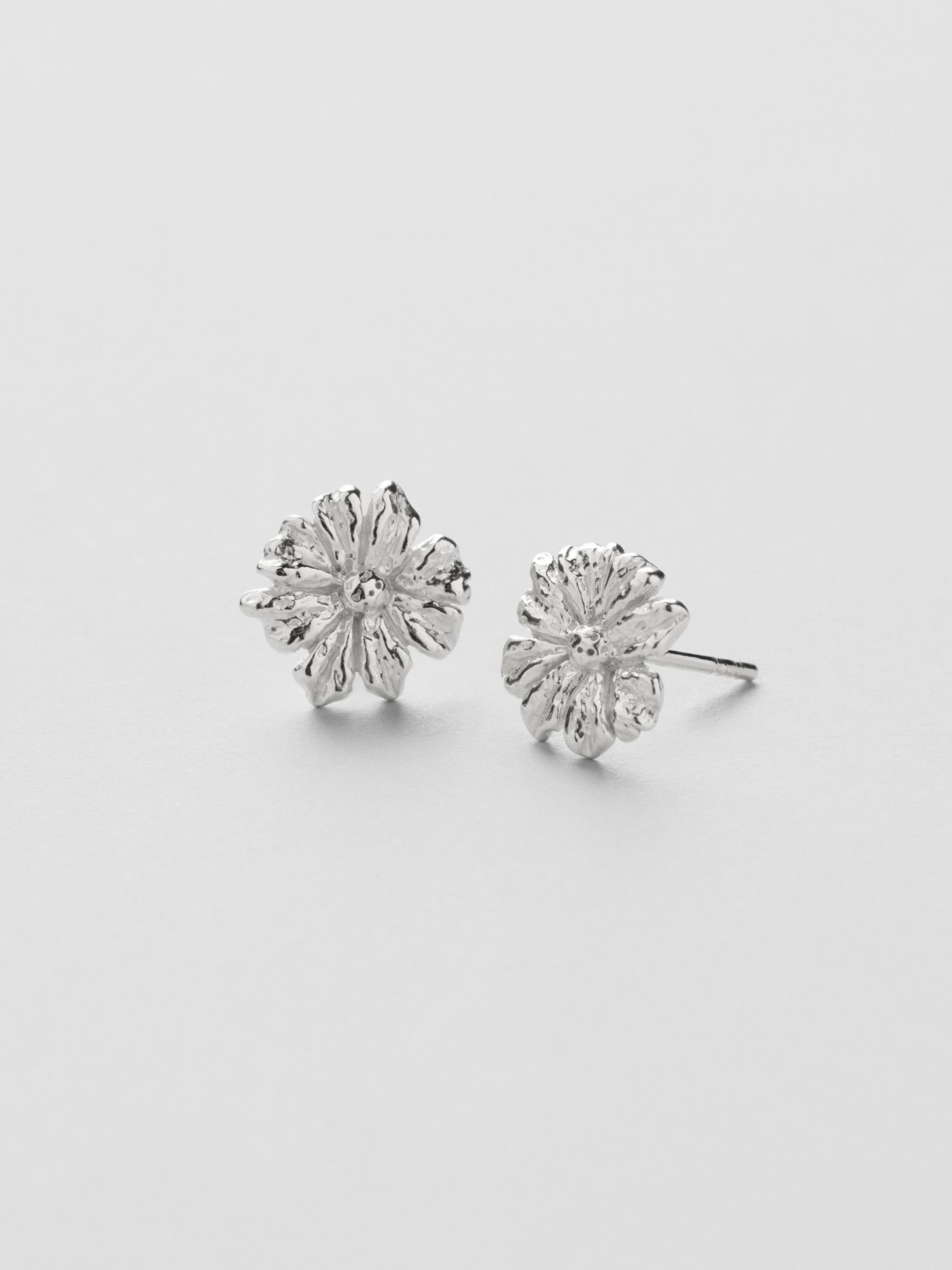 Vintage-inspired flower earrings in the shape of a cosmos flower, made from genuine 925 sterling silver. The gold earrings are plated with genuine 24K gold and have a core of genuine 925 sterling silver. This product is made from 100% recycled silver.