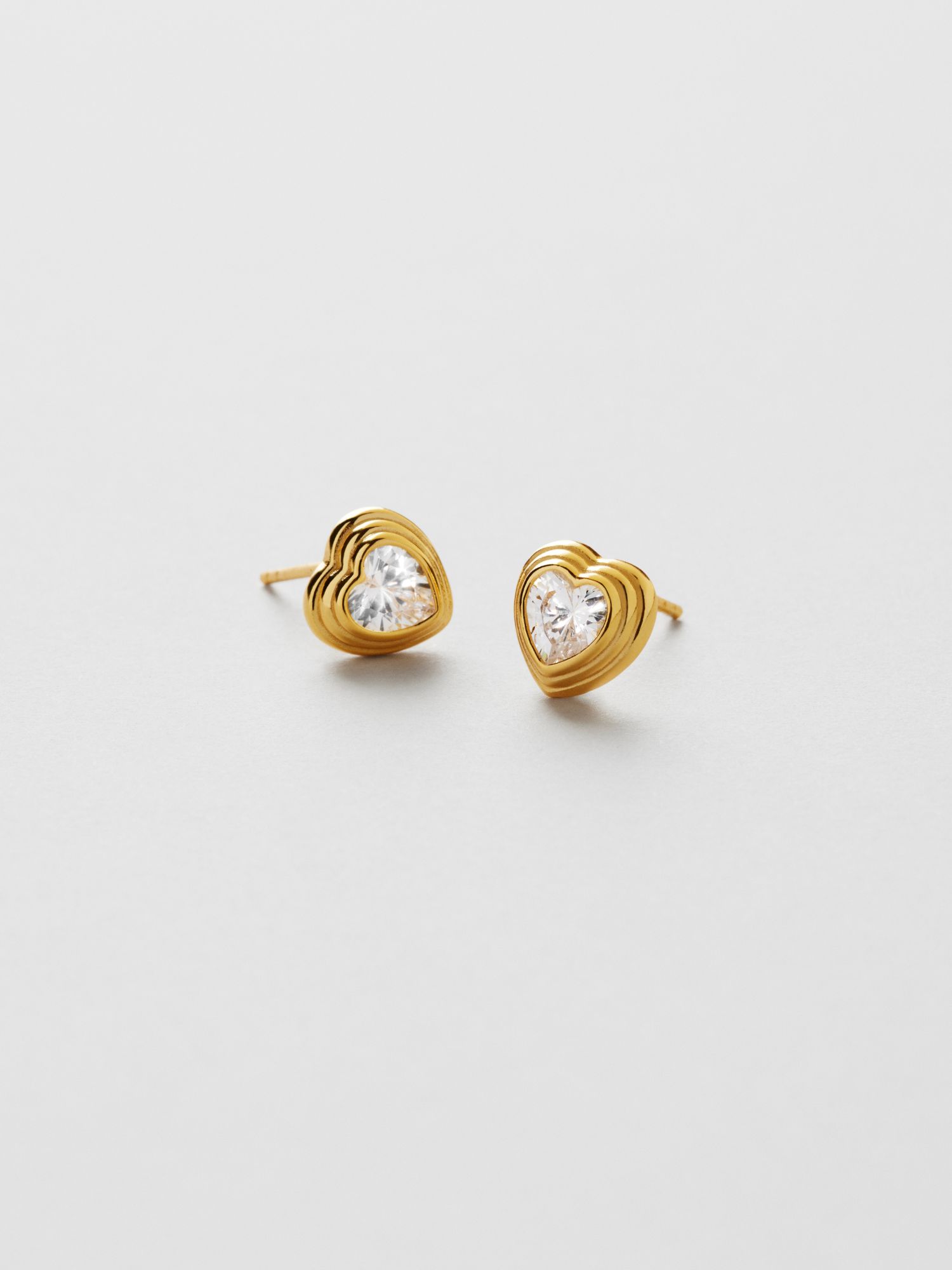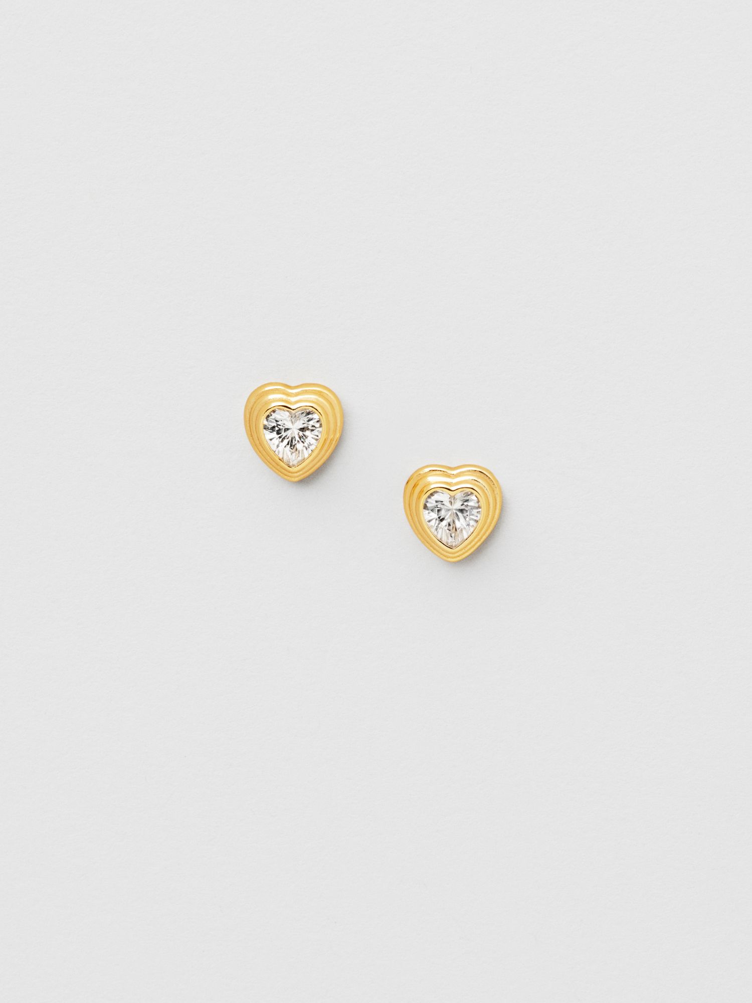 Heart-shaped studs in genuine 925 sterling silver, adorned with a clear Cubic Zirconia stone. The gold earrings are plated with genuine 18K gold and have a core of genuine 925 sterling silver. This product is made from 100% recycled silver.