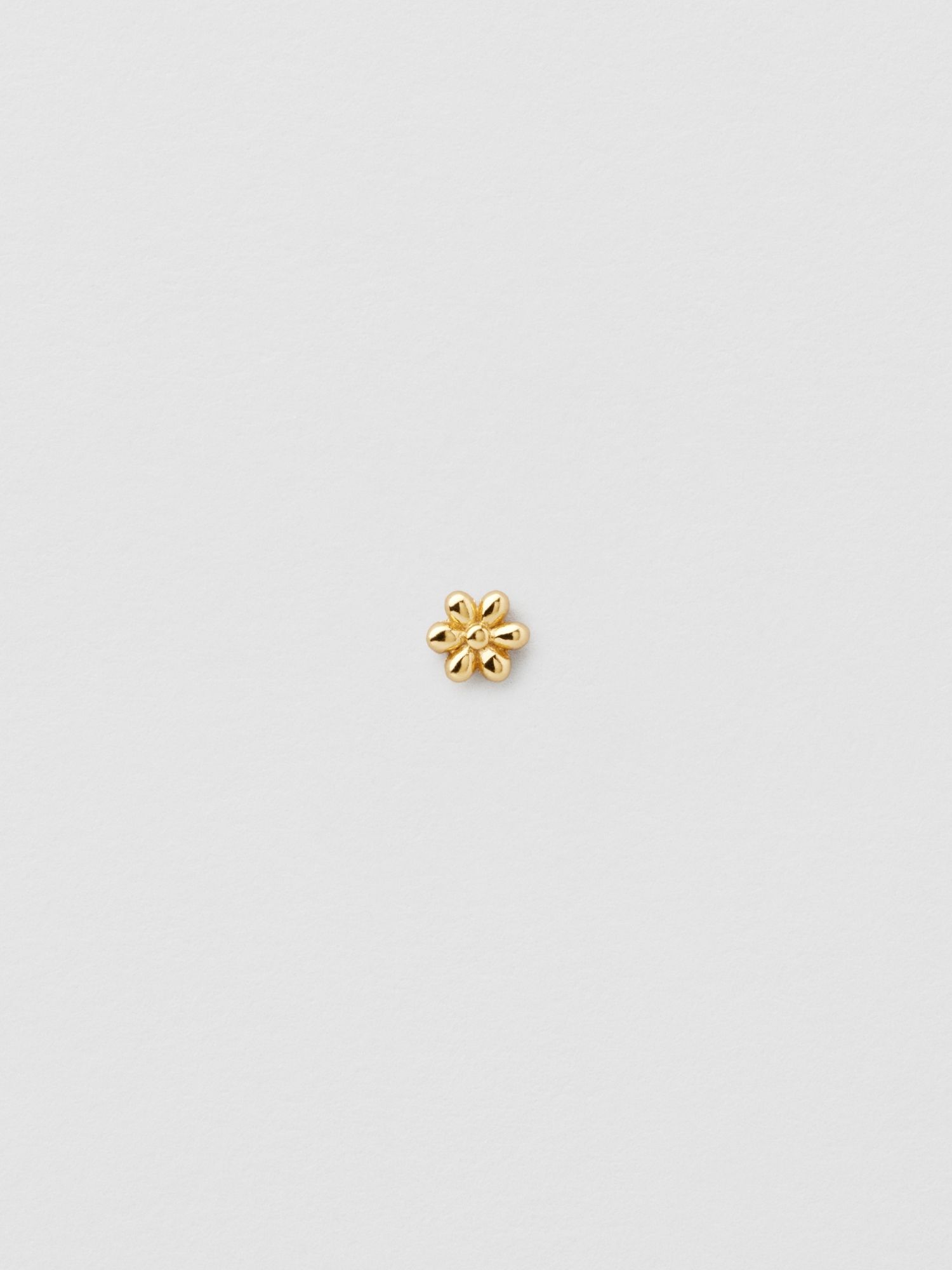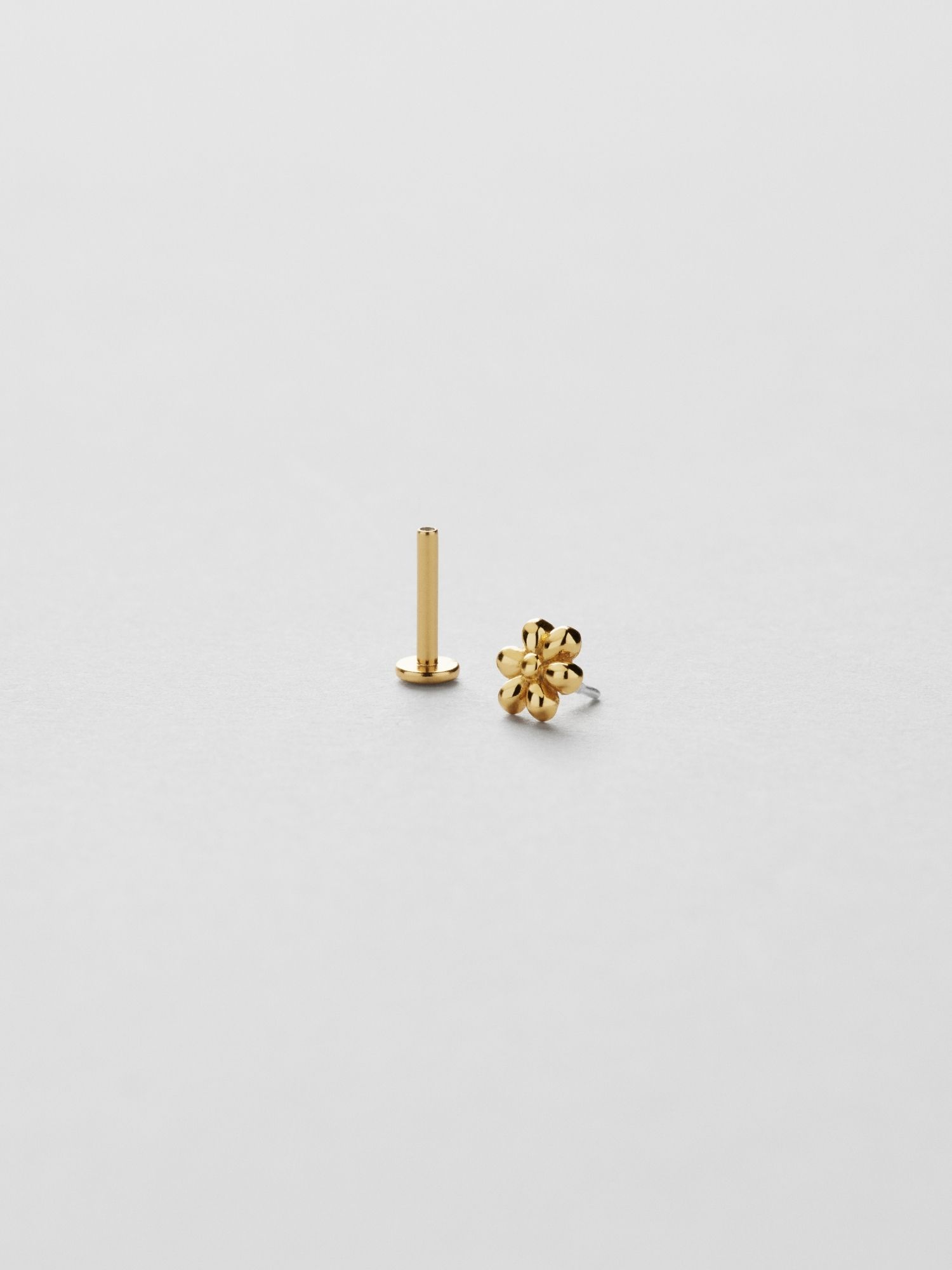 Piercing in the shape of a daisy flower in genuine 925 sterling silver. The gold jewellery is plated with genuine 18K gold and has a core of genuine 925 sterling silver. This product is made from 100% recycled silver. The bar is made of genuine 925 sterling silver. Place the back part of the piercing through the ear from behind and screw on with the front part of the piercing.