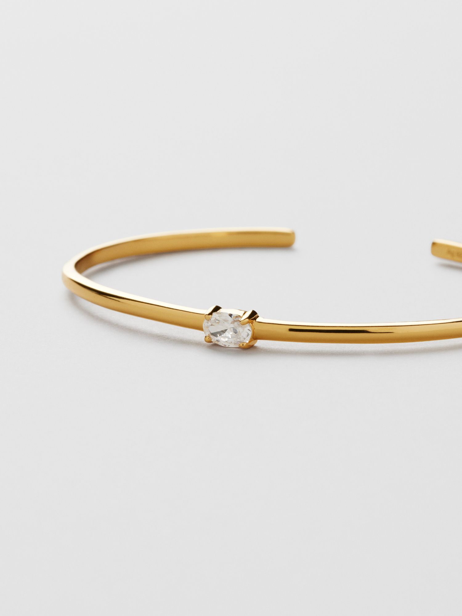 Cuff bracelet in genuine 925 sterling silver with an oval Cubic Zirconia stone. The gold bracelet is plated with genuine 18K gold and has a core of genuine 925 sterling silver. This product is made from 100% recycled silver.