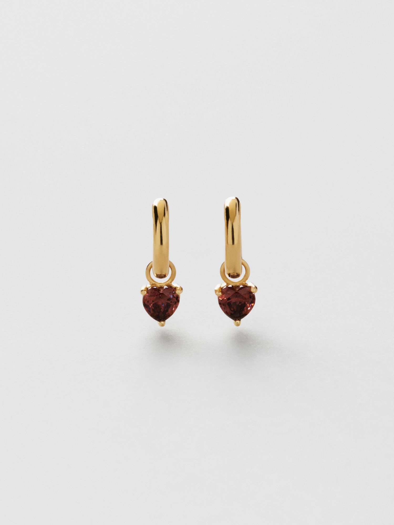 Huggie hoops in genuine 925 sterling silver, adorned with heart shaped Cubic Zirconia stones in an espresso brown shade. The gold earrings are plated with genuine 18K gold and have a core of genuine 925 sterling silver. This product is made from 100% recycled silver.