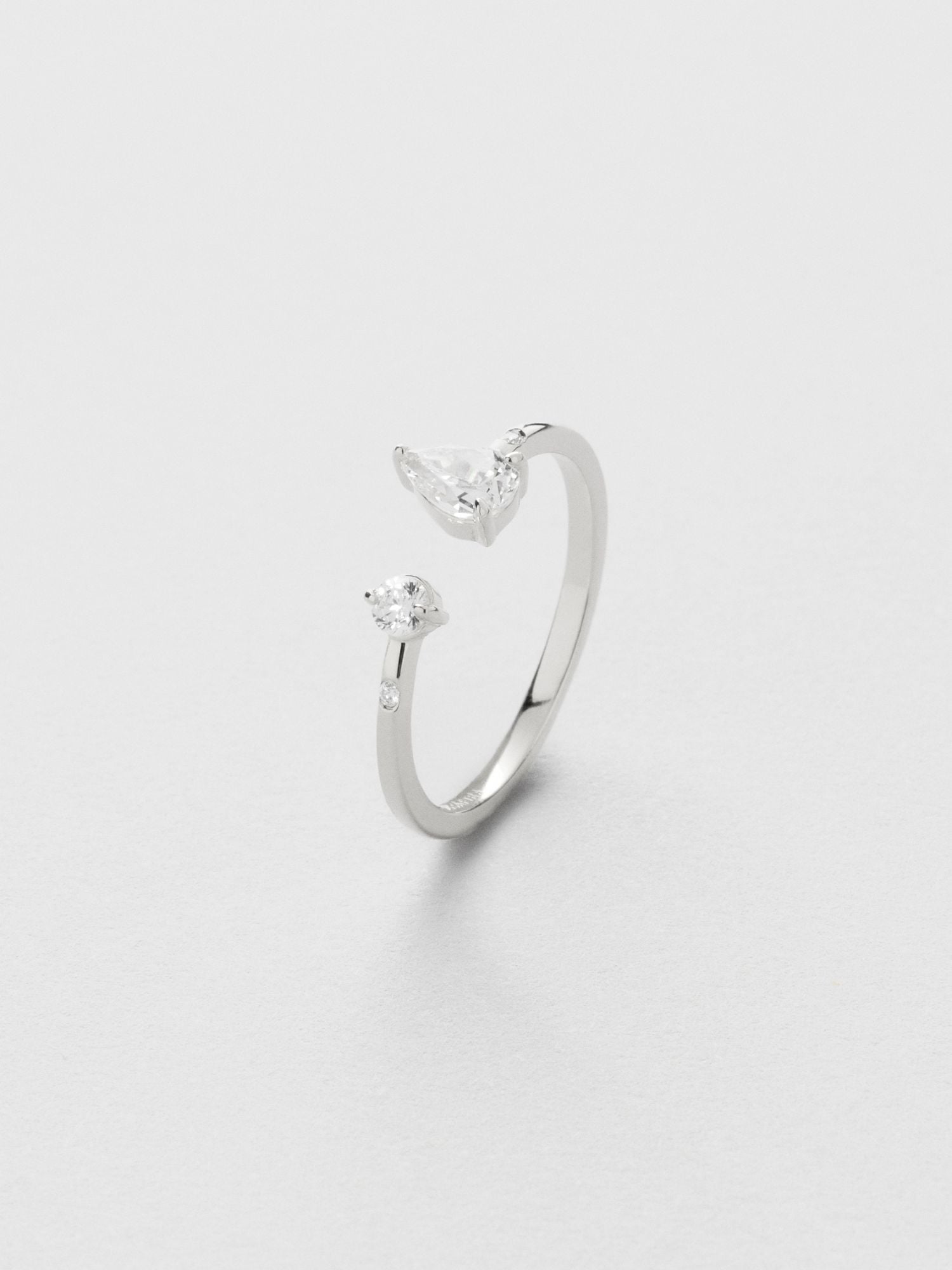 Open design ring in genuine 925 sterling silver, adorned with two clear Cubic Zirconia stones. The gold ring is plated with genuine 18K gold and has a core of genuine 925 sterling silver. This product is made from 100% recycled silver.