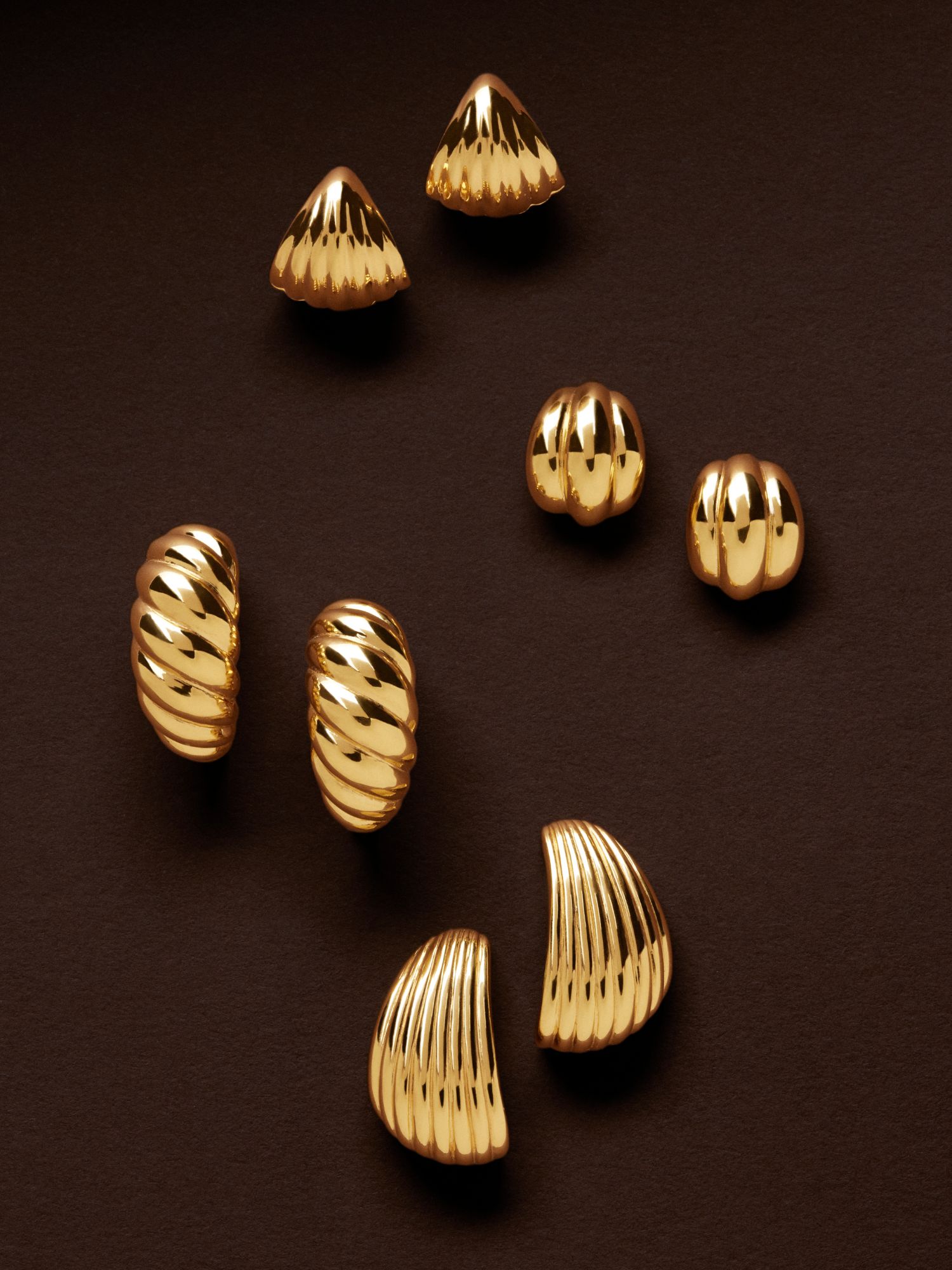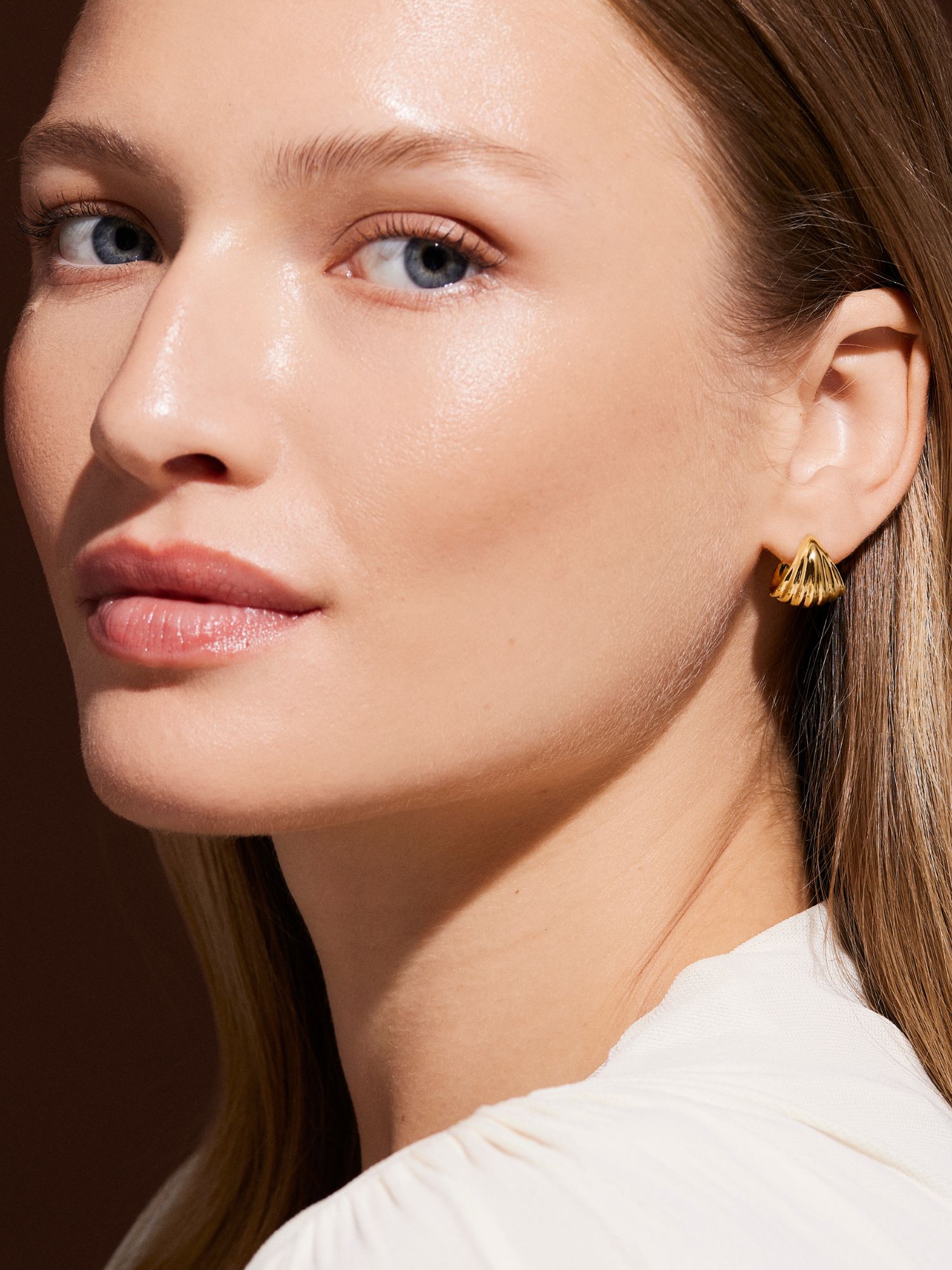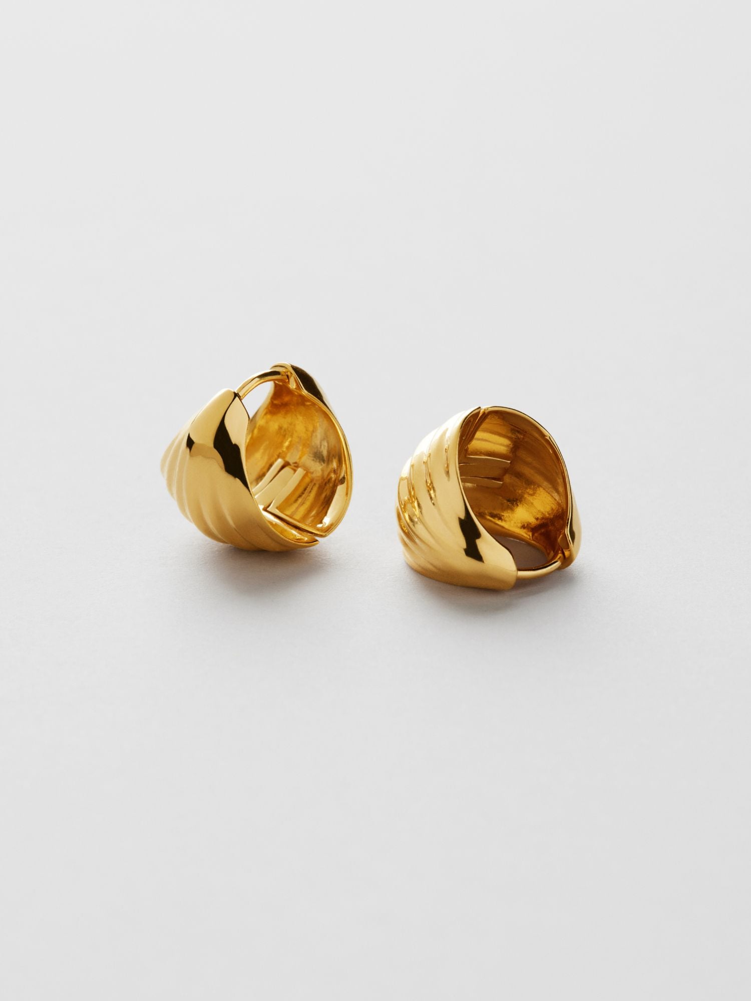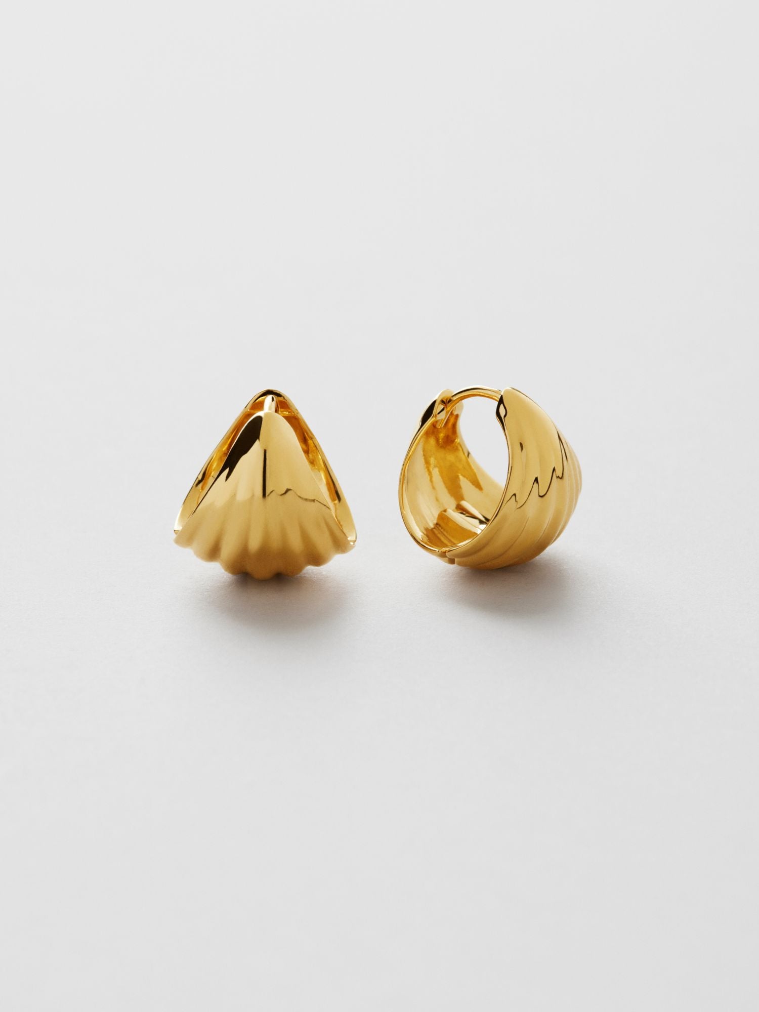 Hoop earrings with a feather-inspired pattern in genuine 925 sterling silver. The gold earrings are plated with genuine 24K gold and have a core of genuine 925 sterling silver. This product is made from 100% recycled silver.
