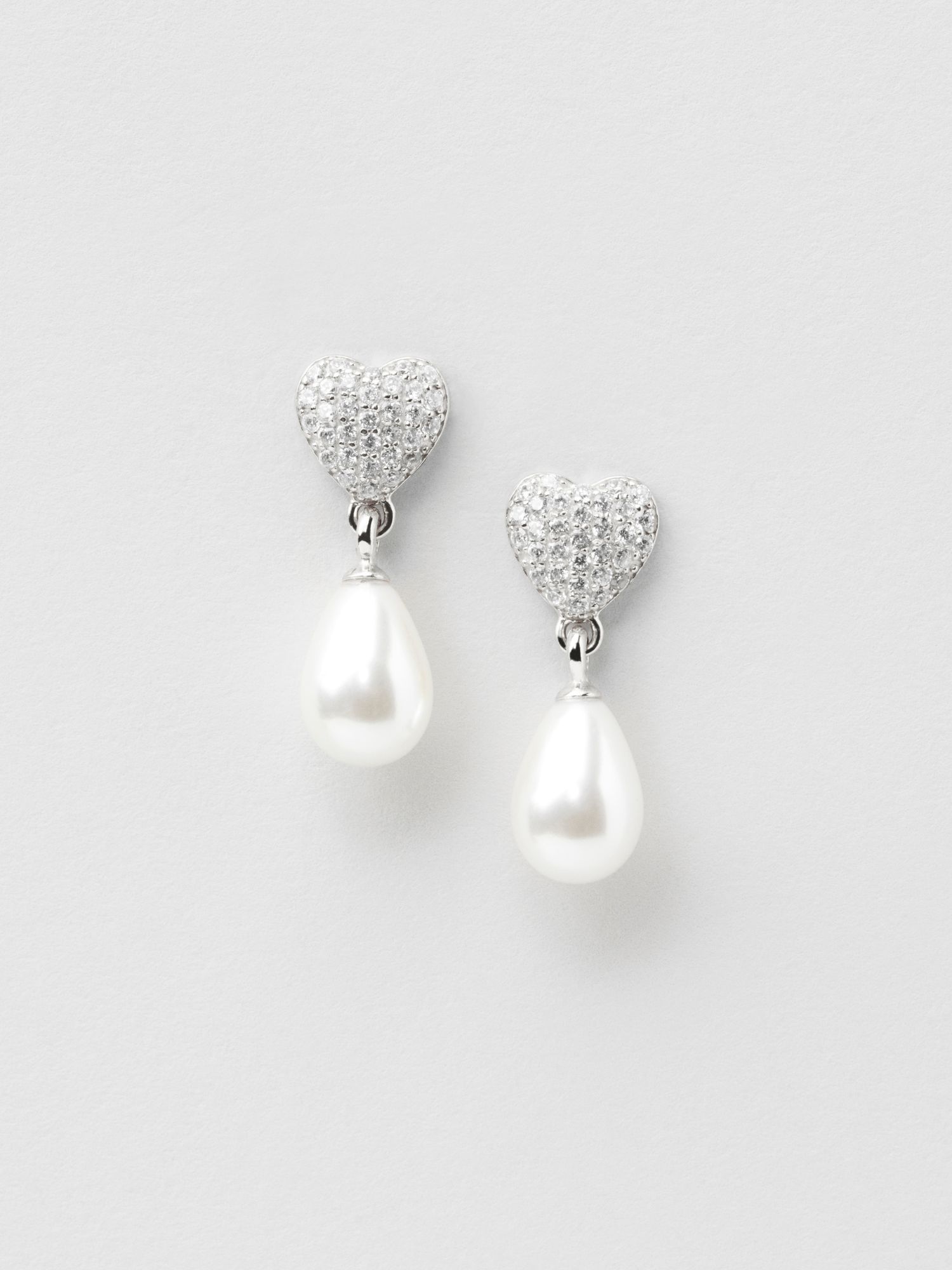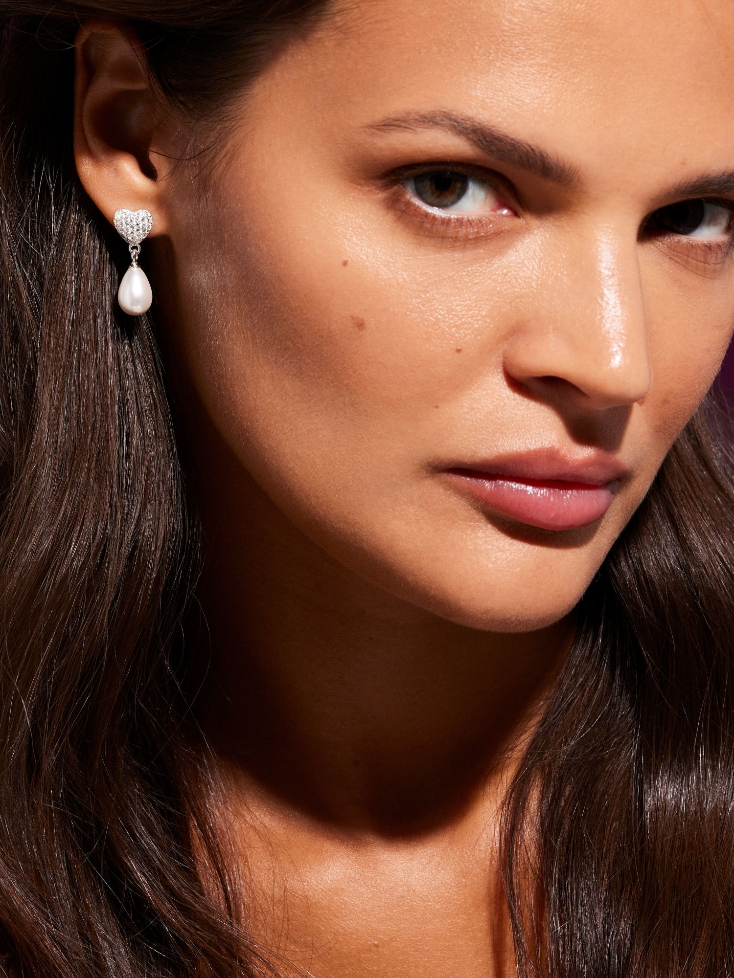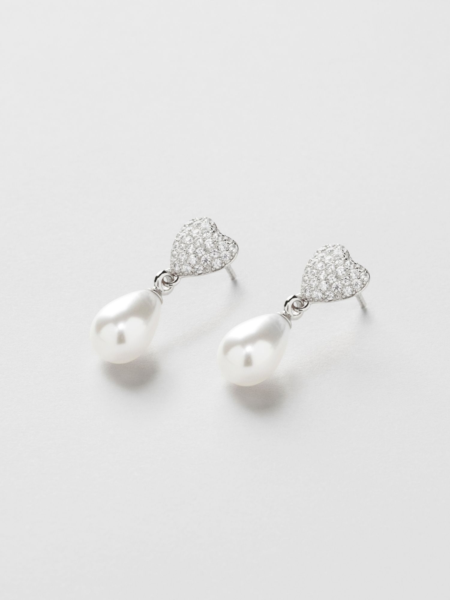 Pearl earrings in genuine 925 sterling silver, with genuine freshwater pearls and clear Cubic Zirconia stones. The gold earrings are plated with genuine 24K gold and have a core of genuine 925 sterling silver. This product is made of 100% recycled silver.