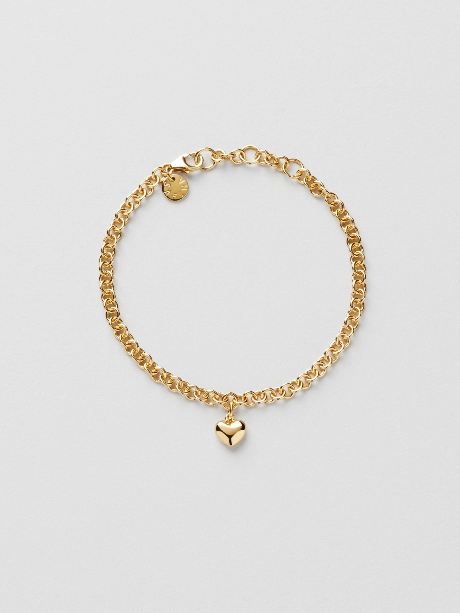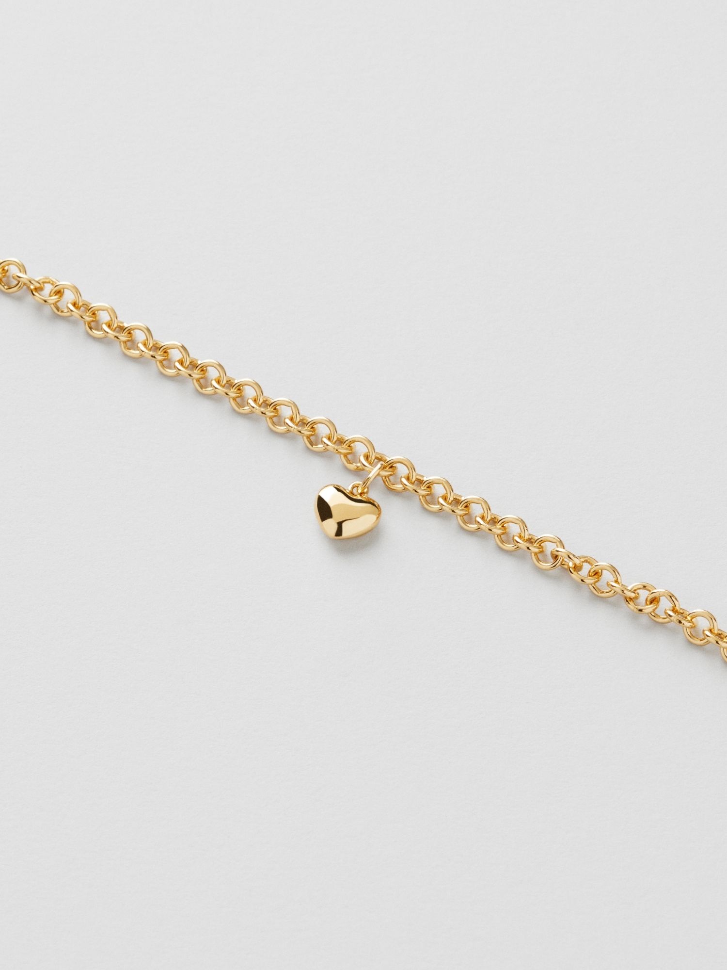 Bracelet with a rolo chain and a puffy heart in genuine 925 sterling silver. The gold bracelet is plated with genuine 24K gold and has a core of genuine 925 sterling silver. This product is made from 100% recycled silver.