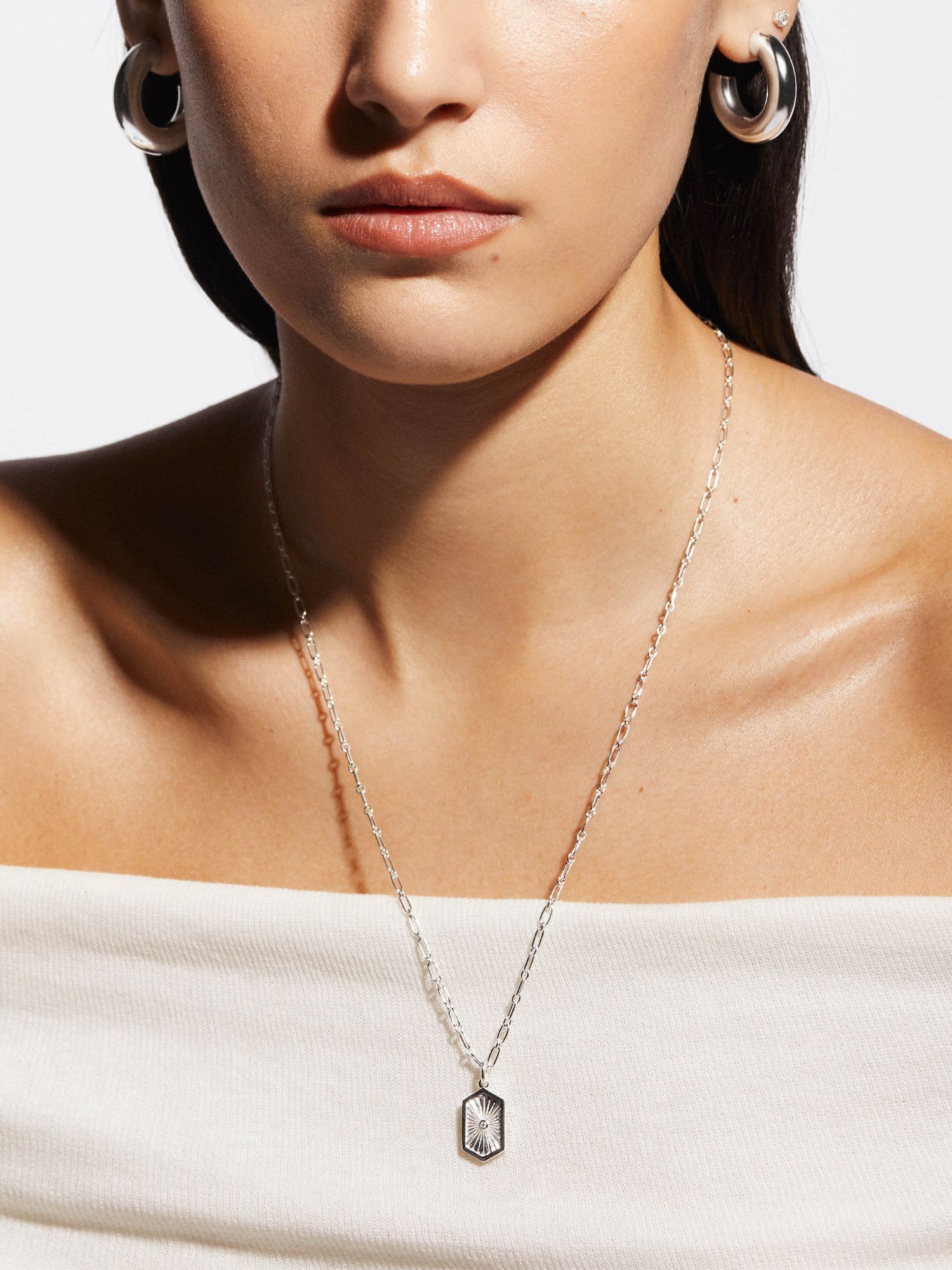 Hexagon shaped necklace in genuine 925 sterling silver, adorned with a round Cubic Zirconia stone. Designed with a longer chain. The gold necklace is gilded with genuine 24K gold and has a core of genuine 925 sterling silver.