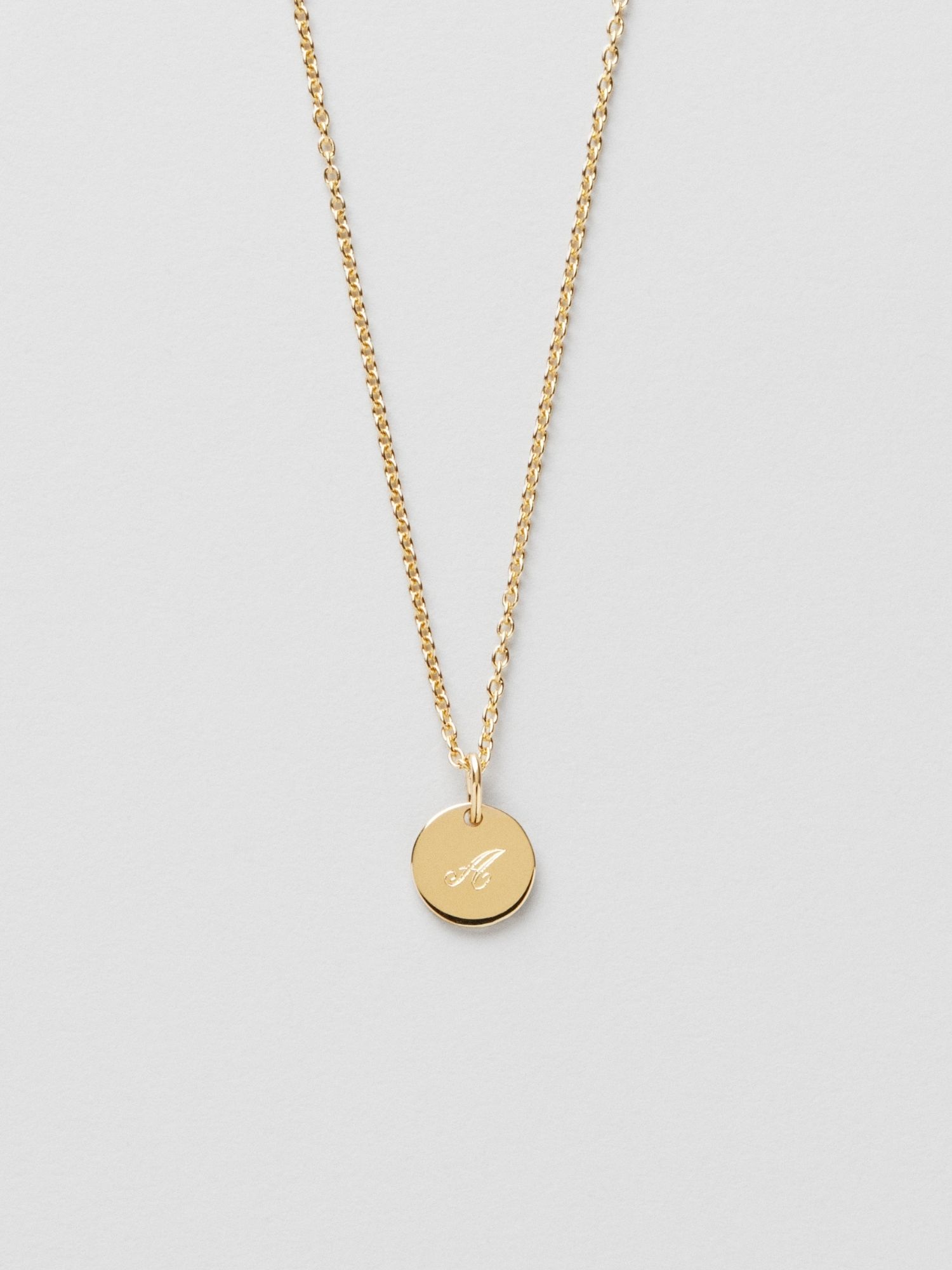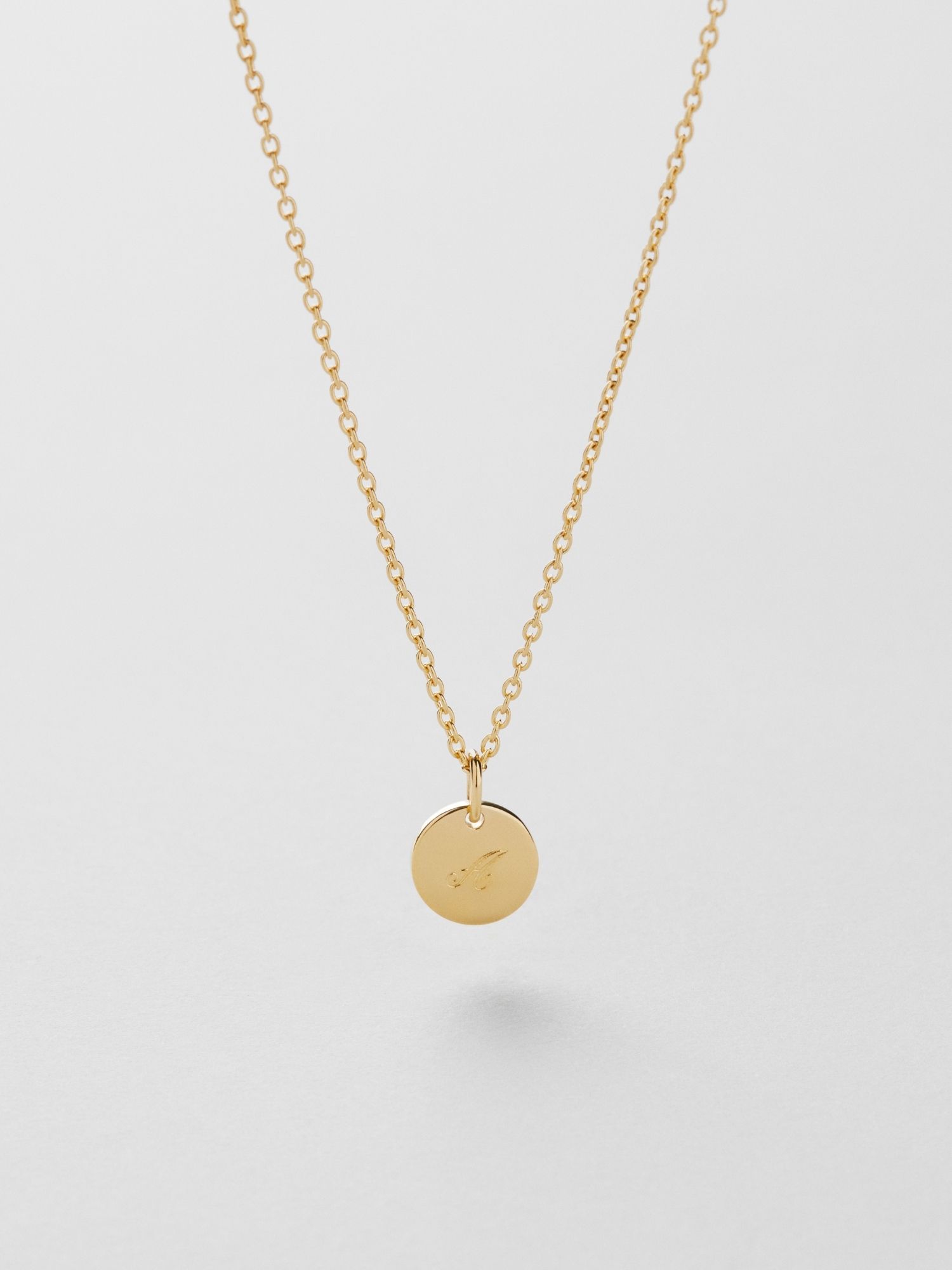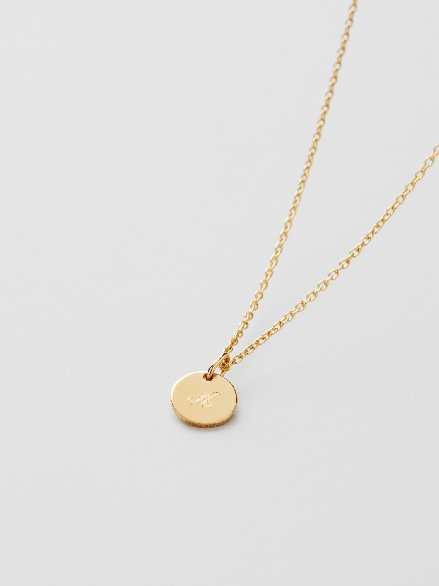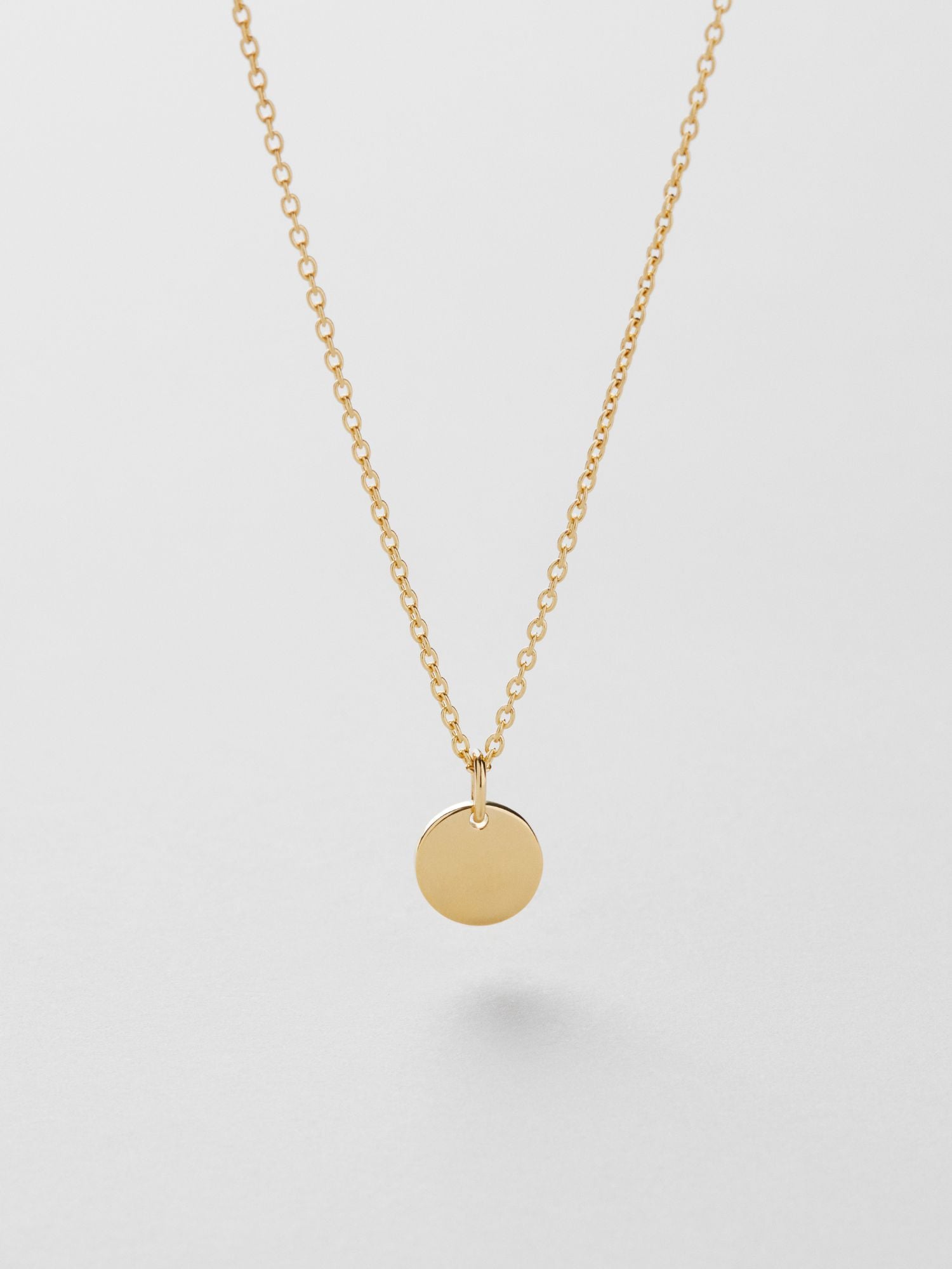 Engravable necklace with a round disc in genuine 925 sterling silver. The gold necklace is plated with 24K genuine gold and has a core of genuine 925 sterling silver. This product is made from 100% recycled silver.