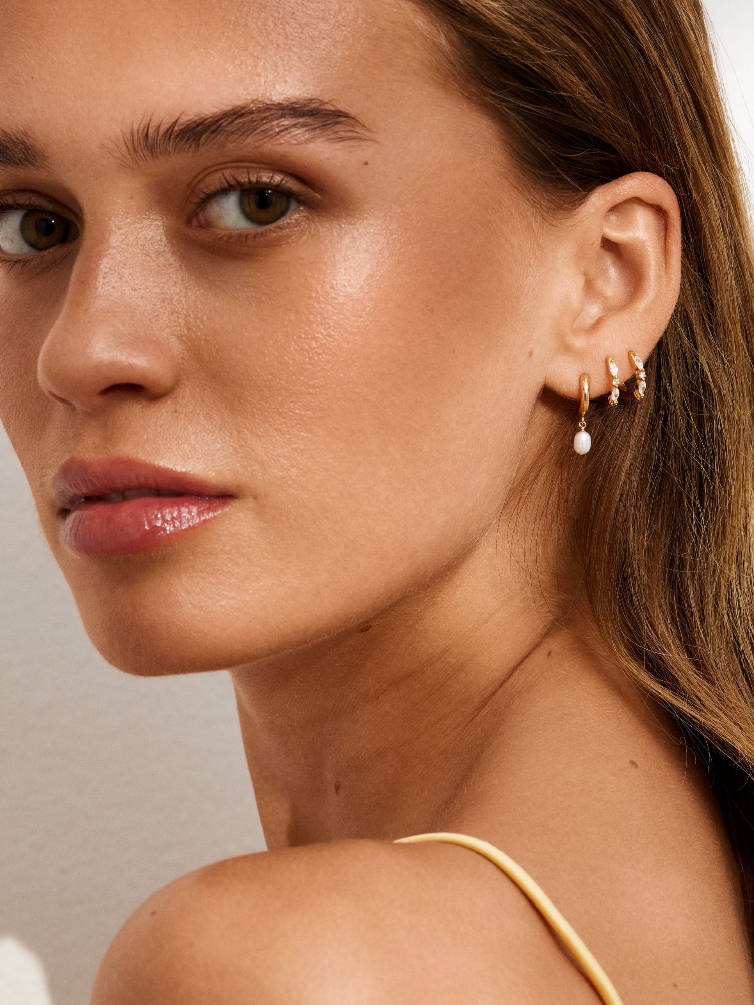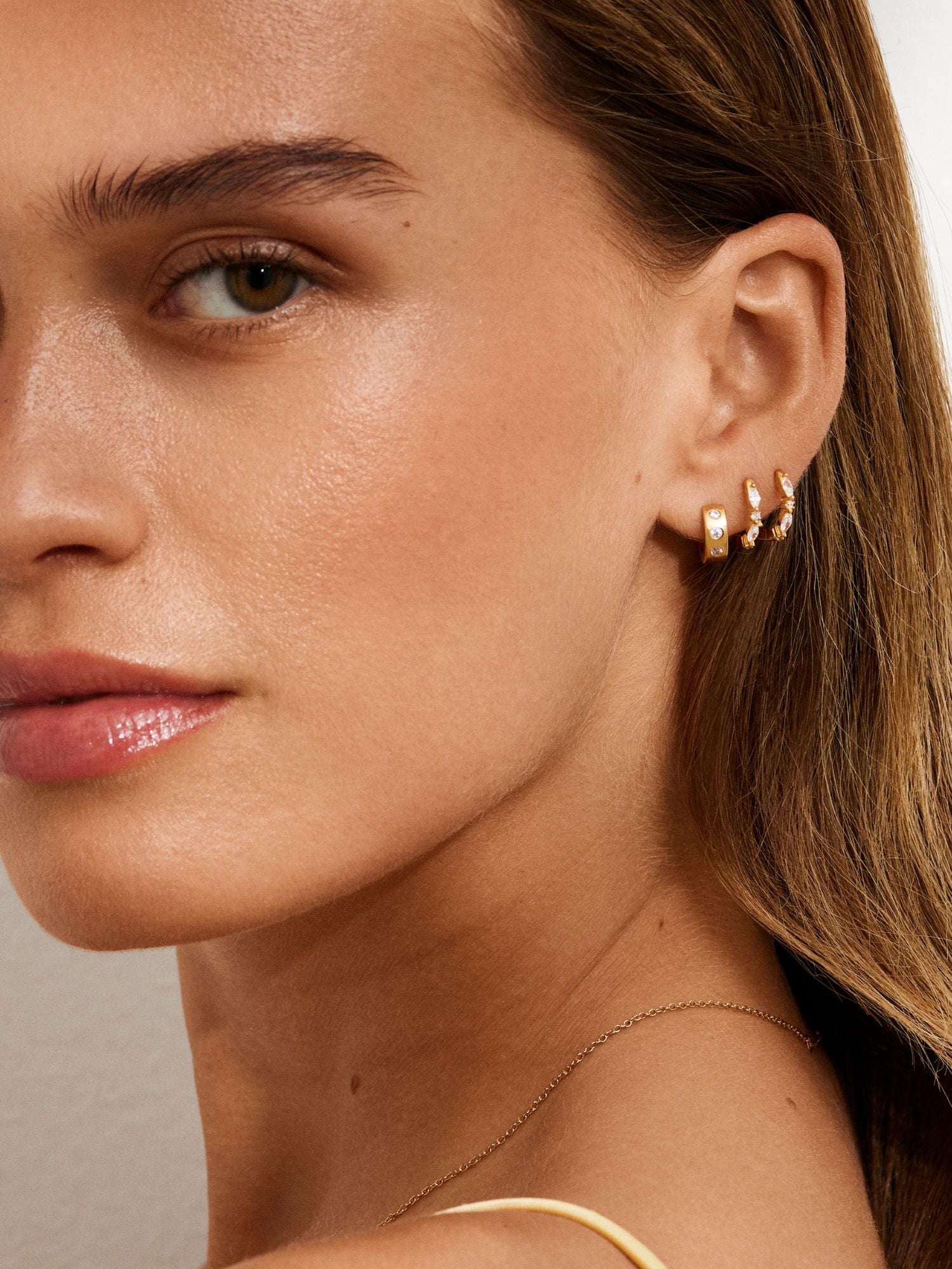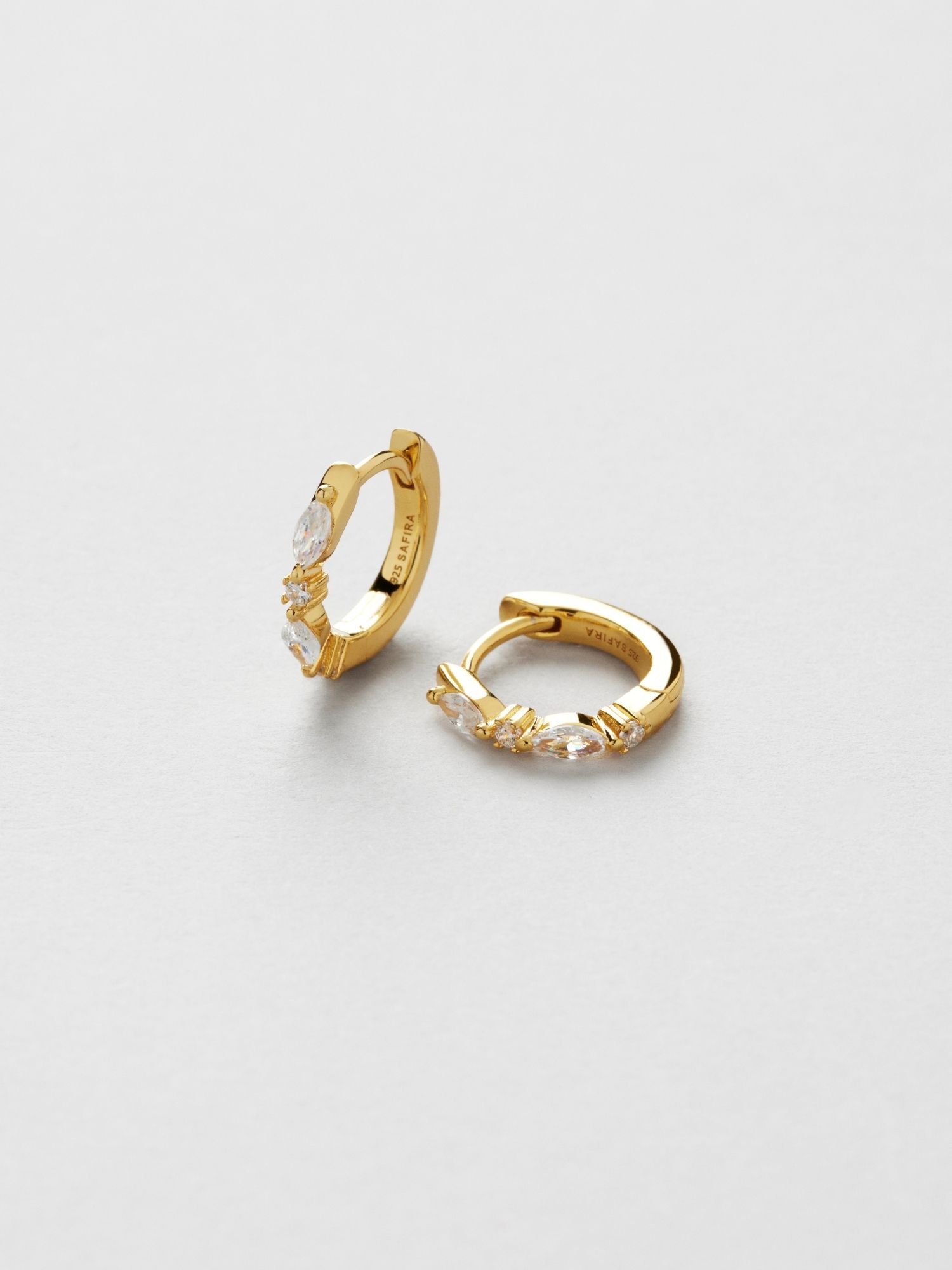 Hoops in genuine 925 sterling silver, adorned with clear Cubic Zirconia stones. The gold earrings are plated with genuine 18K gold and has a core of genuine 925 sterling silver. This product is made from 100% recycled silver.
