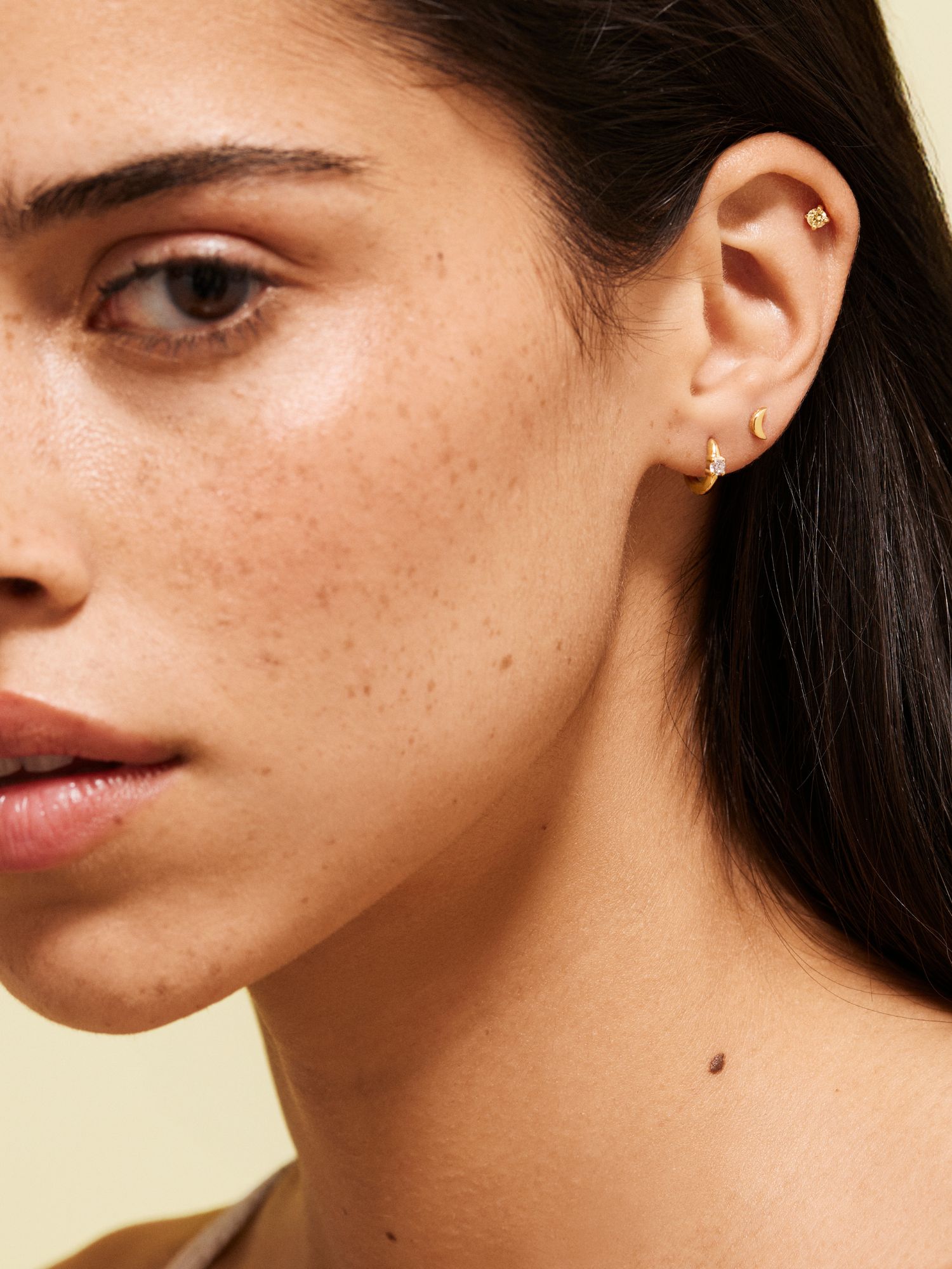 Huggie hoop in genuine 925 sterling silver with a clear Cubic Zirconia stone. The gold jewellery is plated with genuine 24K gold and has a core of genuine 925 sterling silver. This product is 100% recycled silver.
