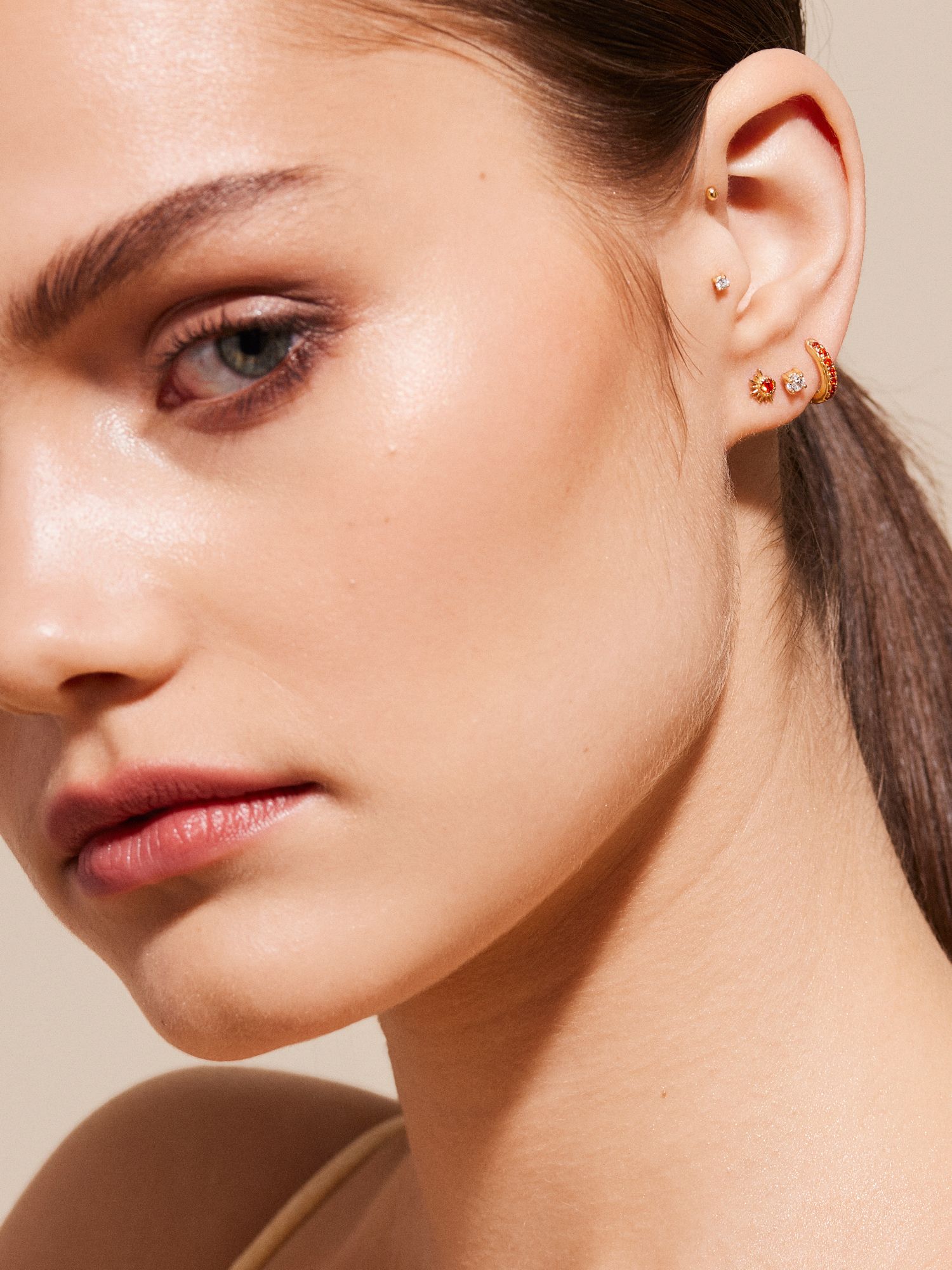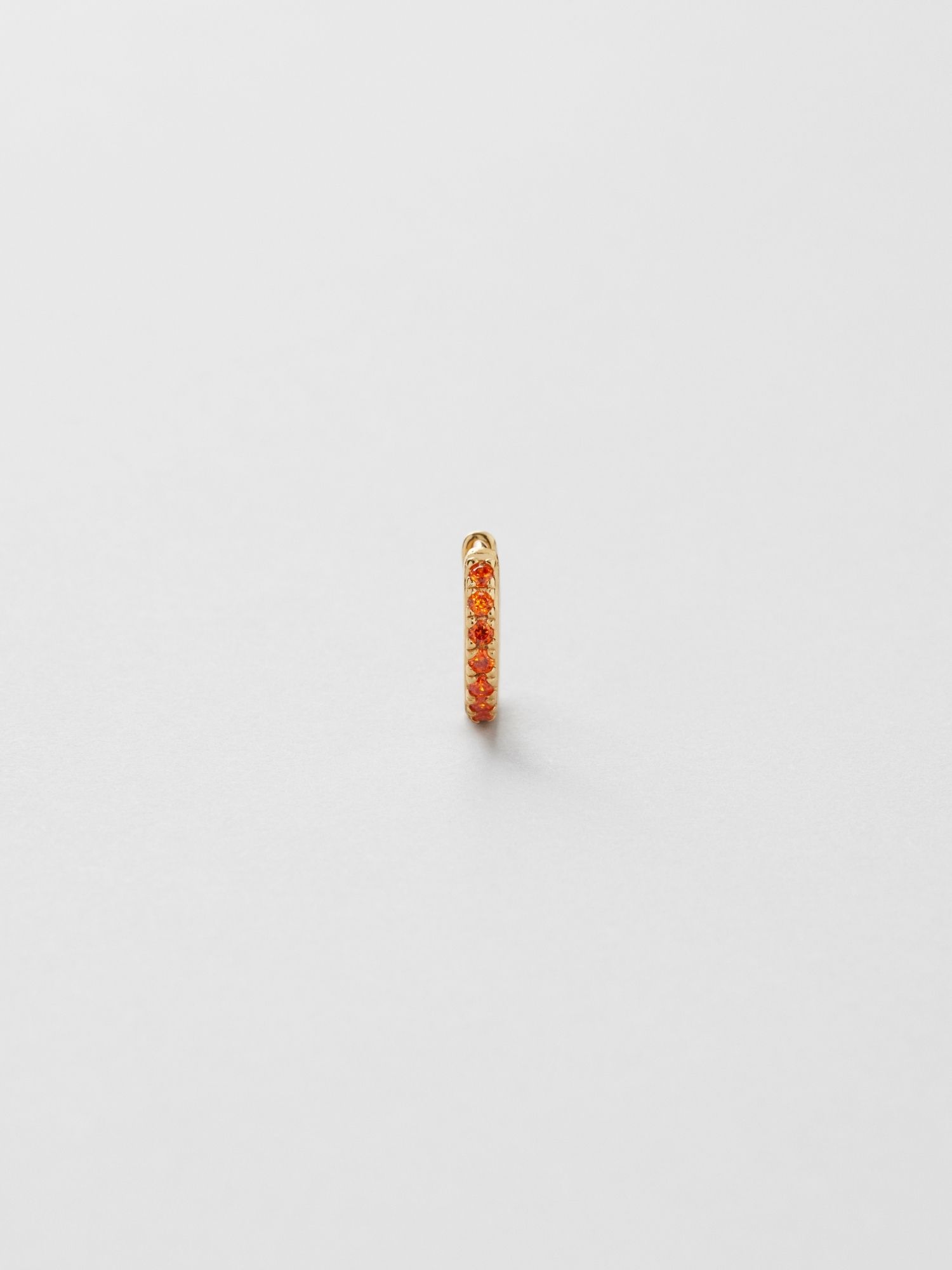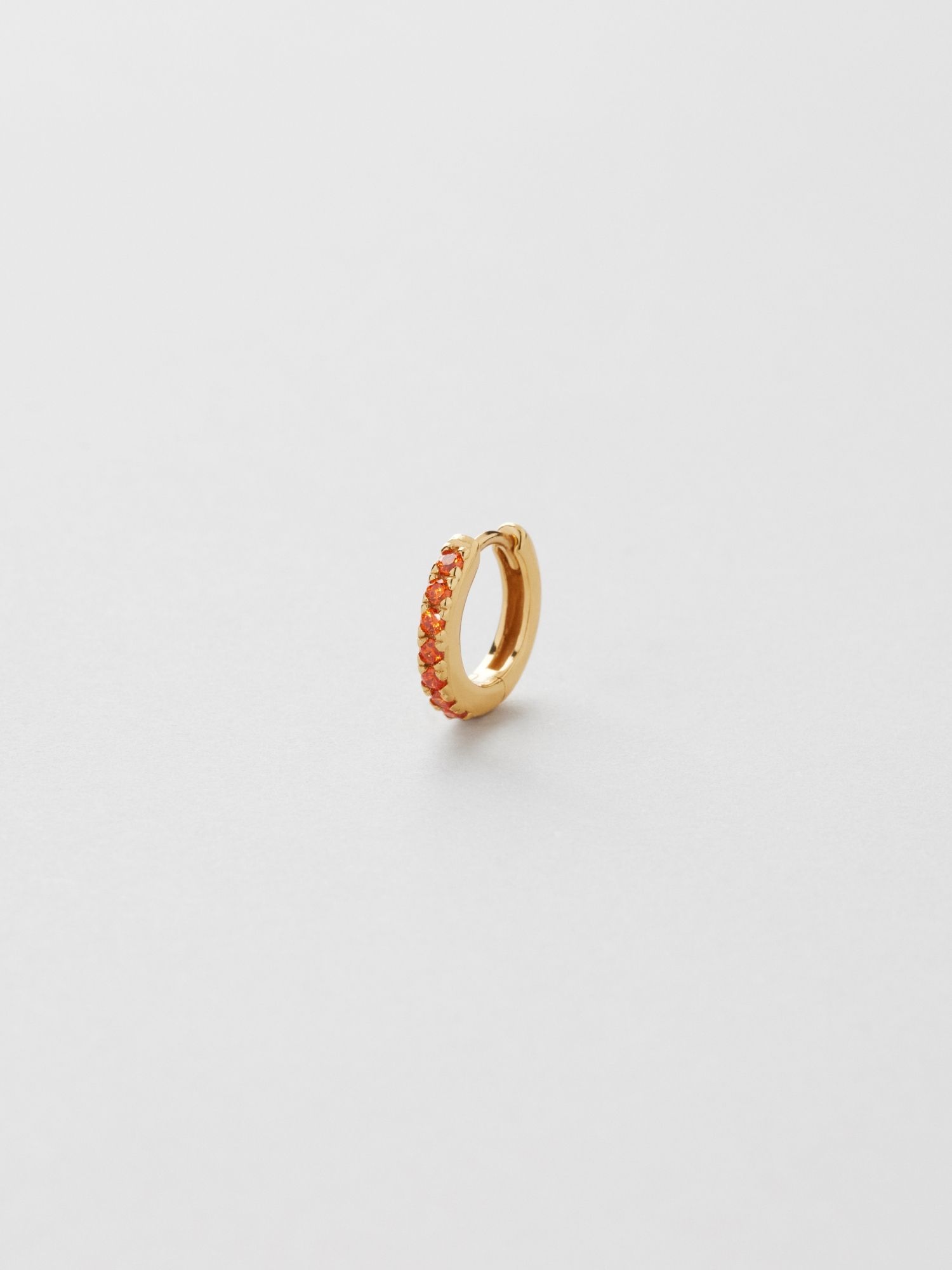 Single hoop earring made of genuine 925 sterling silver, decorated with orange Cubic Zirconia stones. The gold earring is plated with genuine 18K gold and has a core of genuine 925 sterling silver. This product is made from 100% recycled silver.