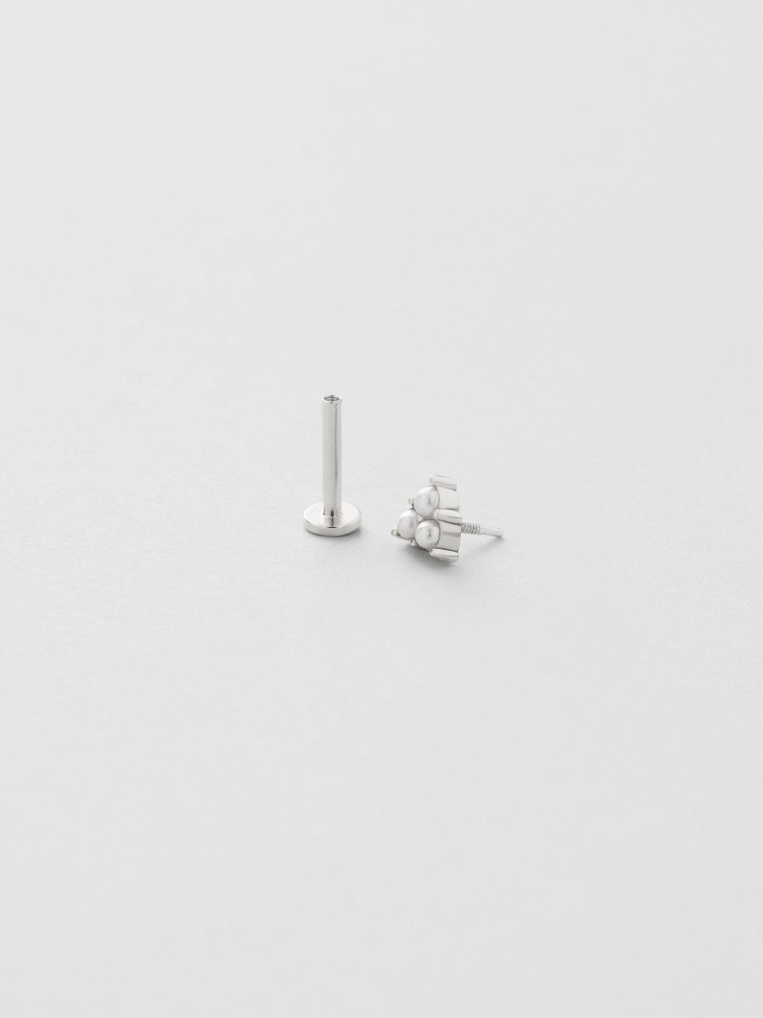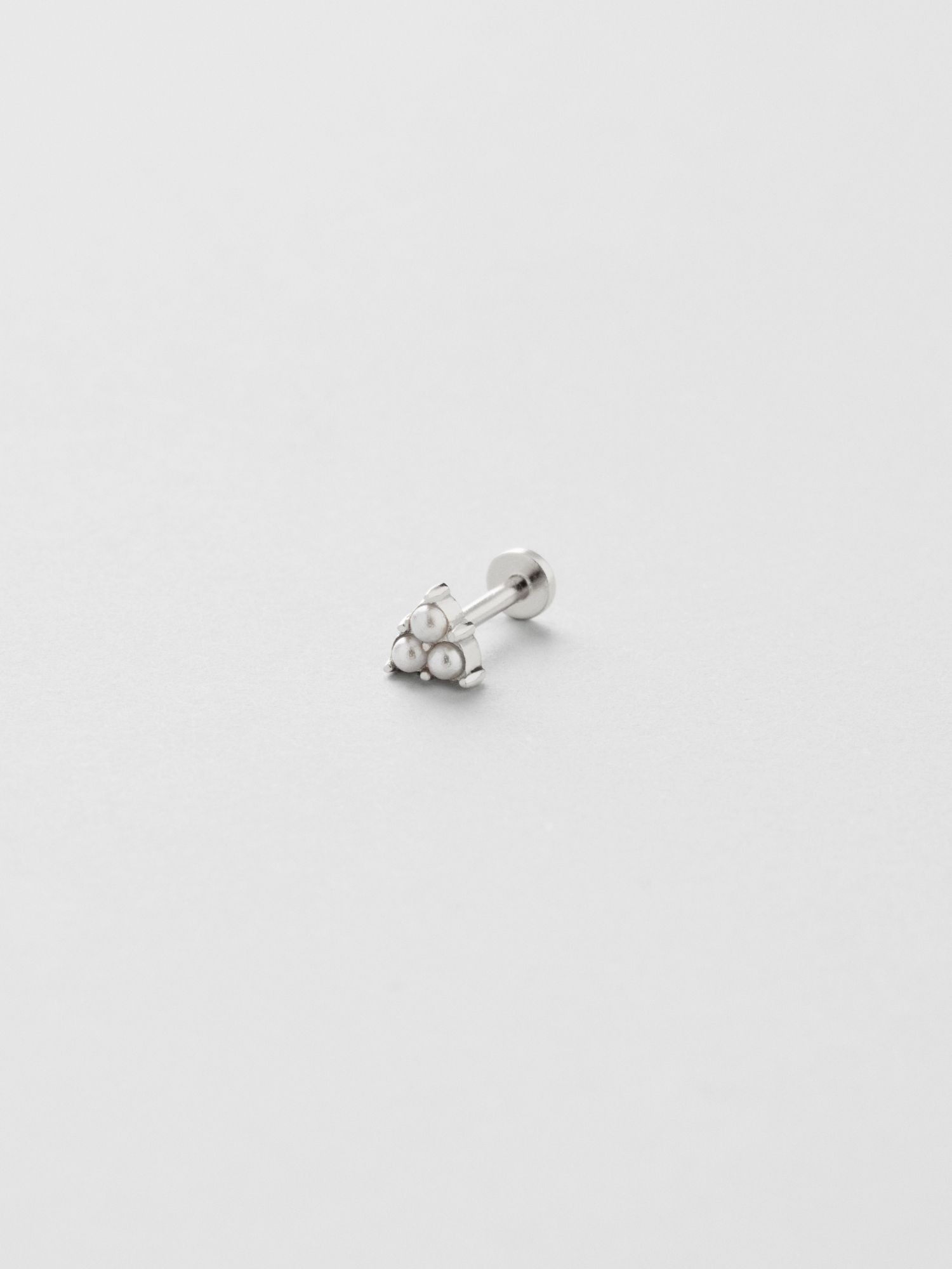 Pearl piercing in genuine 925 sterling silver, decorated with three white synthetic pearls. The gold jewellery is plated with genuine 18K gold and has a core of genuine 925 sterling silver. The bar is made of genuine 925 sterling silver. This product is made of 100% recycled silver. Place the back part of the piercing through the ear from behind and screw it together with the front part of the piercing.