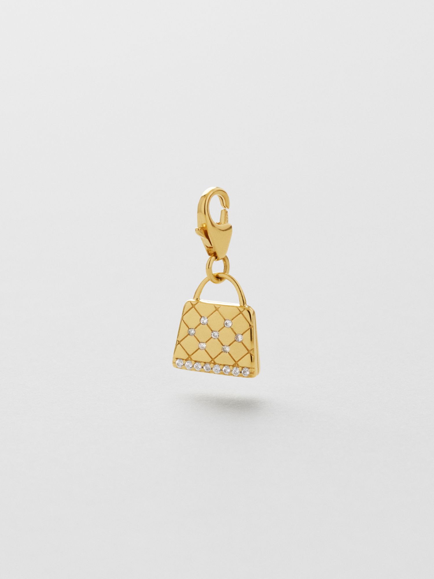 Charm in the shape of a handbag in genuine 925 sterling silver, decorated with clear Cubic Zirconia stones. The gold piece is plated with genuine 24K gold and has a core of genuine 925 sterling silver. This product is made from 100% recycled silver.