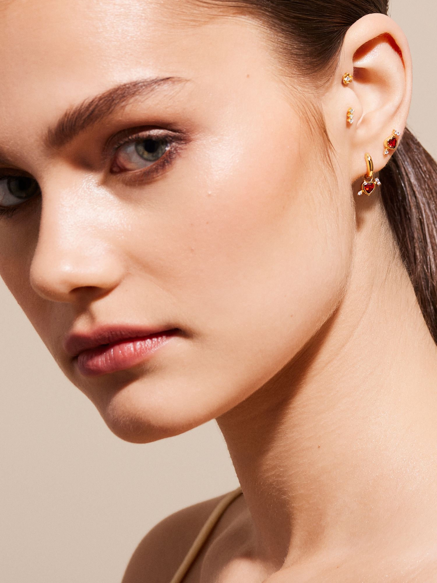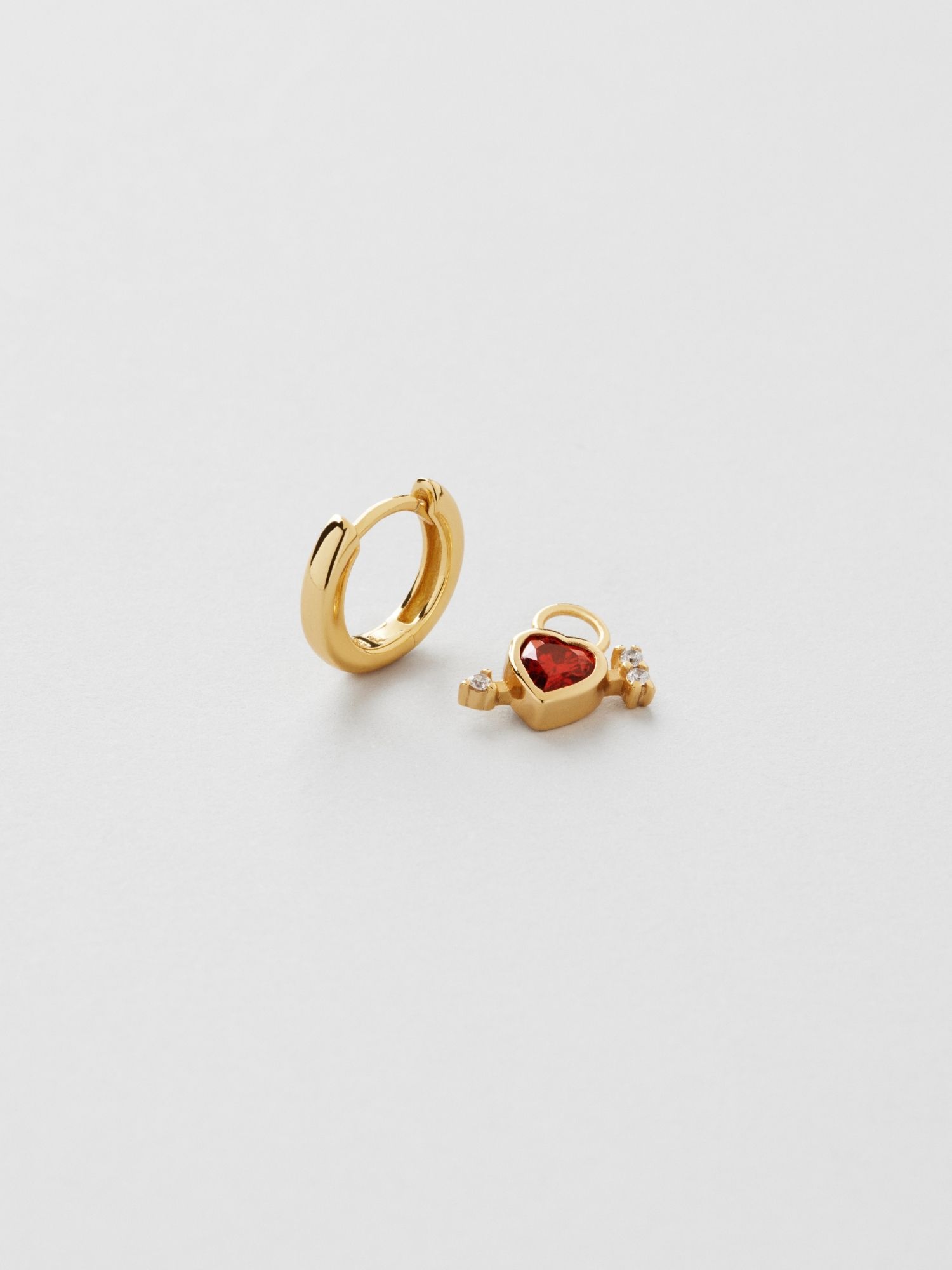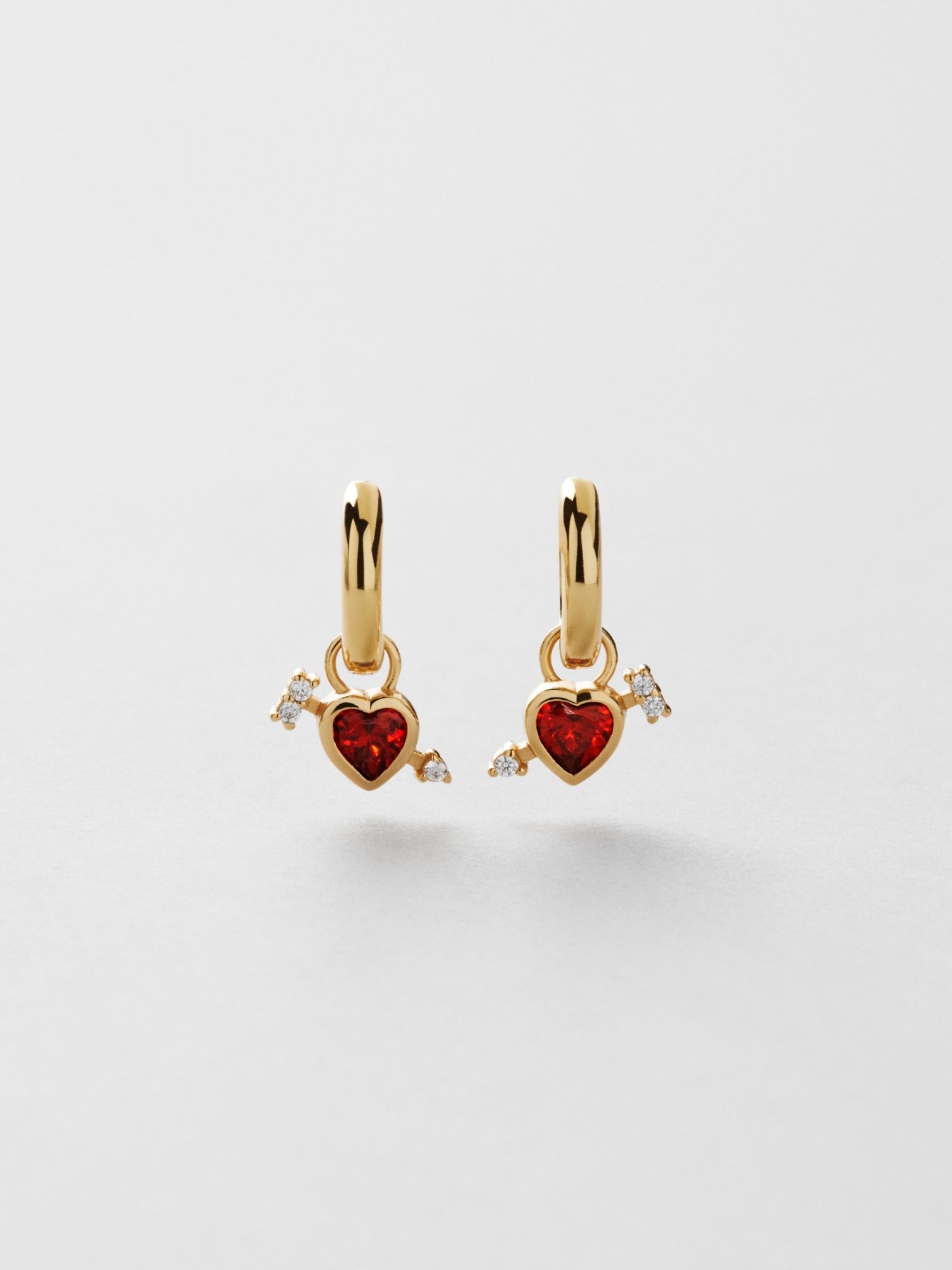 Hoop earrings in genuine 925 sterling silver, designed with red hearts and arrows adorned with clear Cubic Zirconia stones. The gold version is plated with genuine 18K gold and has a core of genuine 925 sterling silver. This product is made from 100% recycled silver.
